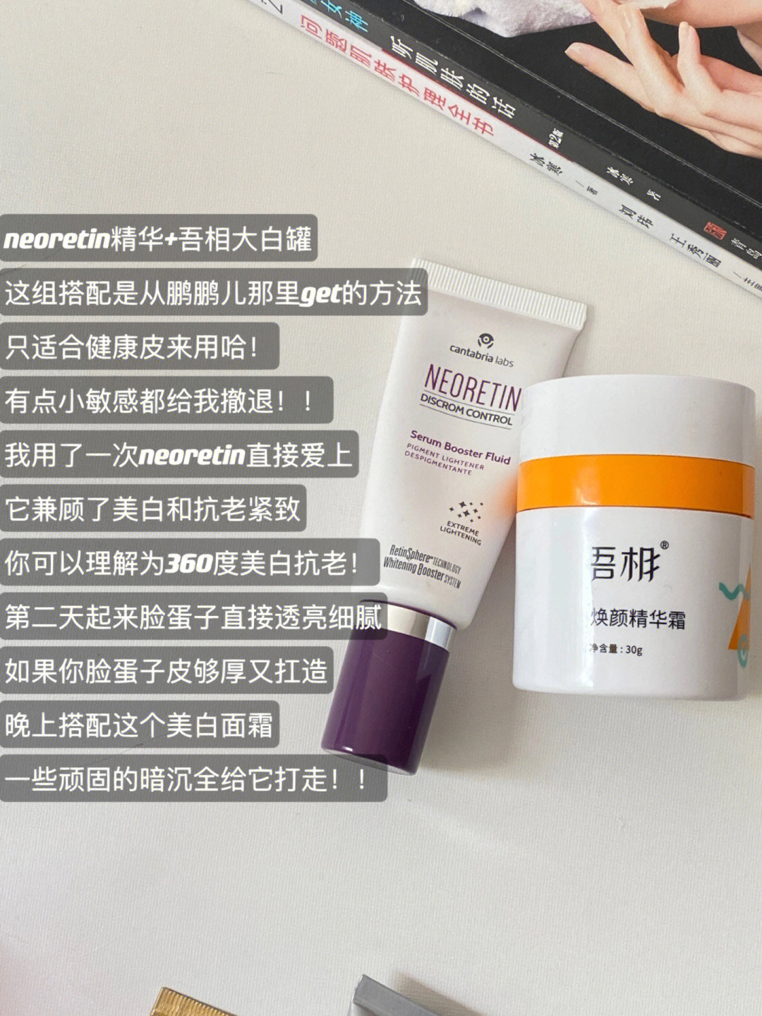 感谢品牌方(吾相)前期的产品试用体验 话说你们对于白的追求真的很猛烈 我也很久没说过白白搭配了!!! 想要白,先做好几个准备再来看我的护肤搭配,不然都是白费! 1.坚持良好的作息2.坚持足量的美白护肤3.做好防晒工作4.多运动提高自身身体代谢 ok我们来看护肤这一块,其他希望你可以坚持住! 1⃣️急性子没办法坚持很久就想白的健康城墙皮 neoretin精华+吾相大白罐 这个精华是含a醇和hpr的双...