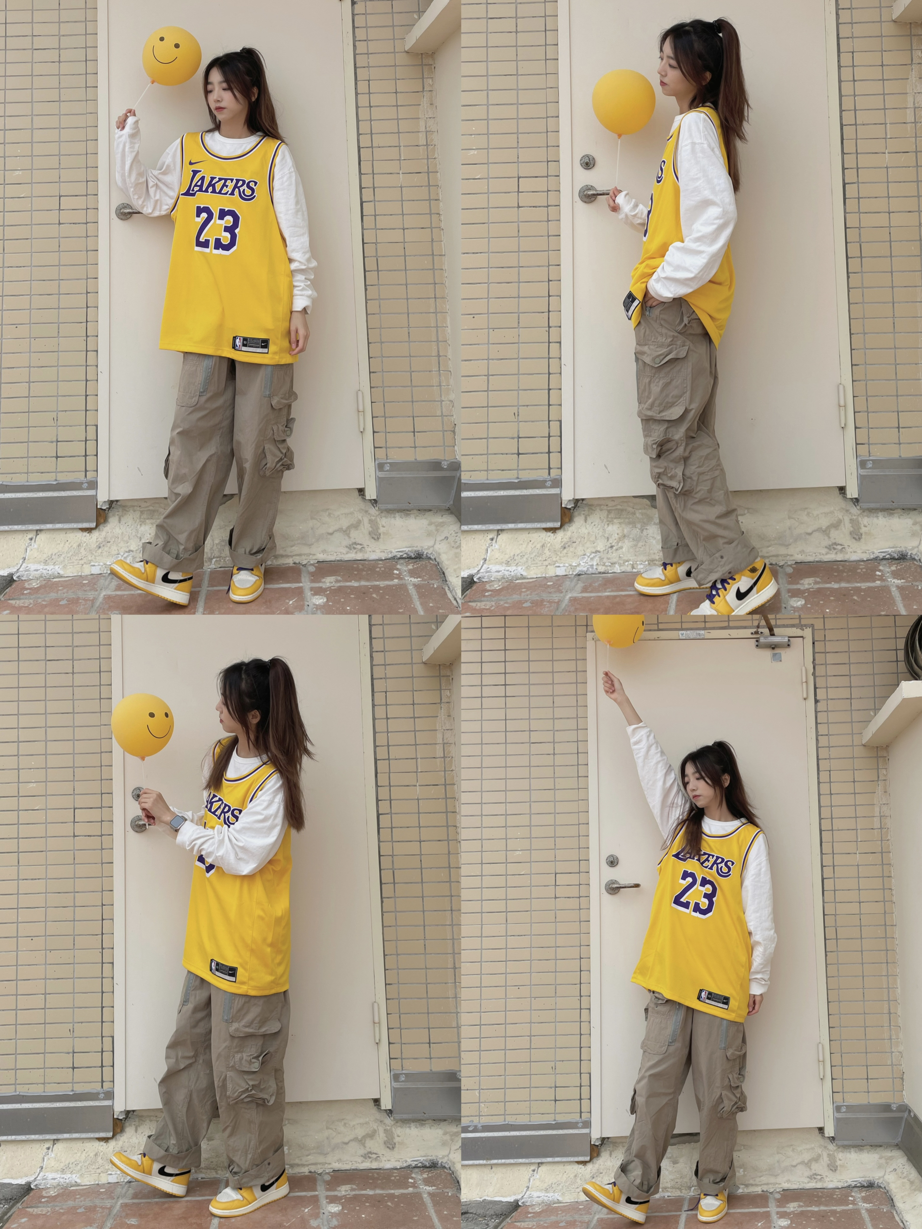 👧:168/44 🌟Look1⃣️: 👔:nike球衣23号(詹迷冲就完啦!168/44喜欢oversize版型,入了L码有点儿长,夏天喜欢搭配短裤穿,喜欢搭配运动裤或者是工装裤的友友们,可以入小一码的 这个黄紫配色太绝绝子了,显白第一名🥇,球衣搭配的空间很大,里面搭配卫衣也很好看!) 👖:pit a pat(一条百搭的工装裤,喜欢它的大口袋设计,军绿色它的搭配空间比较大,宽松版型,无性别穿搭...