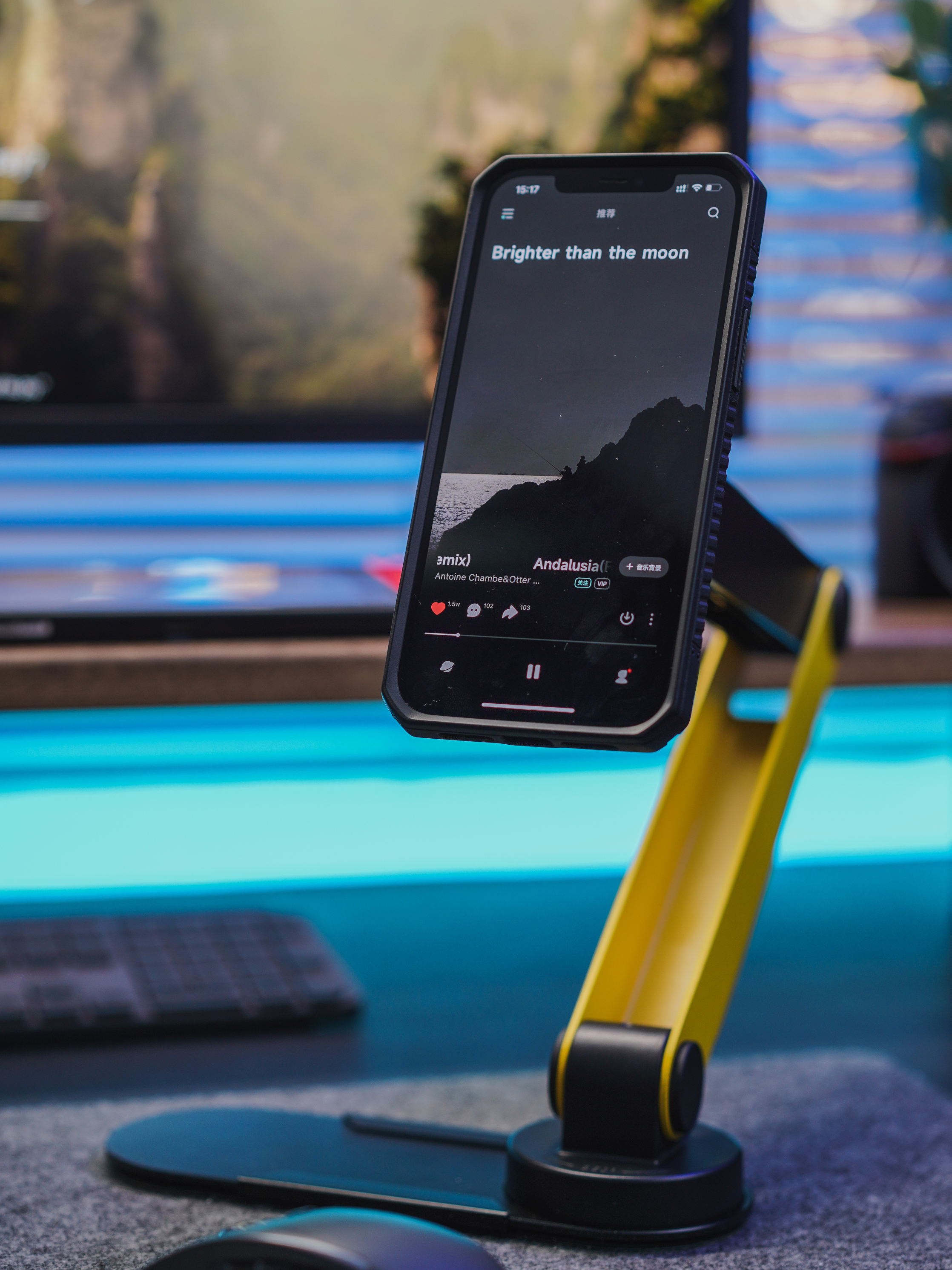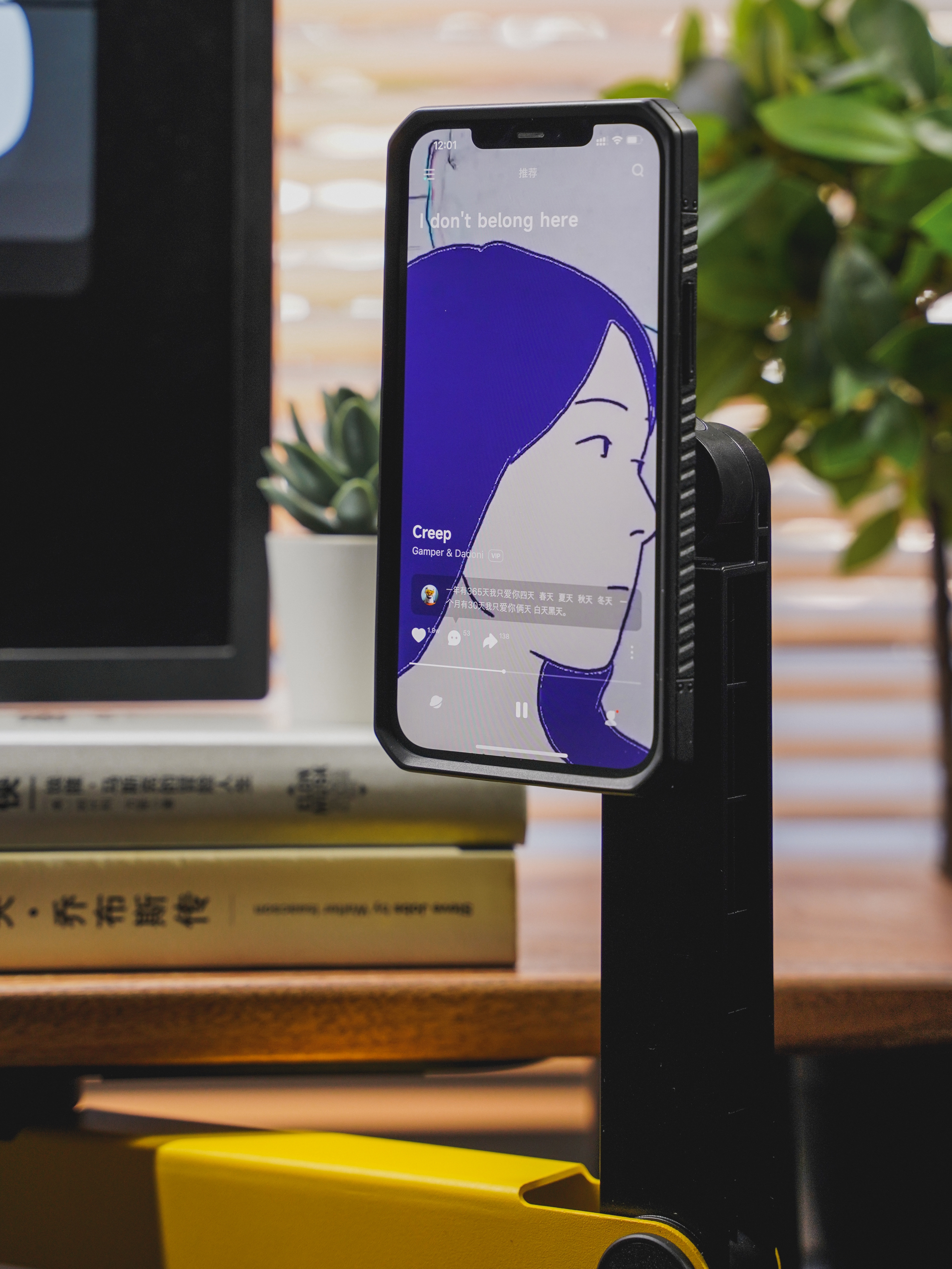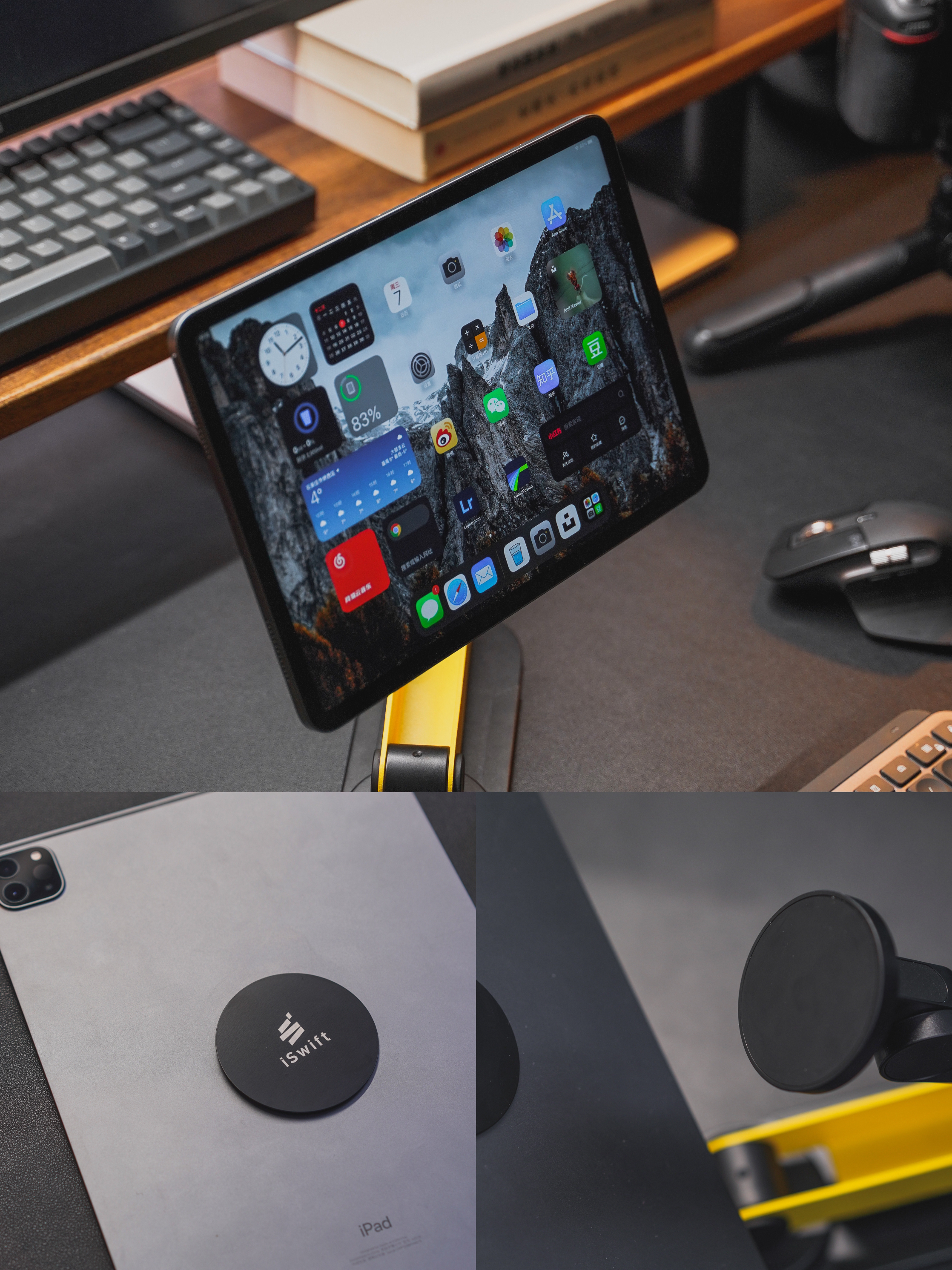 平板与手机是桌面上高频使用的产品,我一般会放置支架使用。尤其是平板,不管是修图还是刷剧,放在支架上使用,观看角度会更舒服,避免了长期低头使用产生的肩颈酸痛问题。在选择平板支架时,结构稳定最重要,尤其是悬停时的稳定状态。现在用的这款平板支架采用悬停自锁转轴技术,区别于常见的螺丝拧紧方式。悬停静止后轴内齿轮自动锁死,稳固不下坠,使用体验非常好。在连接平板处采用MagSafe磁吸方式,这应该是市面上首款支持iPad的磁吸支架,同样适用于带MagSafe的iPhone使用。钕铁硼磁铁磁力强劲,即粘即用,拿取方便。磁吸的方式也比放置式和夹子式支架要更稳更方便。在带底座版上,它巧妙的采用分离式设计,底座可以固定在家里不同位置,多买几个底座,就可以一拔一插自由移动了。我把一个底座固定在桌面增高架下面,不用时就可以隐藏收纳起来,平时把iPhone吸在上面听歌切歌使用很方便。