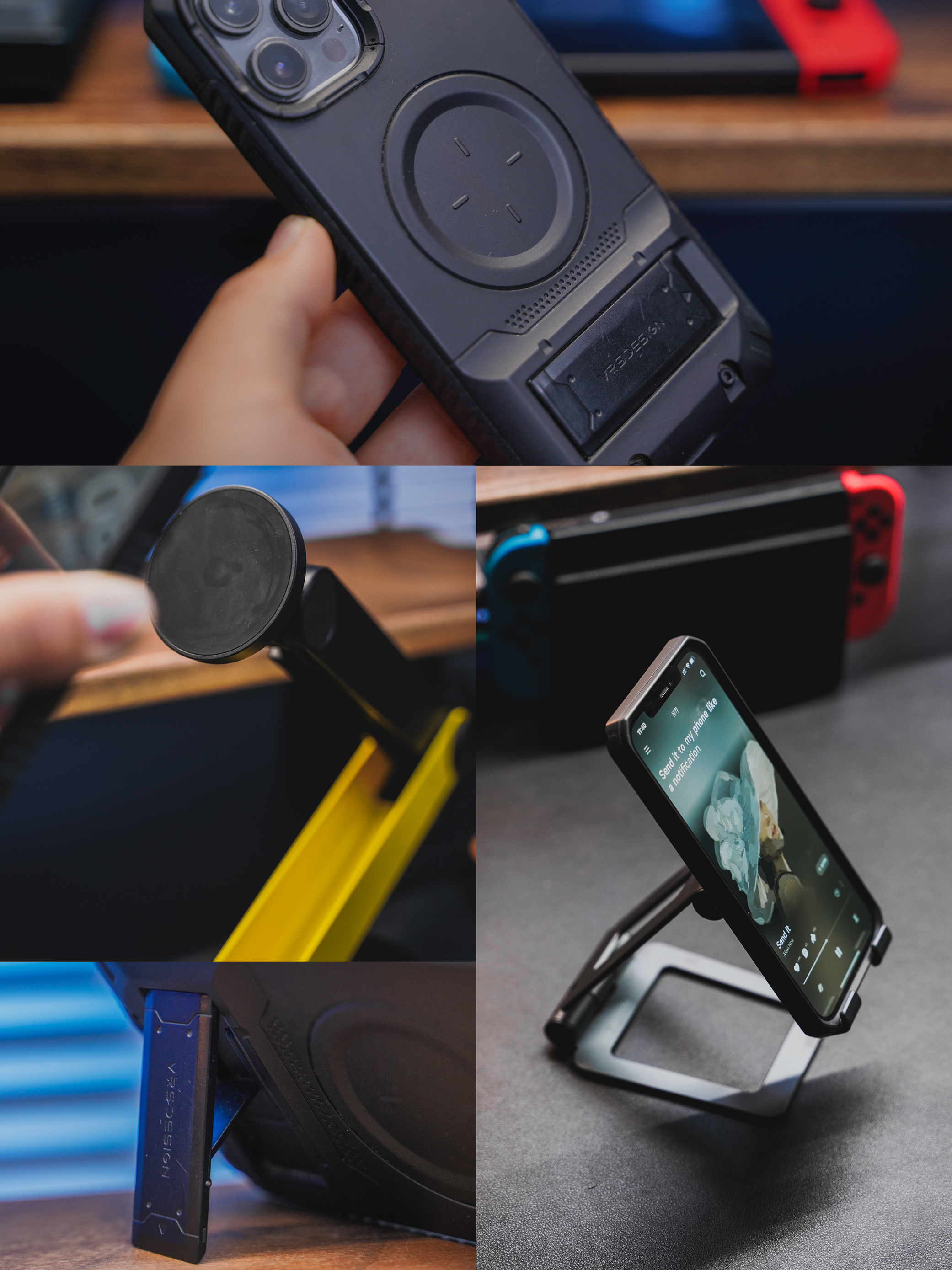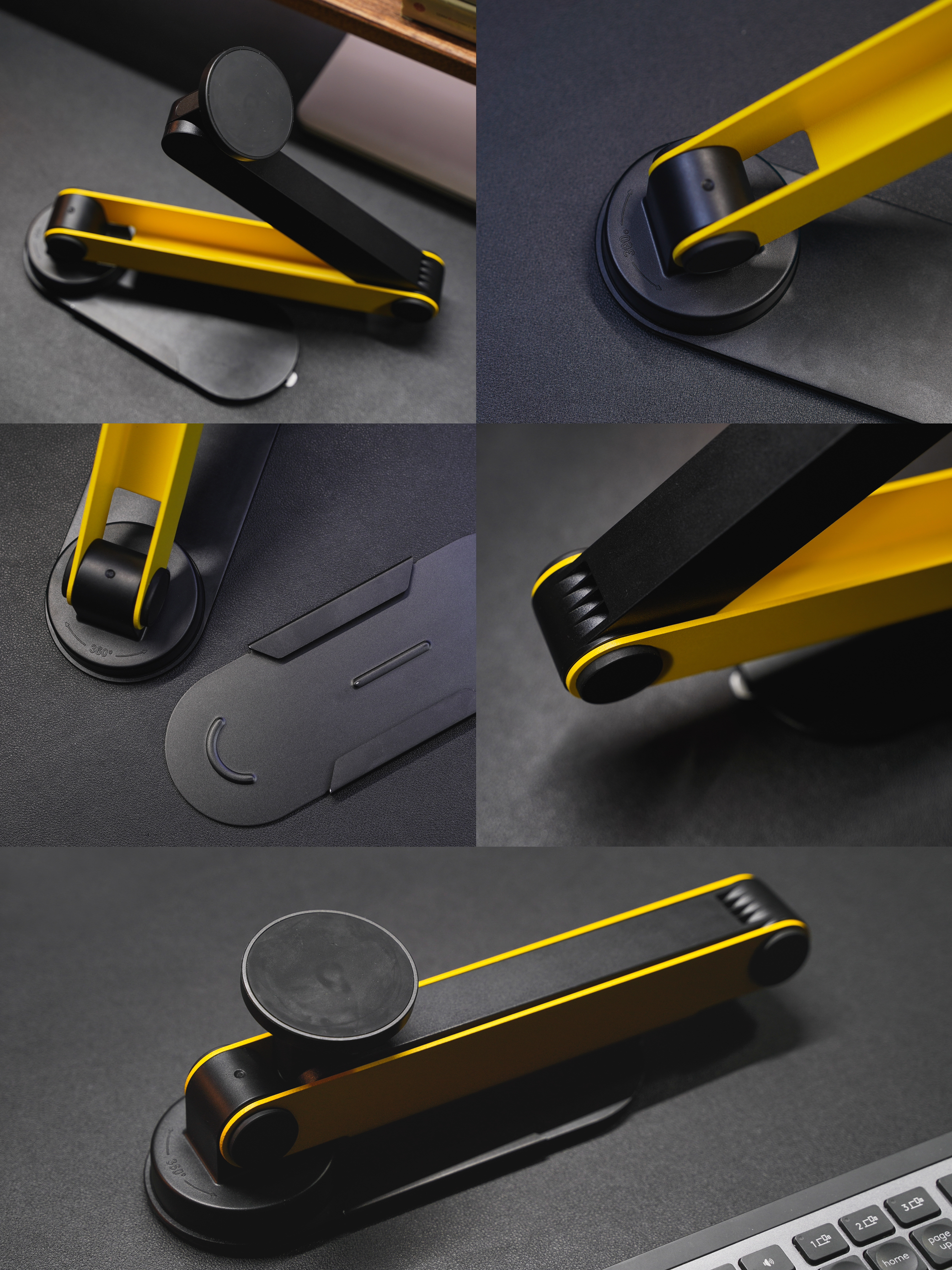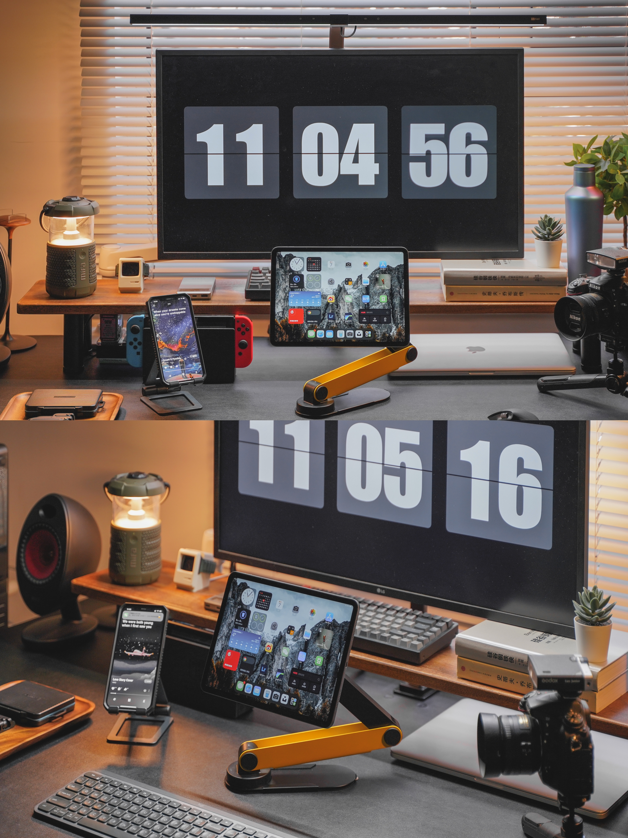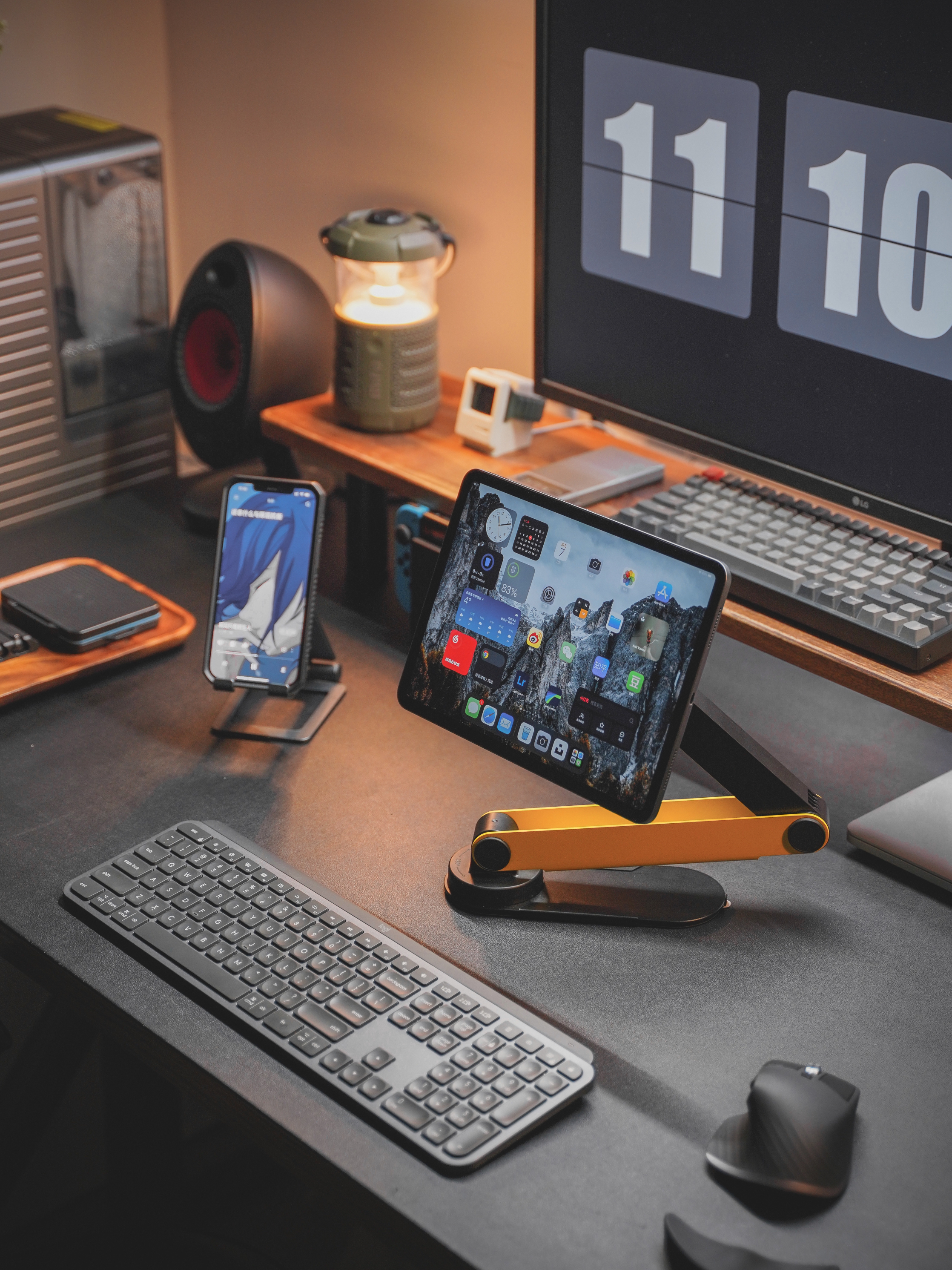 平板与手机是桌面上高频使用的产品,我一般会放置支架使用。尤其是平板,不管是修图还是刷剧,放在支架上使用,观看角度会更舒服,避免了长期低头使用产生的肩颈酸痛问题。在选择平板支架时,结构稳定最重要,尤其是悬停时的稳定状态。现在用的这款平板支架采用悬停自锁转轴技术,区别于常见的螺丝拧紧方式。悬停静止后轴内齿轮自动锁死,稳固不下坠,使用体验非常好。在连接平板处采用MagSafe磁吸方式,这应该是市面上首款支持iPad的磁吸支架,同样适用于带MagSafe的iPhone使用。钕铁硼磁铁磁力强劲,即粘即用,拿取方便。磁吸的方式也比放置式和夹子式支架要更稳更方便。在带底座版上,它巧妙的采用分离式设计,底座可以固定在家里不同位置,多买几个底座,就可以一拔一插自由移动了。我把一个底座固定在桌面增高架下面,不用时就可以隐藏收纳起来,平时把iPhone吸在上面听歌切歌使用很方便。