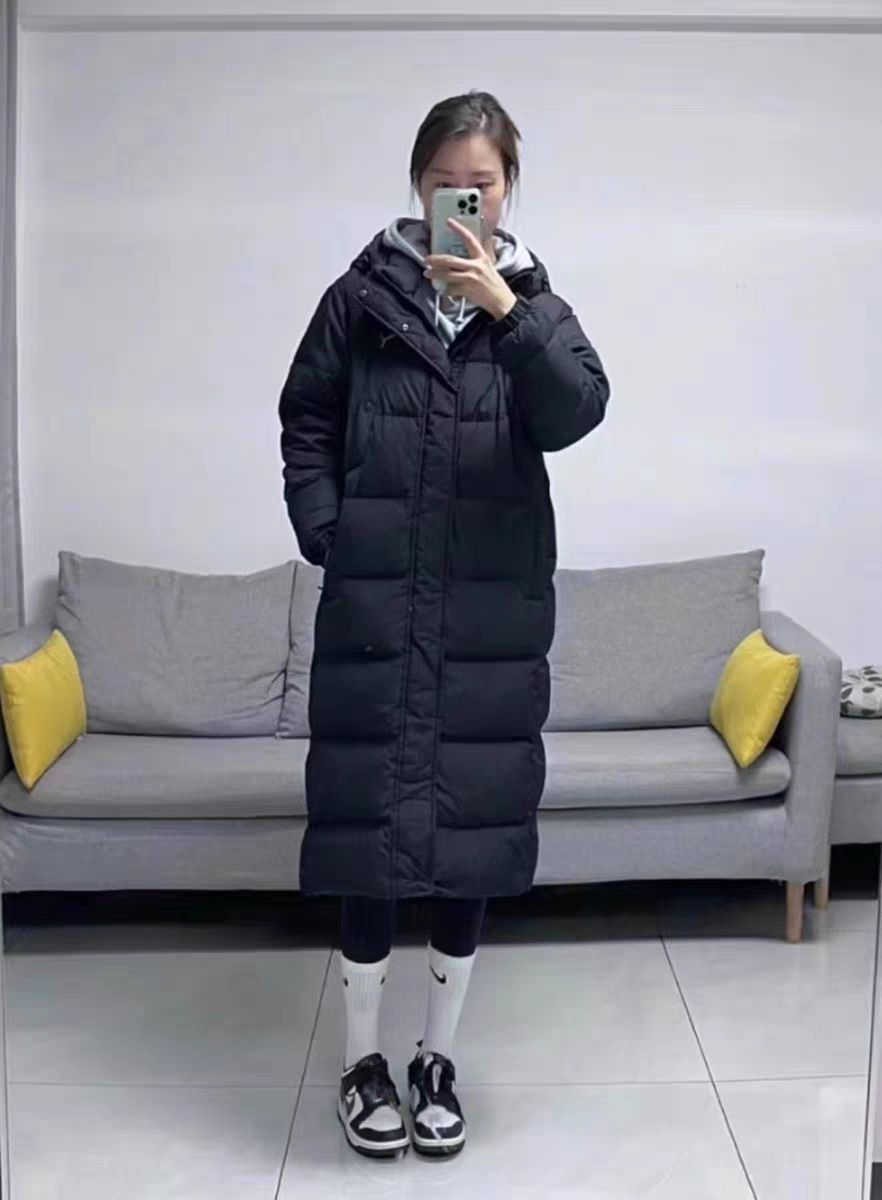 穿搭公式:连帽羽绒服+打底裤+duck 这款羽绒服填充物很饱满,整体重量在长款羽绒服中较轻,所以冬天很保暖,一点都不冷 但是体型较瘦的姐妹不建议入手,如果里面穿的太薄,会有风进去