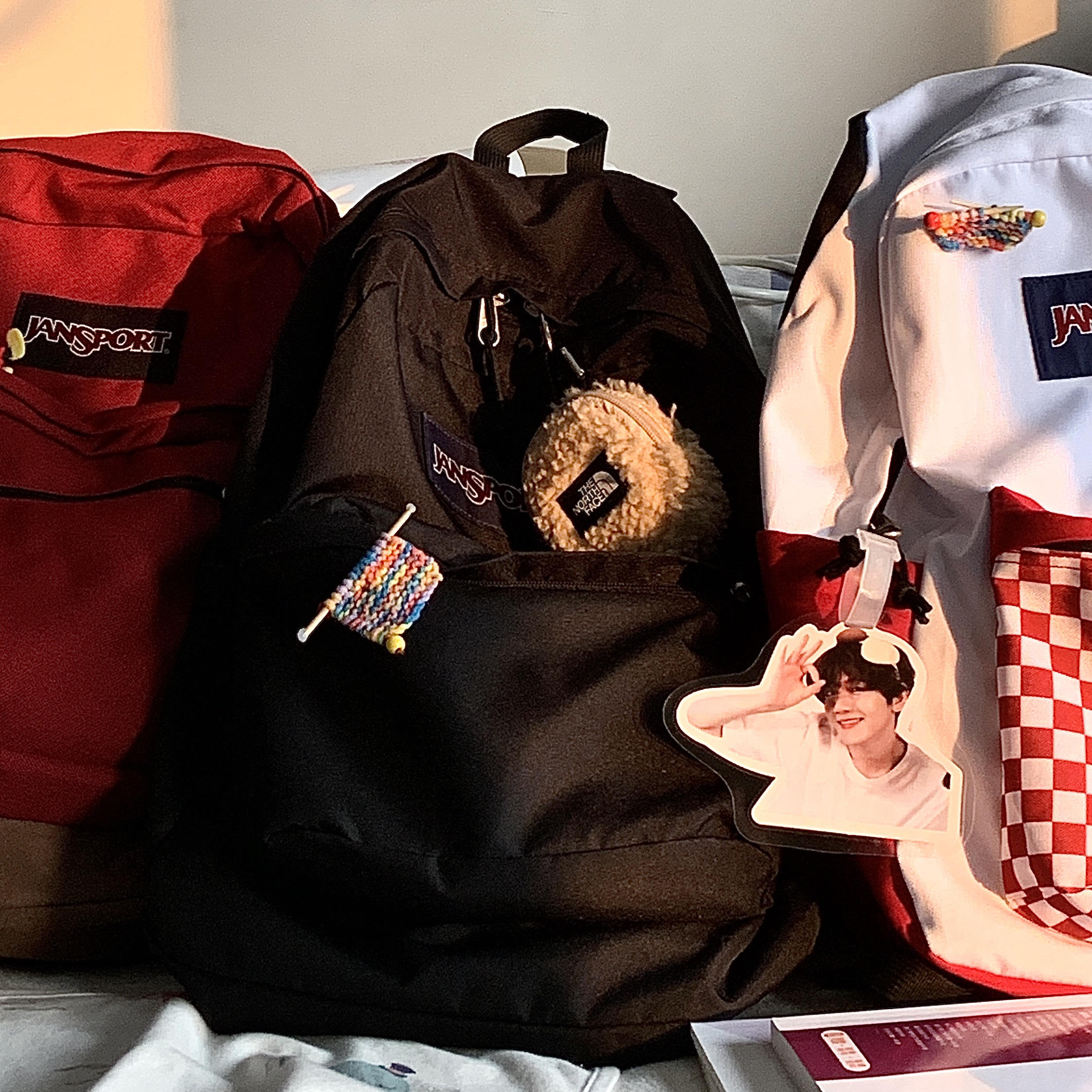 大火的jansport在学校经常撞包😭 那就拉上好朋友挂上配饰! 被不一样的书包🎒! (质量真的好好,从高中背到了大学)