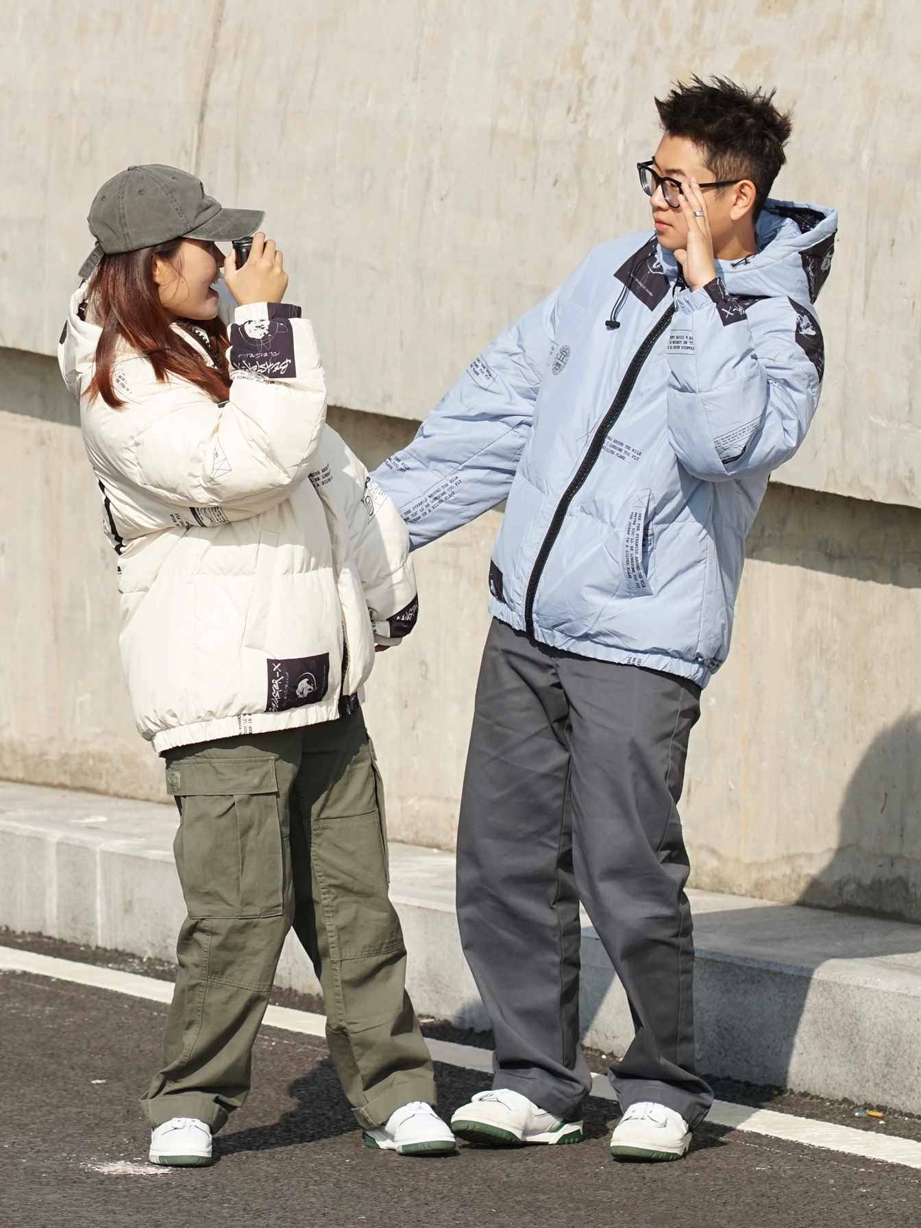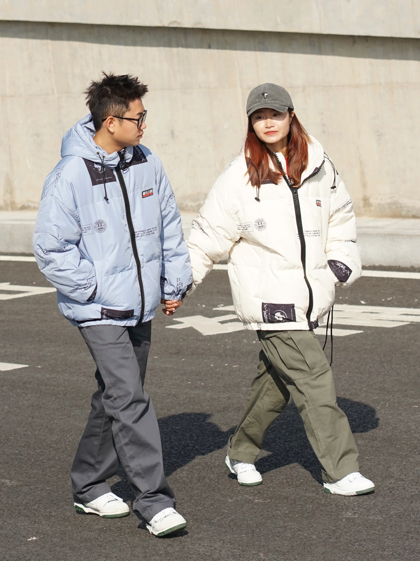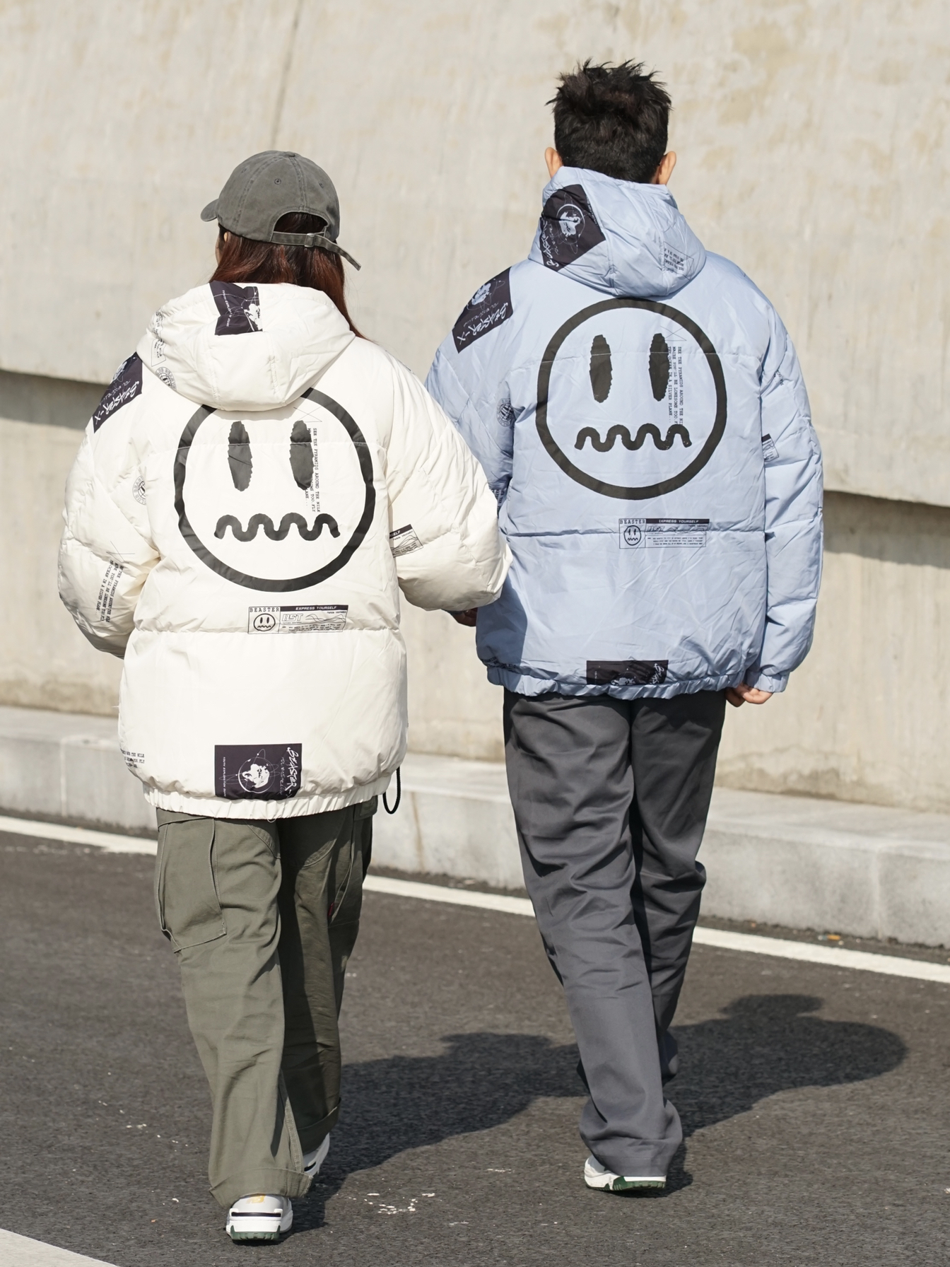冬天日常最常穿的就是羽绒服啦 保暖指数5颗星⭐️ 一起彩色过冬天🌈 —— 今年冬天的第一套情侣装当然要是羽绒服 暖暖的送给ta可以穿上一整个冬天 —— 衣服的背后涂鸦鬼脸很可爱 和彩色的衣服相得益彰