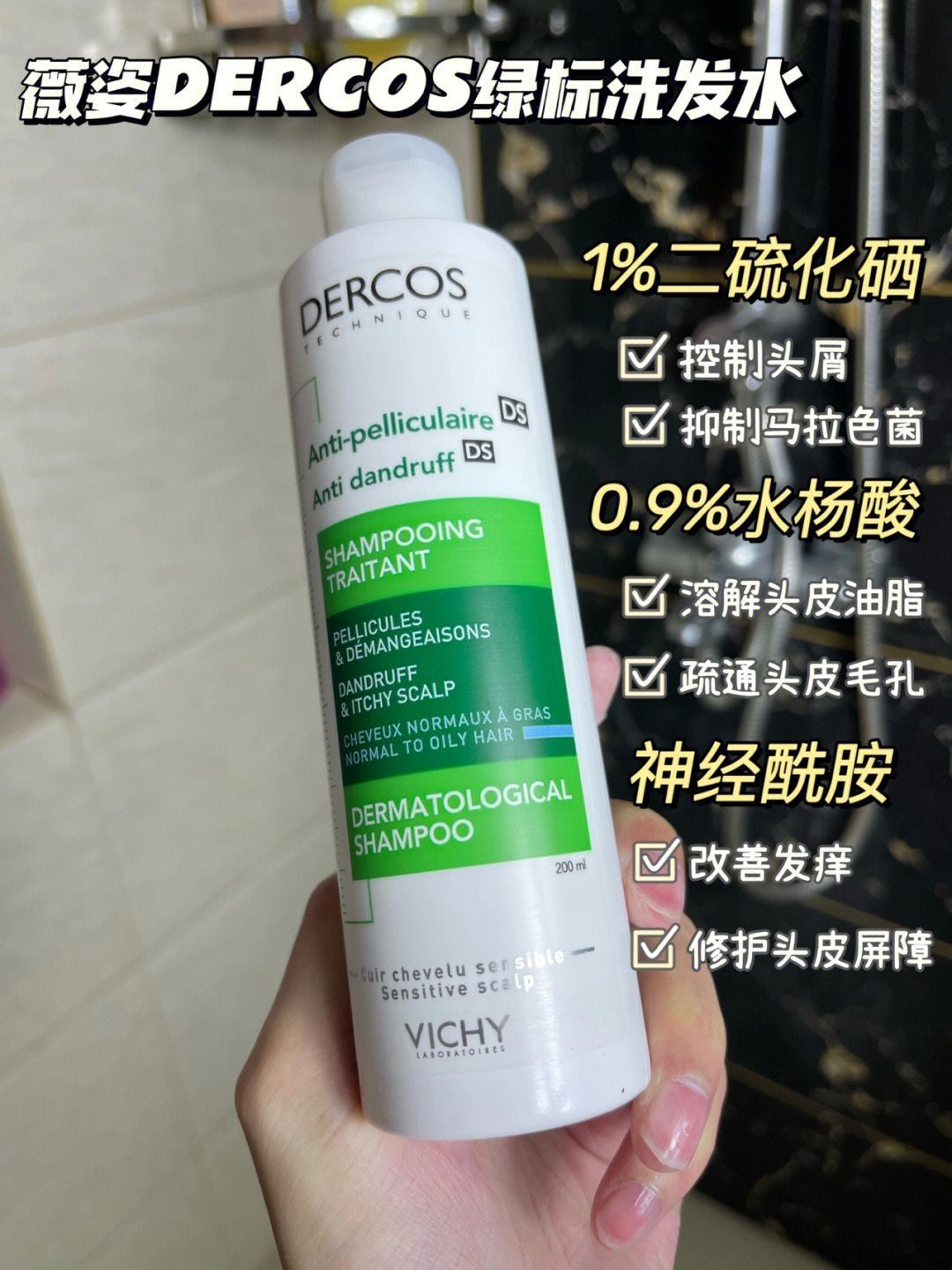 冬天来了,头皮变得更加干燥,头皮屑多 才洗过的头没半天就又干又痒 还时不时掉头皮屑😩! 前段时间试了试这款薇姿DERCOS绿标洗发水~ 去屑止痒真的蛮好诶 这款洗发水 挤出来是黄色的芒果酱质地 还有淡淡清香,闻着很舒服 我选的这款是绿标的,适合大油头+中重度头屑问题, 里面有1%二硫化硒, 是专门的药用级去屑成分 可以从根源去除头屑, 还有水杨酸和神经酰胺 控油止痒的同时修护头皮 洗完头发都香蓬蓬...