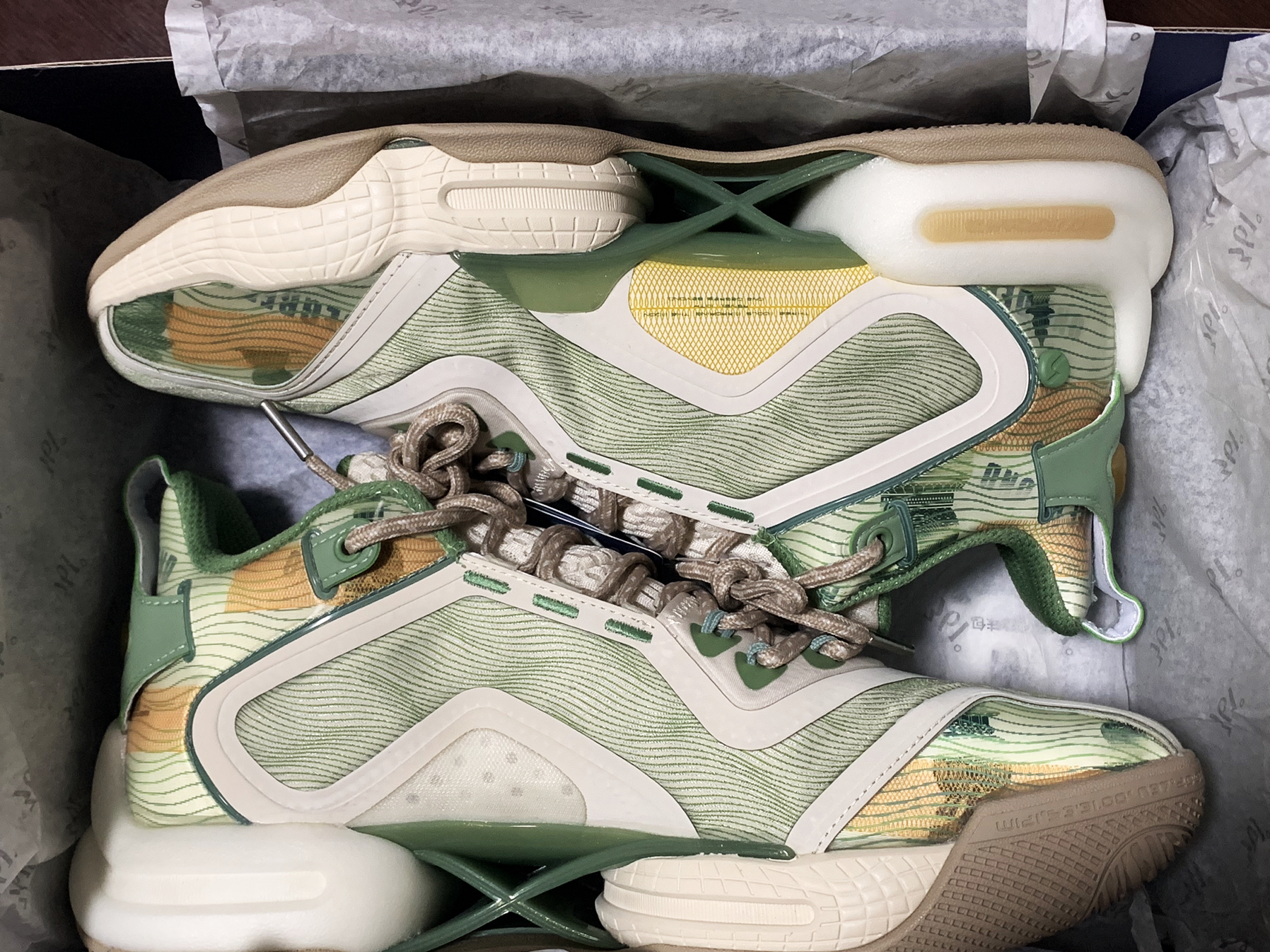 入手 一发售就被颜值吸引到了 音速系列懂得都懂 价格虚高很多 观望了一阵在6月入手 400出头价格还算合适 现在除了这个配色 基本都去到2开 看法 首先颜值不多说 我觉得和nike对比也是非常炸裂 44码鞋子单只重量420g上下 算不上轻量化 中低是前掌䨻 配上lsp泡棉 整体脚感偏韧 后掌一上脚就感觉重心偏高 穿几场之后会有改善 防侧翻方面 在前掌有做延伸 至于作用仁者见仁 鞋面贴合度不错 前...