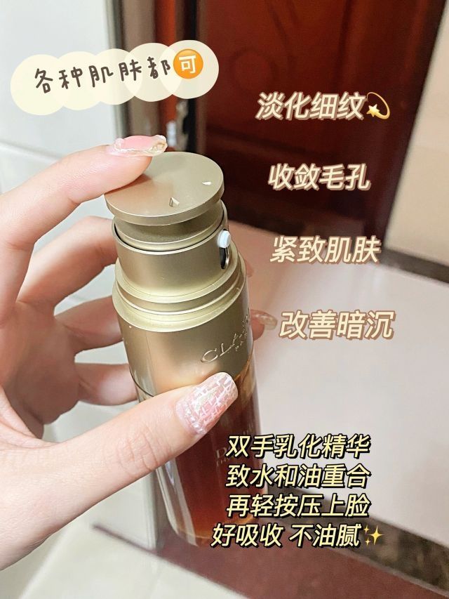 👀本人情况:混油皮,长期熬夜。再好的皮肤也经不起折腾,长期熬夜导致卡粉、暗沉😭市面上的精华也琳琅满目,纠结了好久,有人说太油,最后还是选择了娇韵诗双萃。 用了半年,使用感还是不错的,熬夜后第二天的皮肤依旧透亮😉也没有闷痘长闭口现象👍🏻 ⭐️ 质地:挤出来是咖啡色伴随着透明液体,这款精华 是水油分离的,但是一点也不油腻❗️非常好吸收~ ⭐️使用方法:我一般是按压小滴一泵(因为我是混油皮,姐妹们...