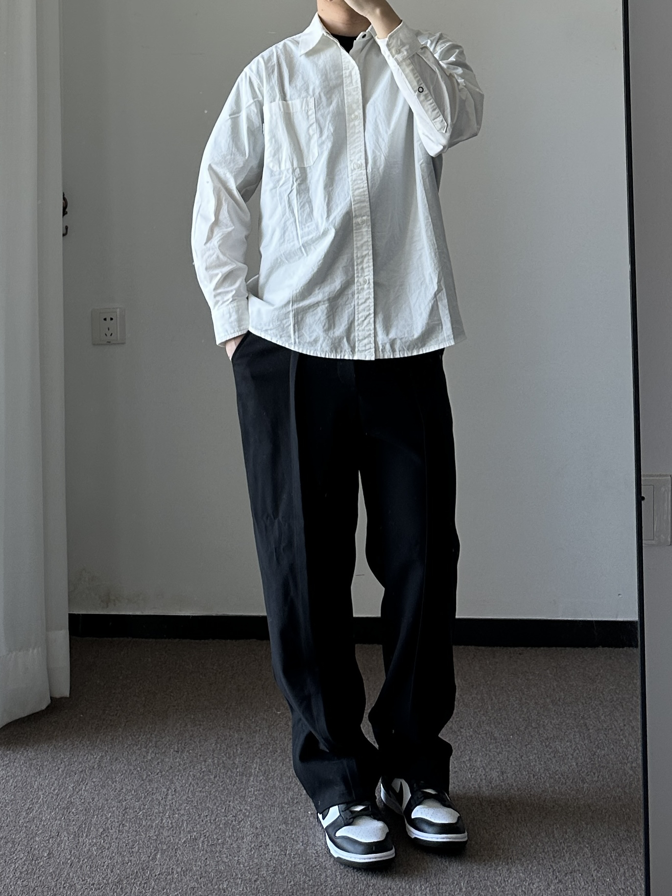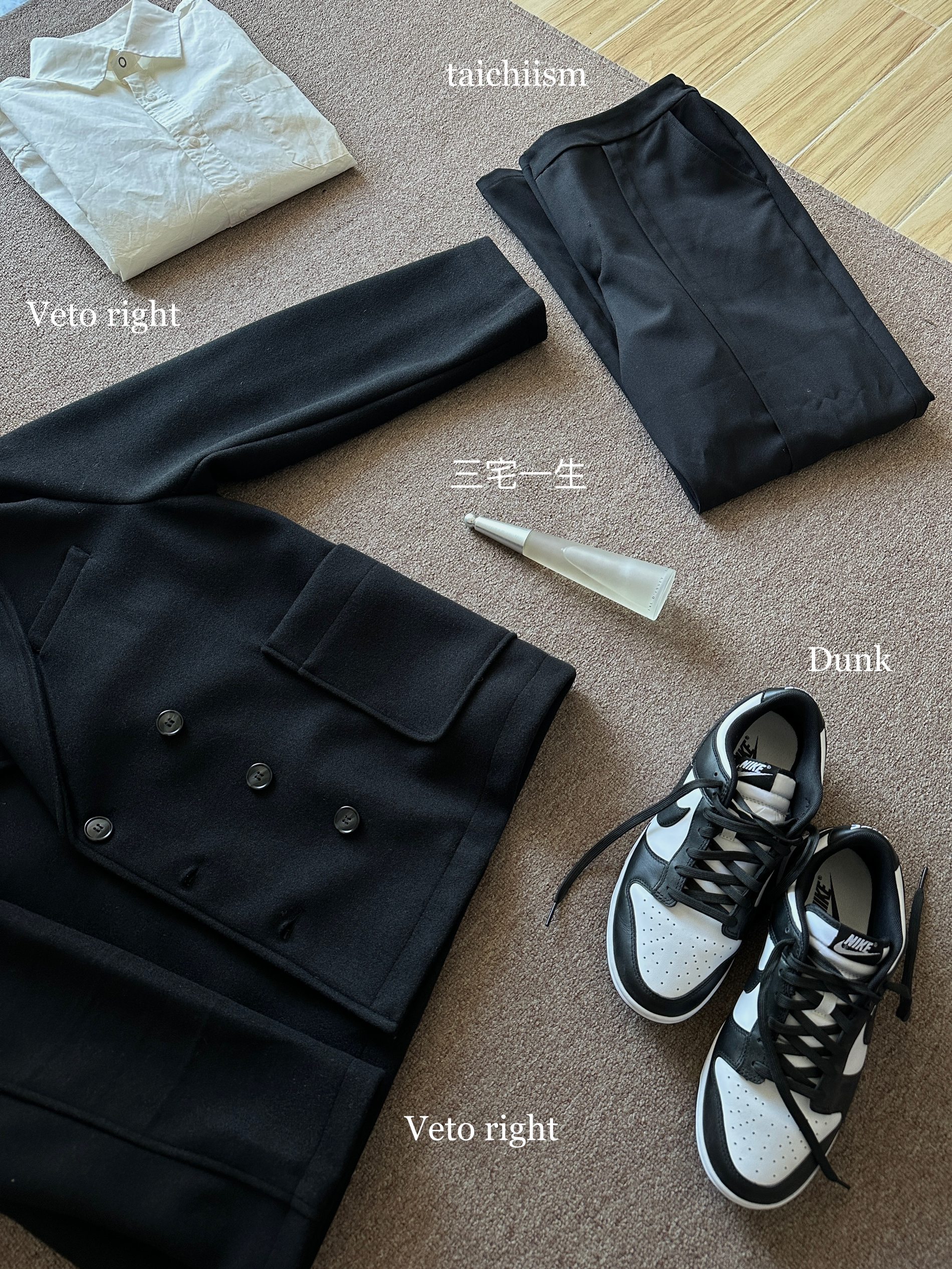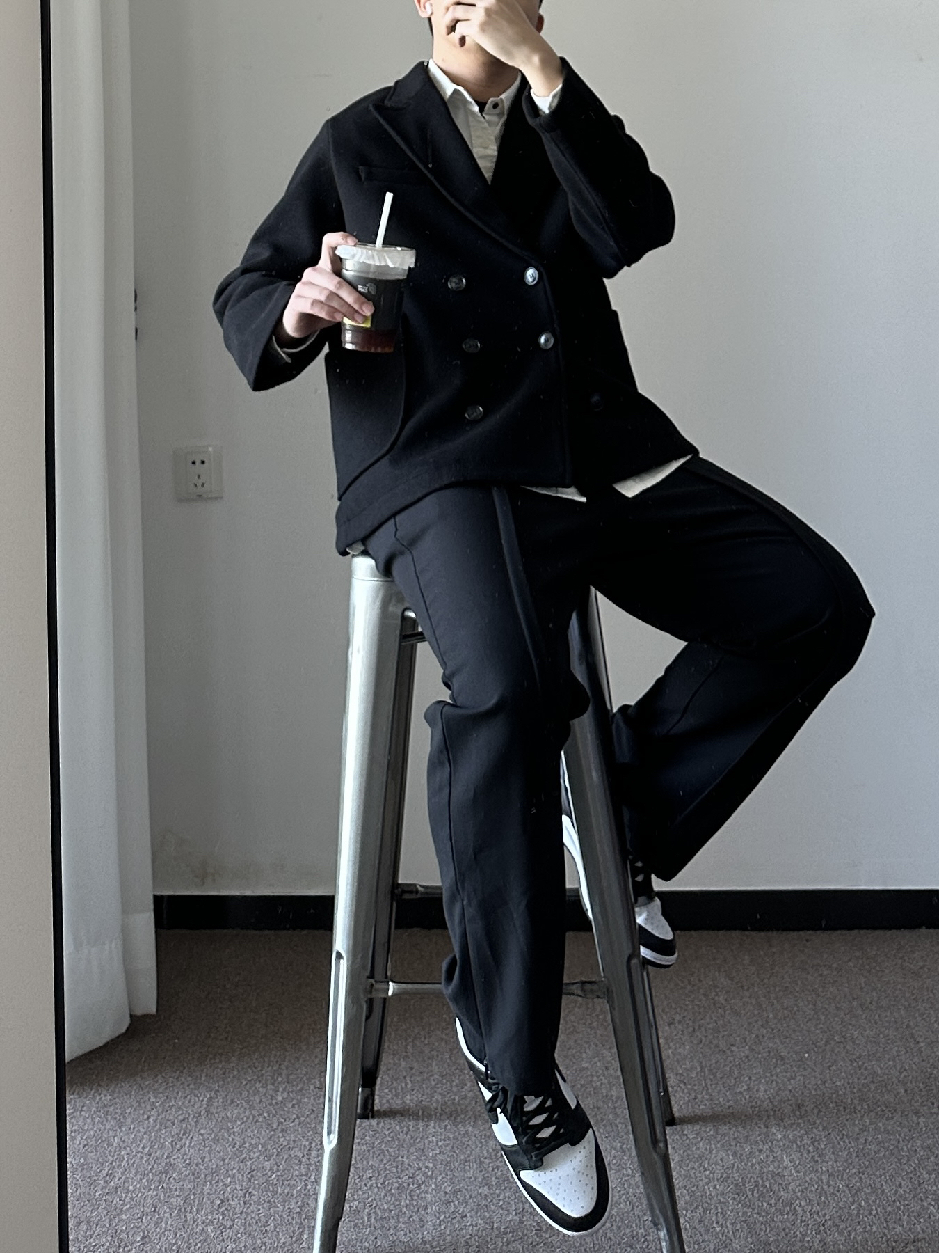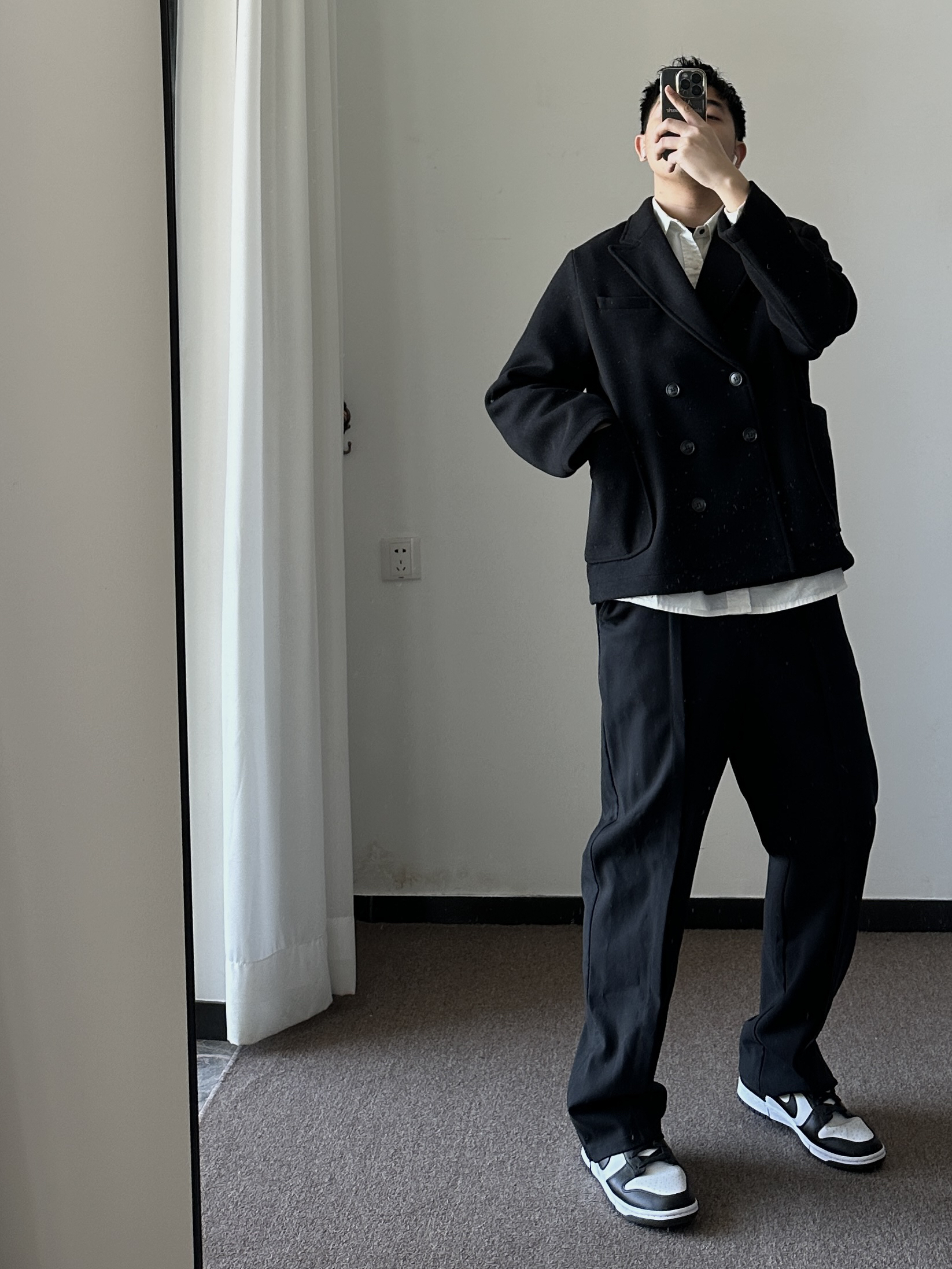 素人也能好看系列~ 174cm/65kg 🧥- 毛呢夹克在秋冬真的是中性风的课代表。男生选择合身的,女生可以稍微oversize。面料不会太软,没什么肩膀的也能驾驭住。内搭衬衫,聚会的合照效果应该不错~上身均为S 👖- 年度最佳西裤,碰到点场合需求。穿它不错~上身M 👟- 熊猫dunk 🏺-三宅一生