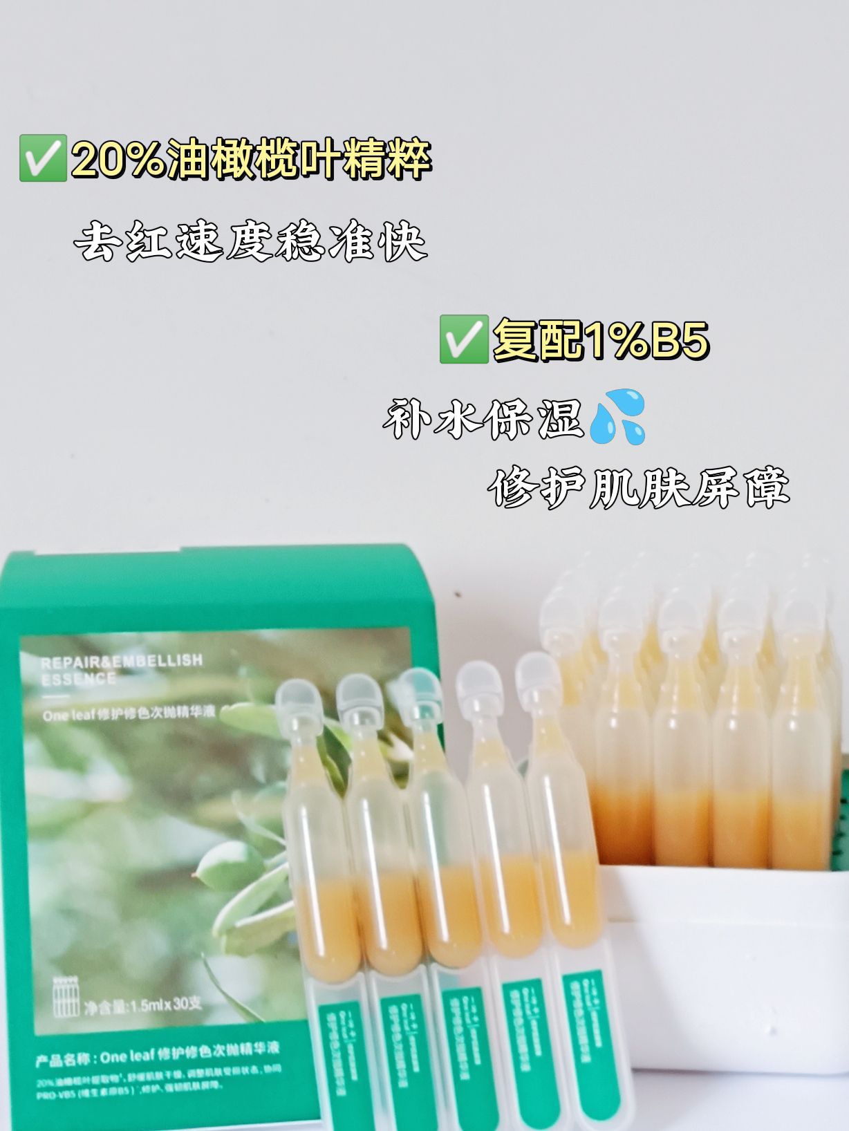每到换季脸就开始闹小情绪 再加上教师还是需要天天😷 脸看起来总是红红的 还好挖到了介个“灭火器” 🌿一叶子双修小白盒 - 🍃20%油橄榄叶精粹 褪红速度快到飞起 🍀复配1%的B5 修护肌肤屏障兼保湿补水💦 ☘️精简13个成分,美修一路绿灯🚦 敏敏肌也可以安心使用 - 包装简约环保,独立次抛设计 一盒有30支,一支1.5ml 1次1管刚刚好,方便又实用 淡黄色的水状质地,流动性非常强 水包油设计,质...