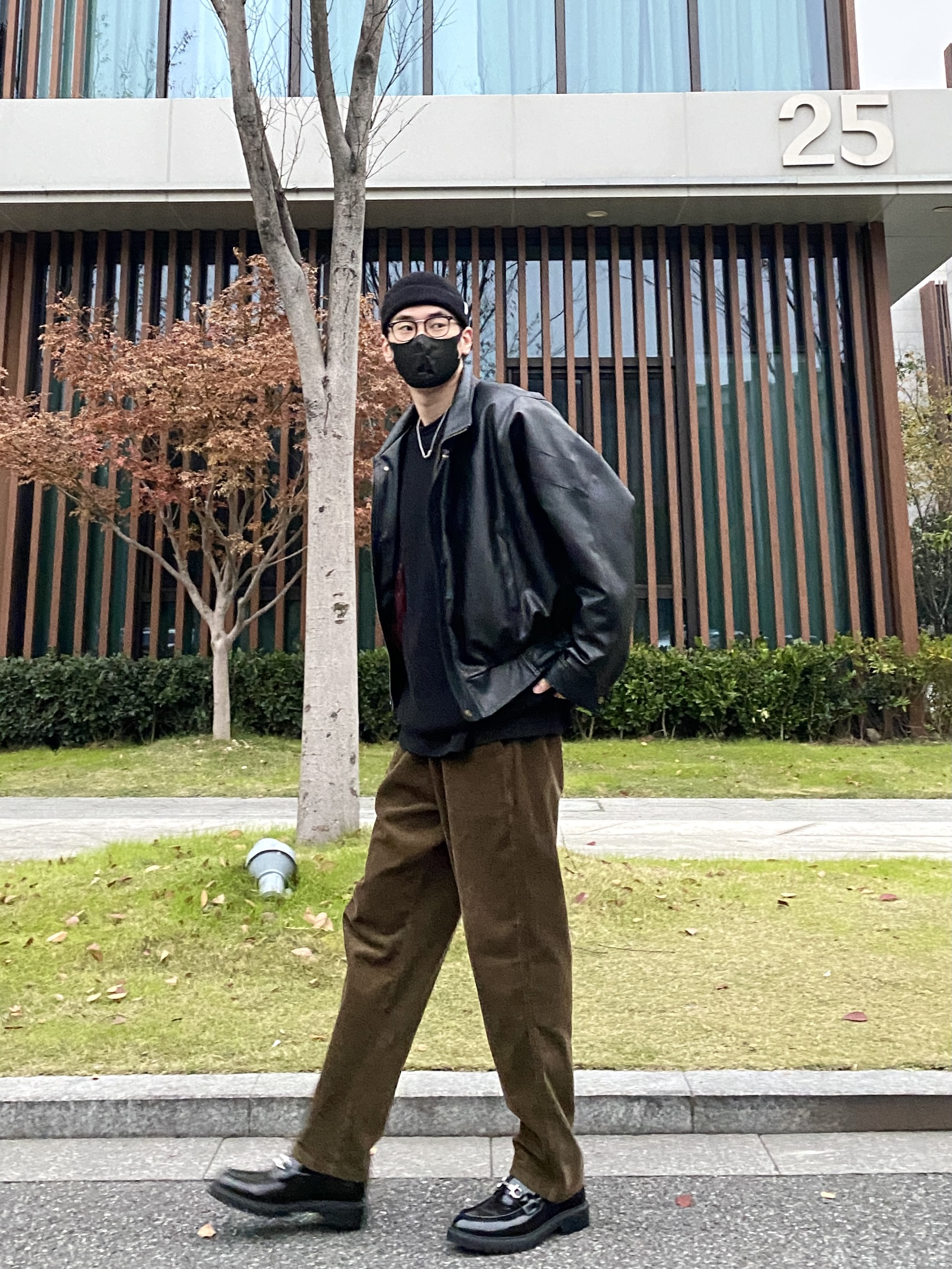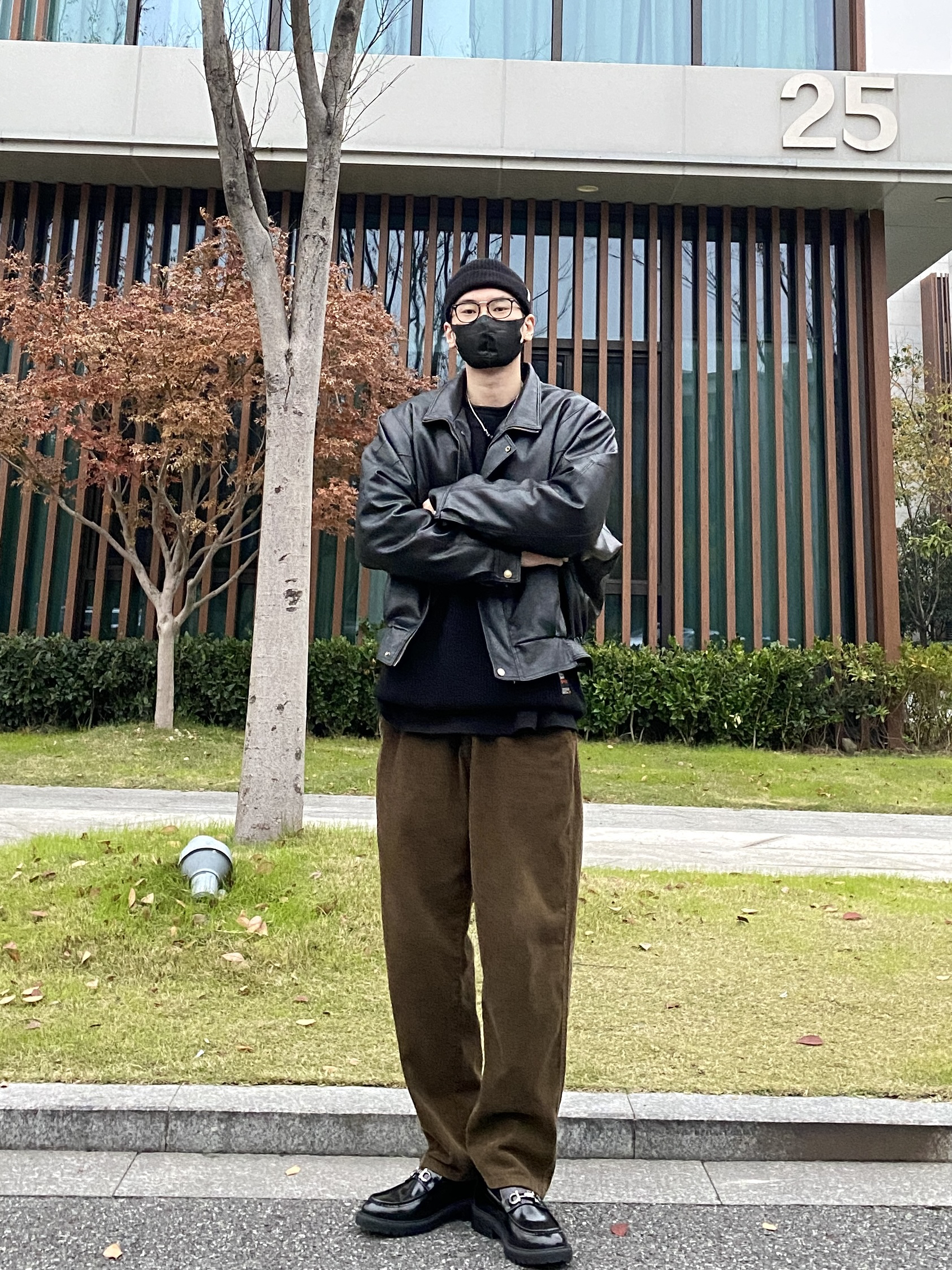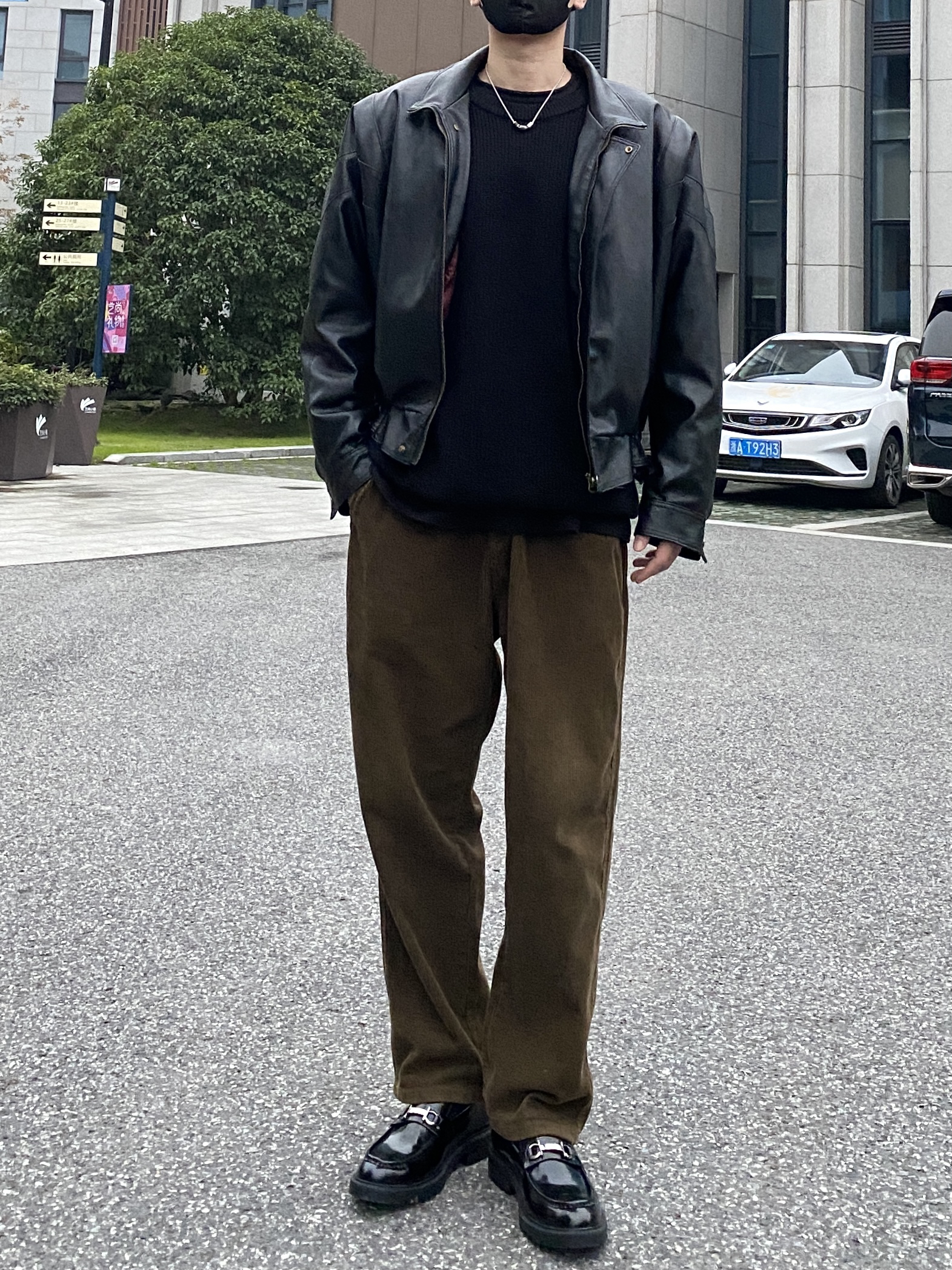 今天这套先用重磅圆领毛衣做内搭,裤子选择不挑腿型的咖啡色直筒垂感灯芯绒裤,鞋子上脚简约百搭的皮制乐福鞋,接着套上帅气的宽松阔版立体剪裁机车皮衣棉服夹克,最后戴一顶黑色线帽呼应下衣服鞋子的颜色,OK,出门看看搭配效果吧! - 今日穿搭 衣服裤子:NICE LILI 鞋子:沙驰