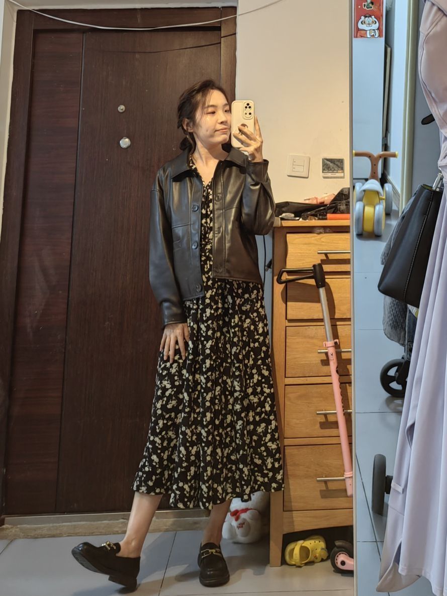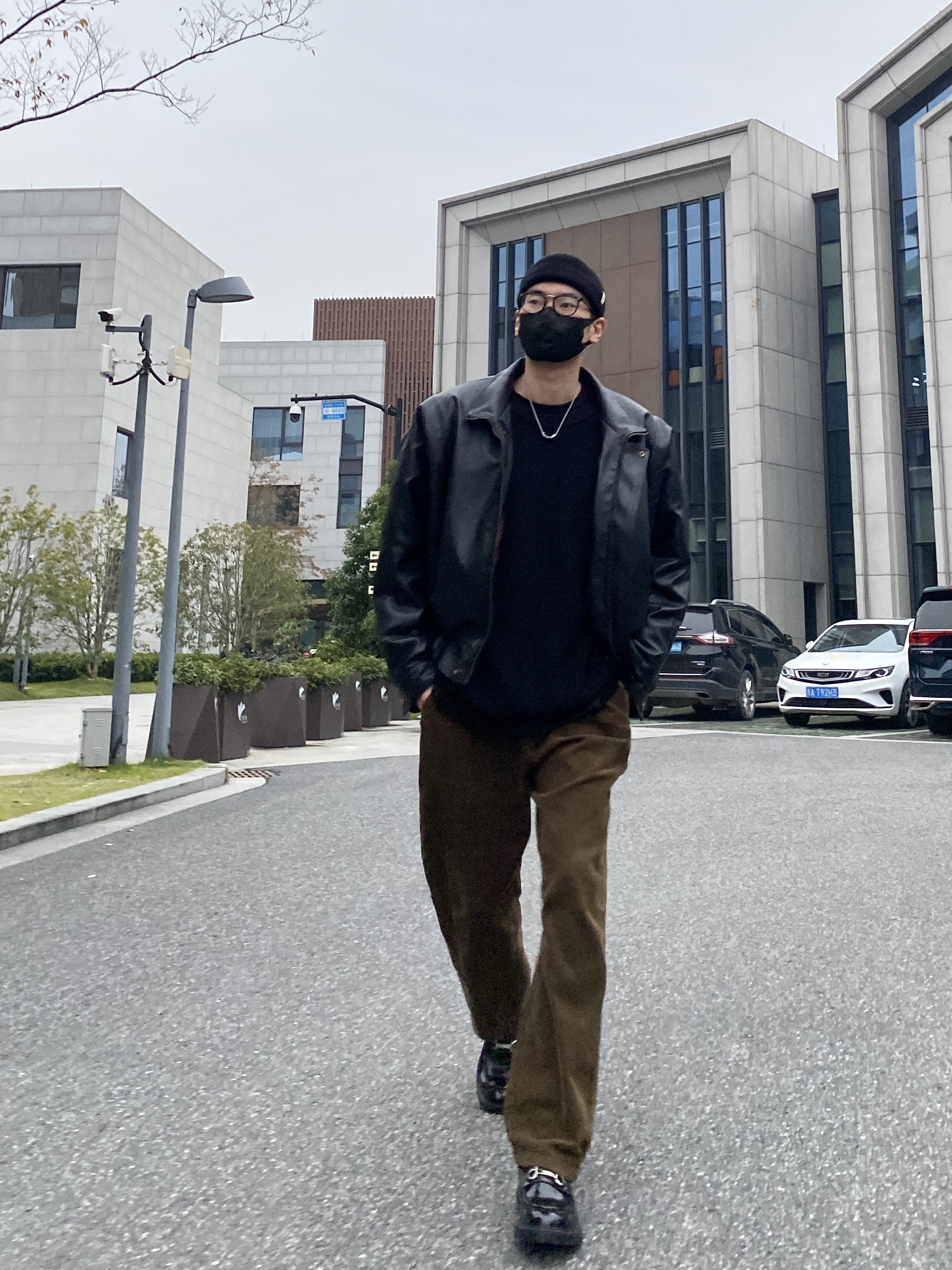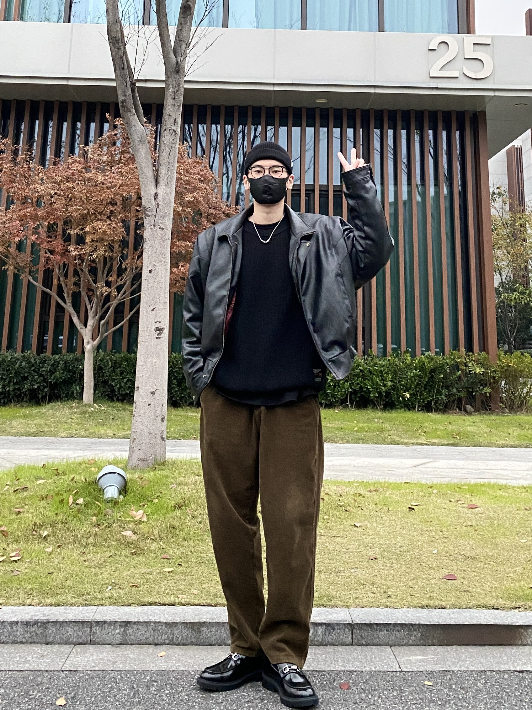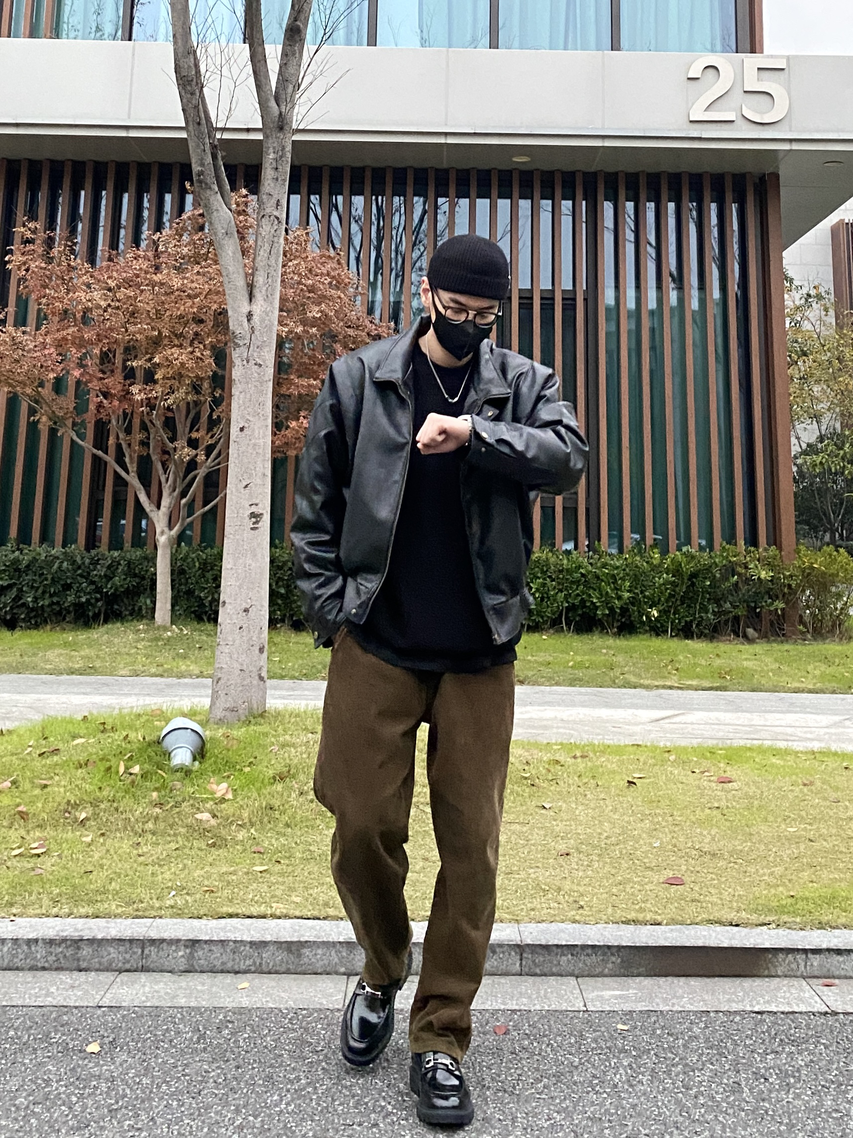 今天这套先用重磅圆领毛衣做内搭,裤子选择不挑腿型的咖啡色直筒垂感灯芯绒裤,鞋子上脚简约百搭的皮制乐福鞋,接着套上帅气的宽松阔版立体剪裁机车皮衣棉服夹克,最后戴一顶黑色线帽呼应下衣服鞋子的颜色,OK,出门看看搭配效果吧! - 今日穿搭 衣服裤子:NICE LILI 鞋子:沙驰
