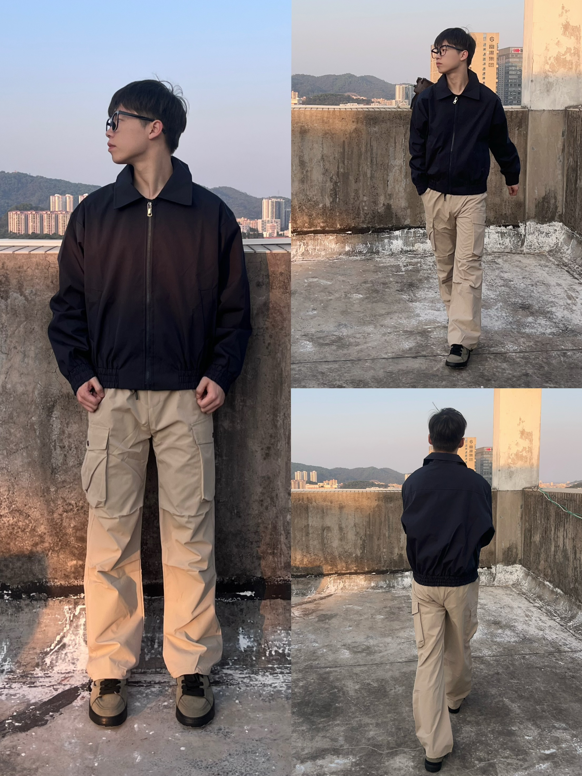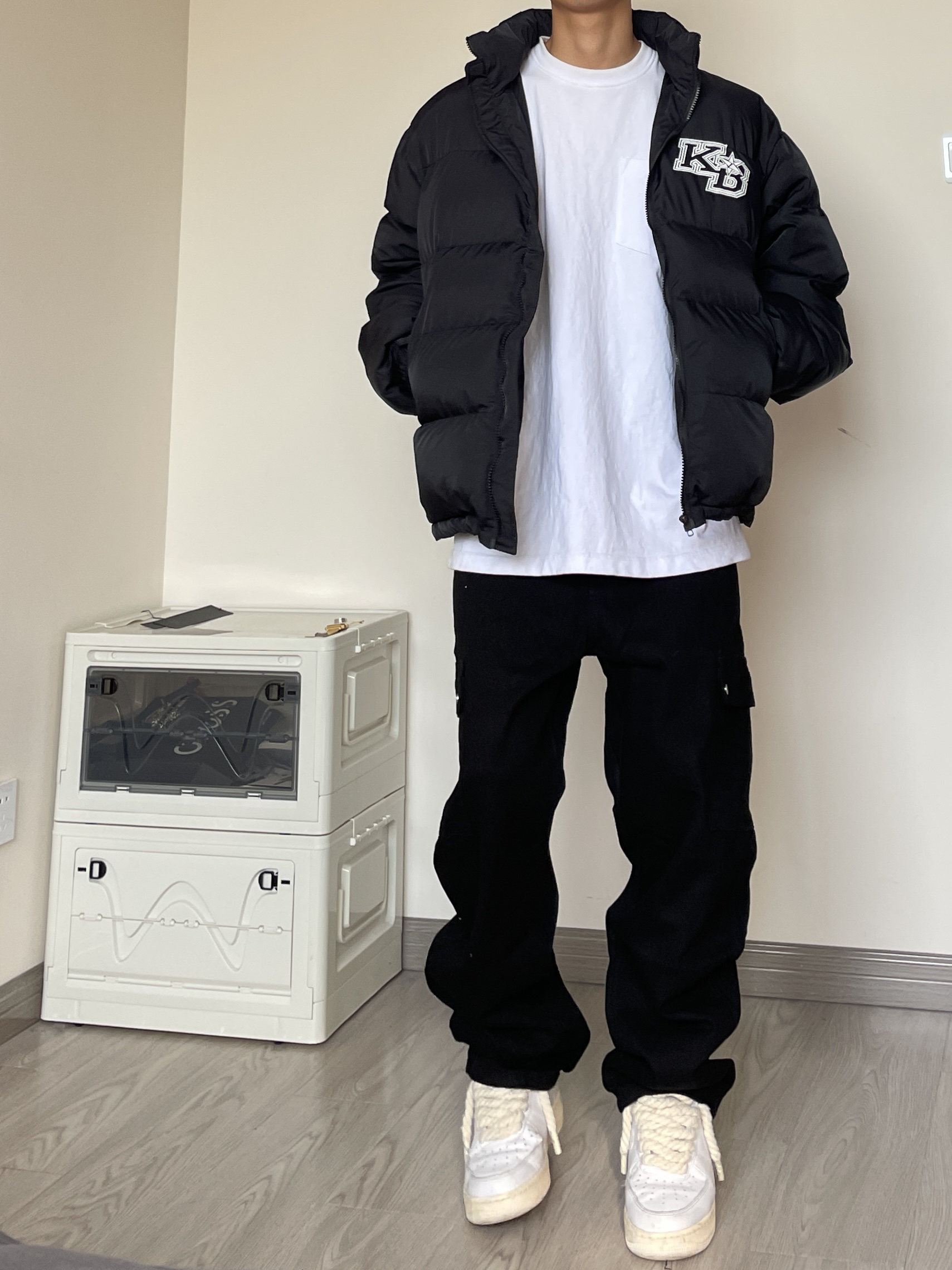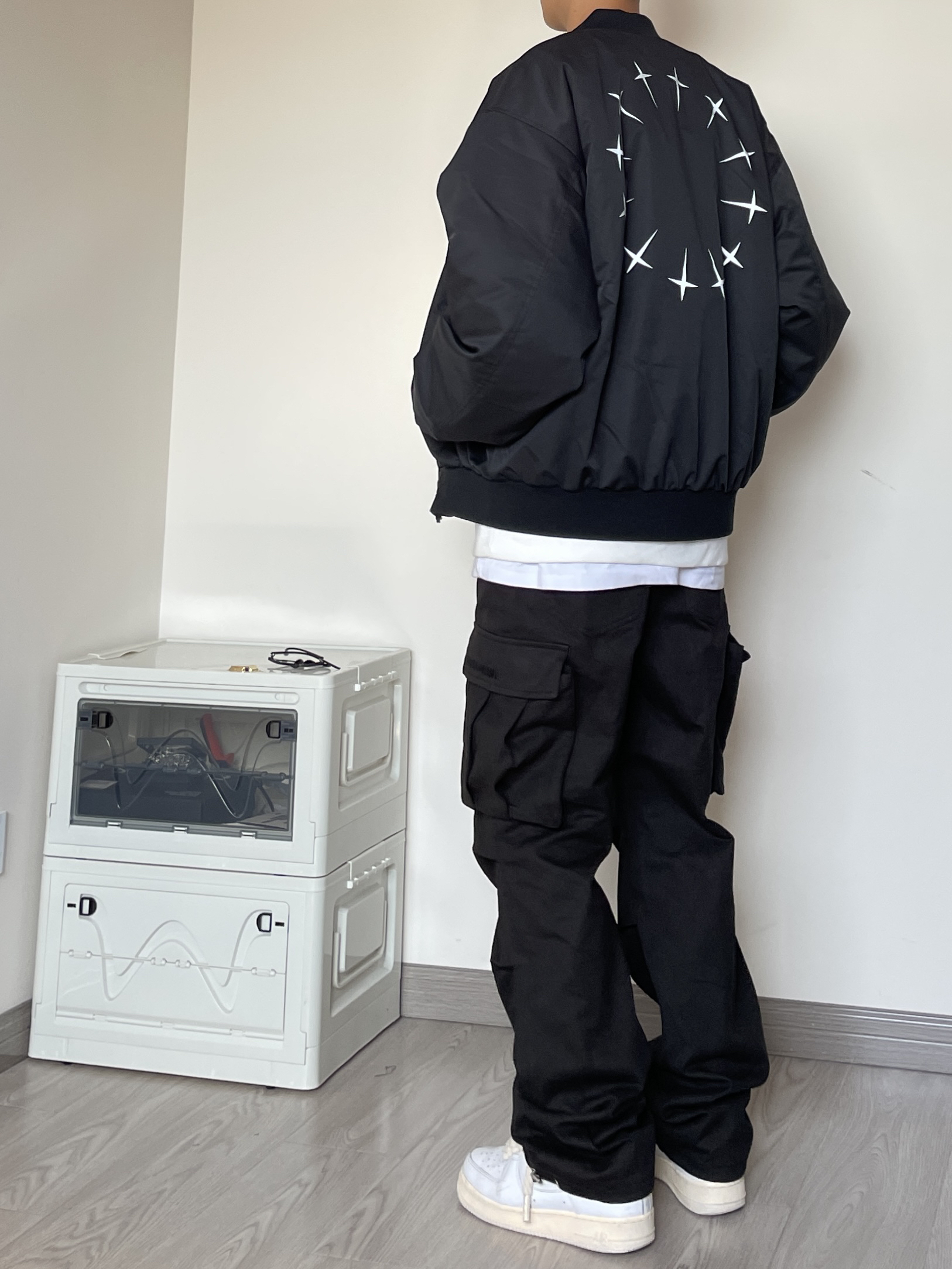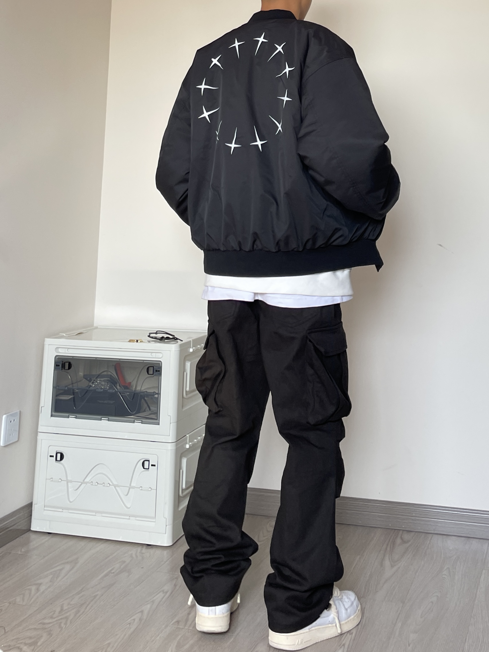 👔 上衣是来自GRKC的飞行夹克,微宽松版型,剪裁干净利落,胸口和后背的印花点缀。 👖 裤子是来自WAITINGWAVE的多袋工装长裤,整体版型宽松,两侧大口袋设计很能装。也丰富整体层次感。 👟 AF1