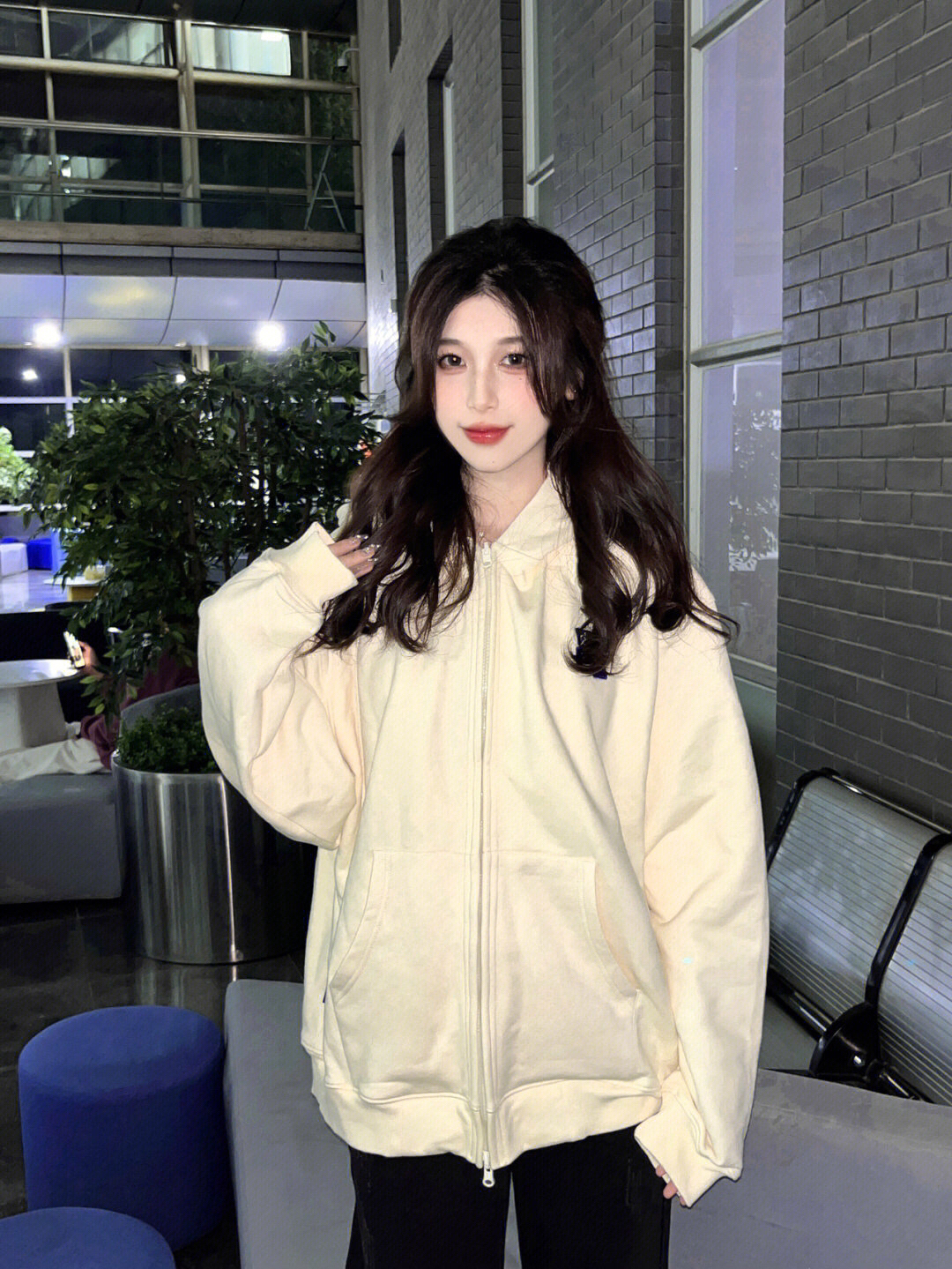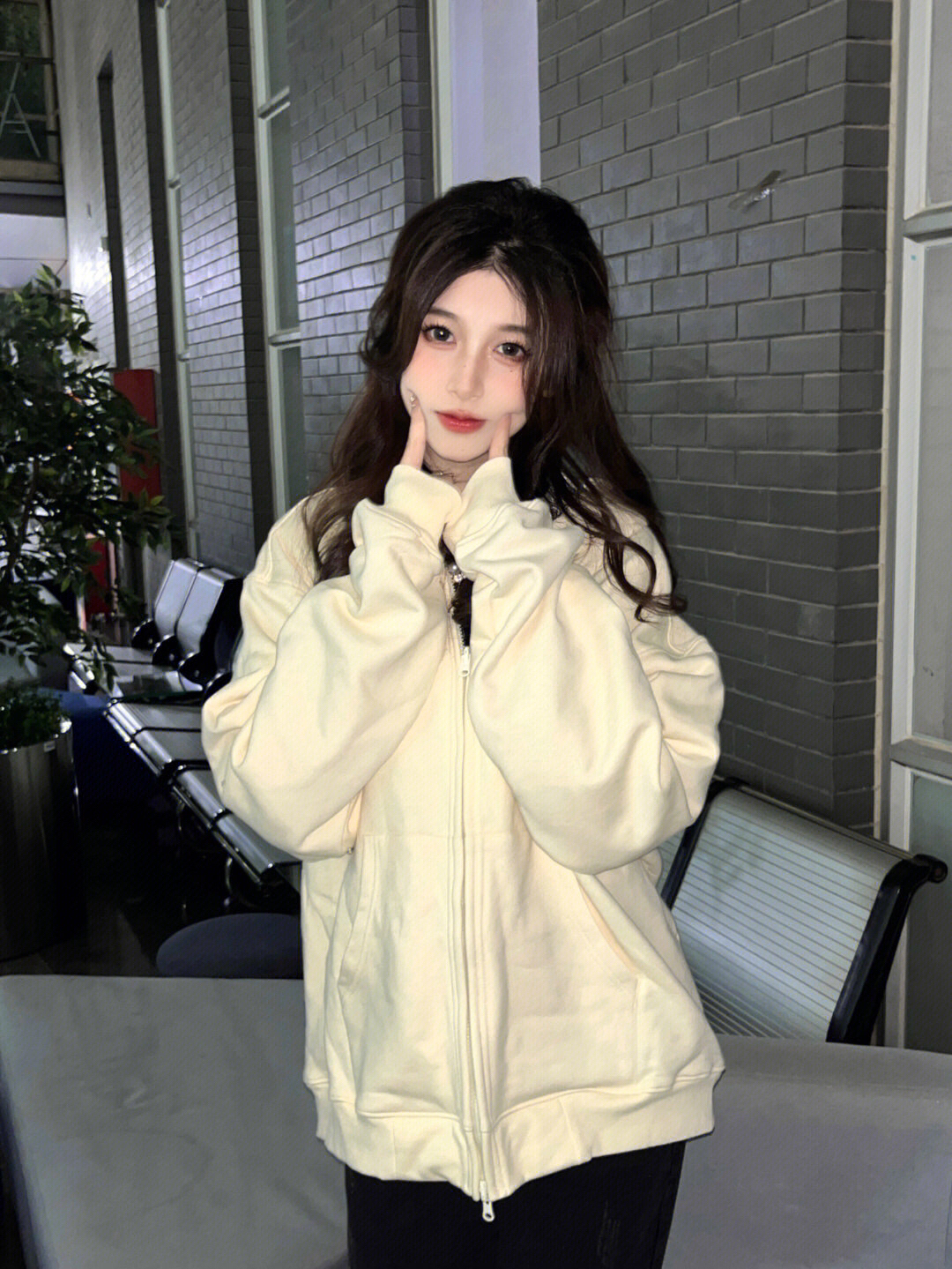 米白色超显温润🌟高雅气质 厚款拉链衫保暖效果非常棒 胸口字母刺绣🪡图案真好看 休闲百搭~叠穿真的太合适啦