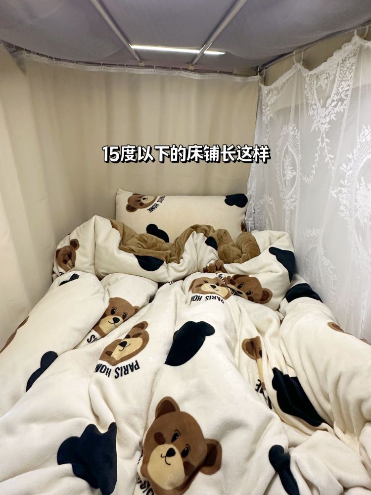 牛奶绒三件套也太舒服了💆🏻♀ 对软软糯糯的东西完全没有抵抗力 柔软厚实,关键是不掉毛哇 躺在一堆奶油小熊中间心情特别好🐻 天气不太冷的时候只盖被单完全够用 15度以下套上冬被不要太暖和🧶🧶 冬天睡这一床可太舒服啦~