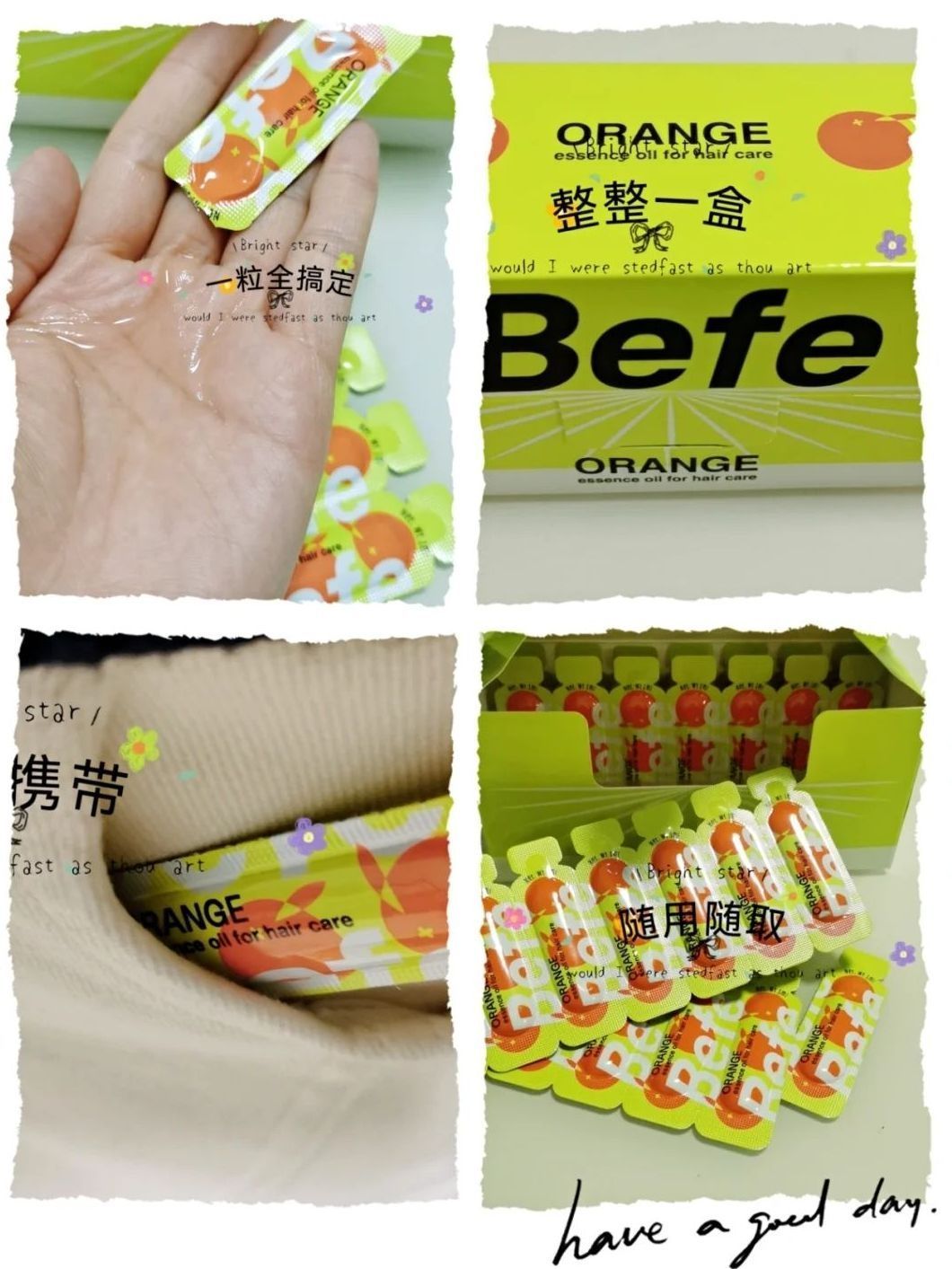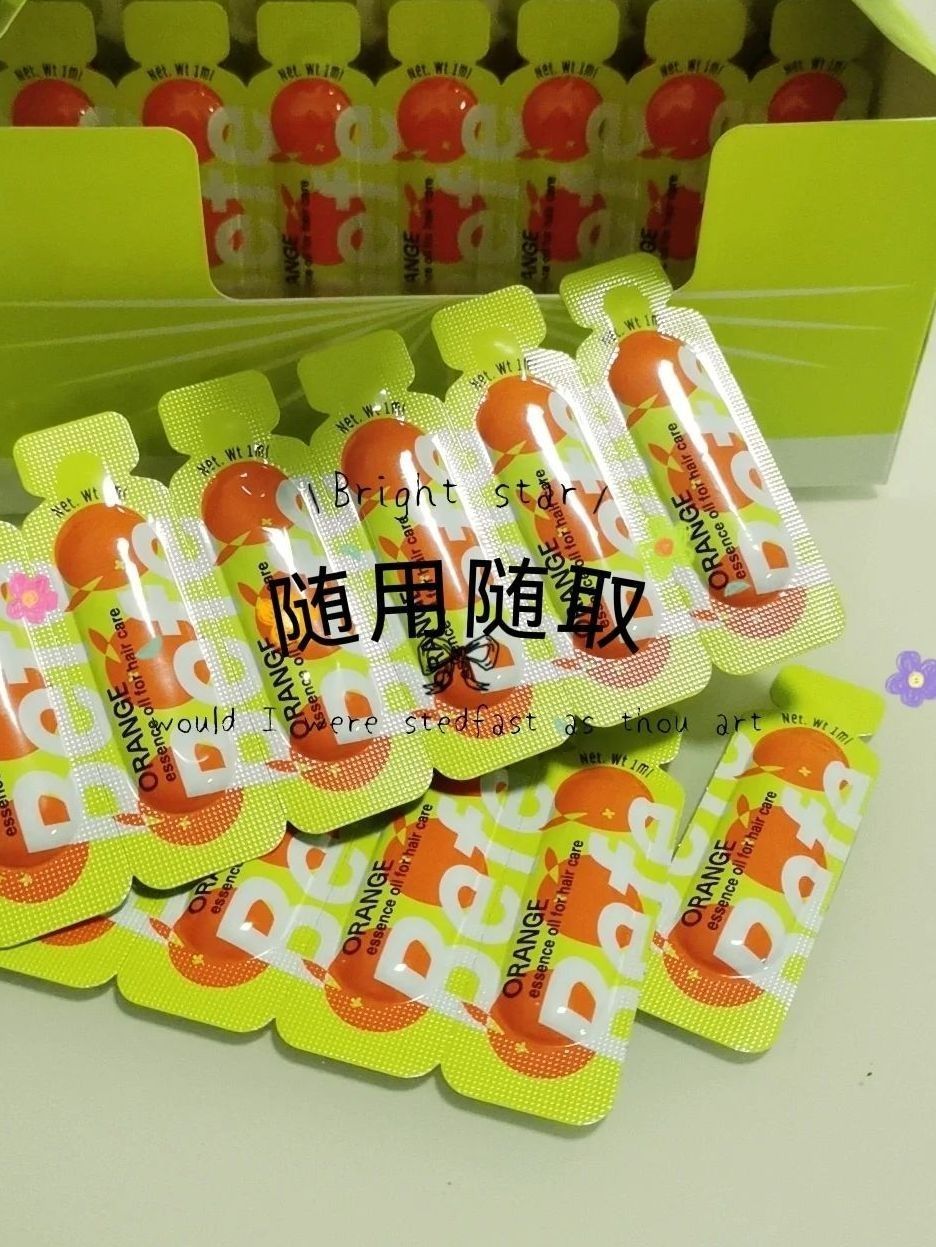护发小知识 头发护理是很重要的 市面上很多护发精华都是那种一瓶装的 感觉不是太卫生。 befe橘光护发精油,满满的一盒 里面都是一支支独立包装 卫生又锁鲜,每次洗完头发就取一支 在手上涂抹均匀 由发根至发梢进行涂抹,清透的质地,干爽不粘人,味道还特别的好闻 一次一支,既锁鲜又卫生,出门携带都很方便。 个t自从用了befe橘光护发精油 头发梳的可顺畅了,也没有之前那么毛躁了 总之头发护理很重要 总不...