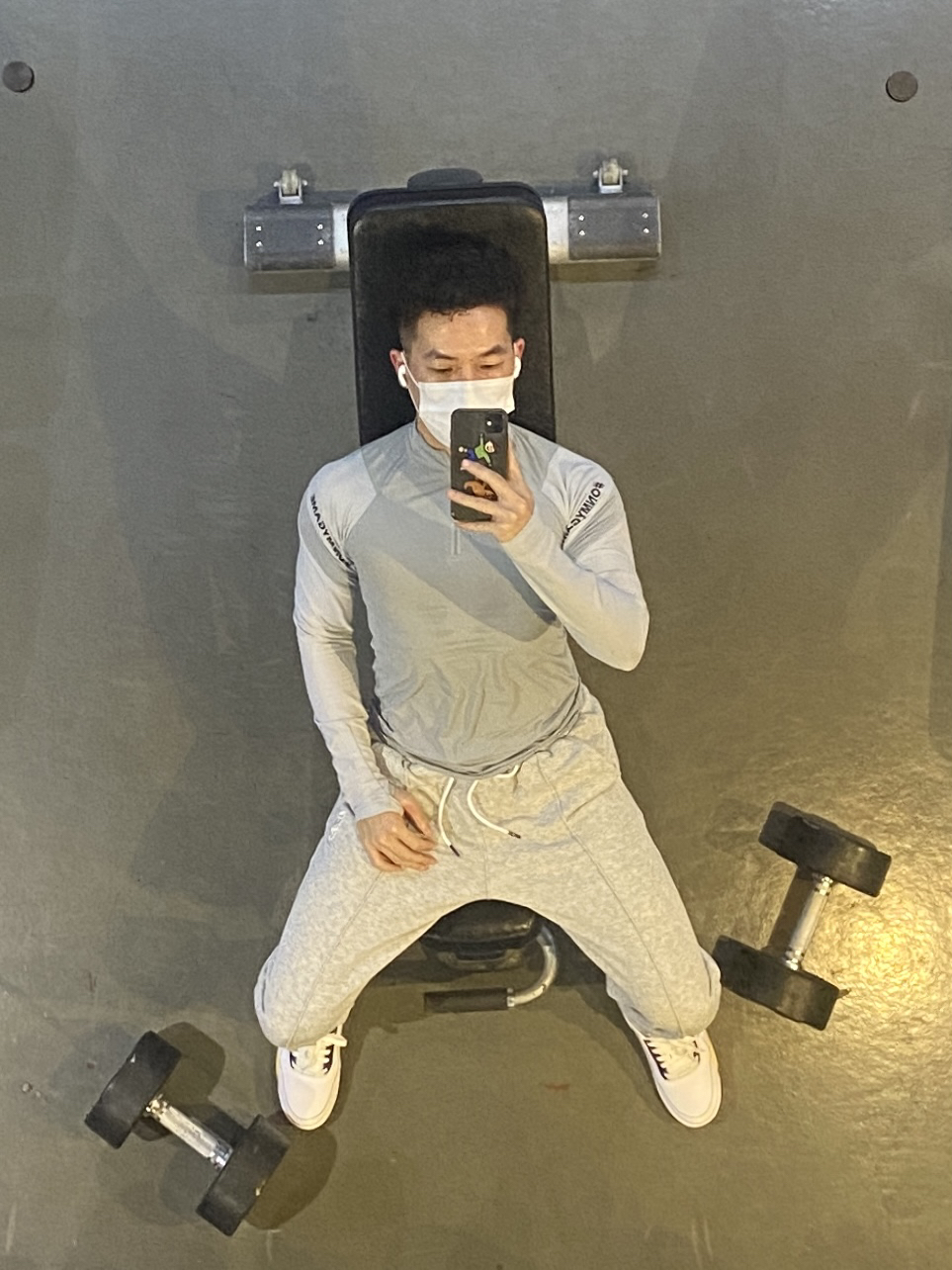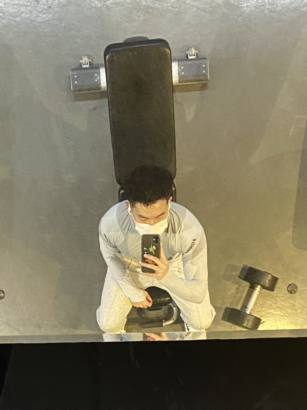 举哑铃的时候 发现头顶上是面镜子 就想试试有没有新的拍照姿势 你觉得这个姿势怎么样 ? 运动舒服最重要 今日穿搭公式♾ 灰色紧身弹力1⃣️➕灰色卫裤 运动非常自如 也非常吸汗 运动完身体还是很干爽