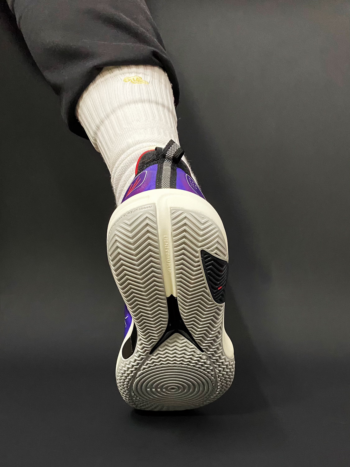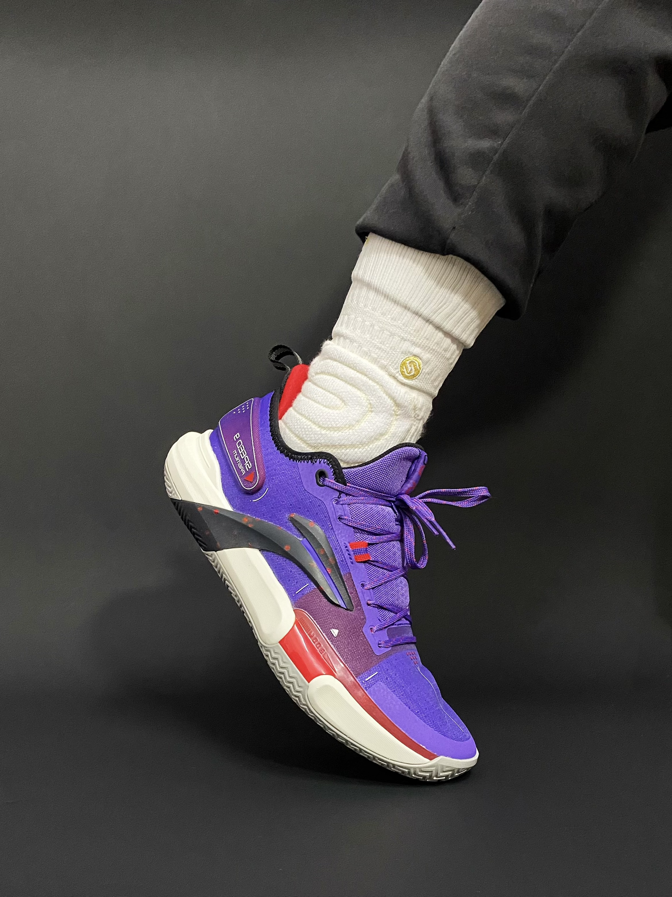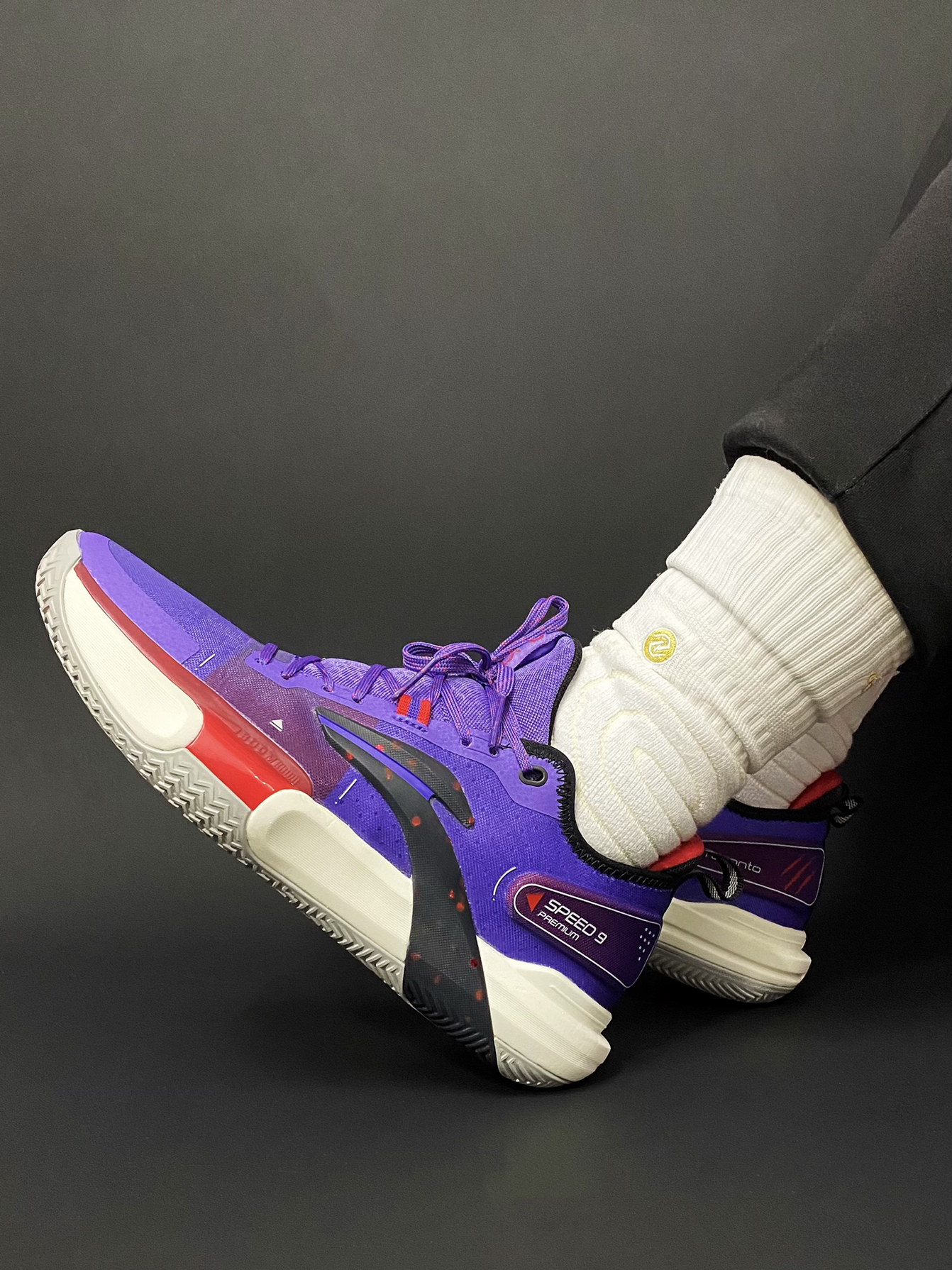 目前冰点的价位,闪击9这双鞋还是非常值得推荐的,很适合轻体重后卫前锋。 1️⃣外观方面,配色以紫色为主,用少量的红色进行点缀,设计细节的地方,就是鞋身内侧和鞋垫都印有红色的爪印。这个配色是比较耐脏的,对不喜欢打理球鞋的朋友是一个很好的选择。 2️⃣配置方面就简单的说一下,全掌的lightform框架,前掌添腹式䨻,搭配超大铲型tpu,初上脚,能感觉到鞋子很轻,但舒适度不是那么的好,整双鞋的脚感是偏...