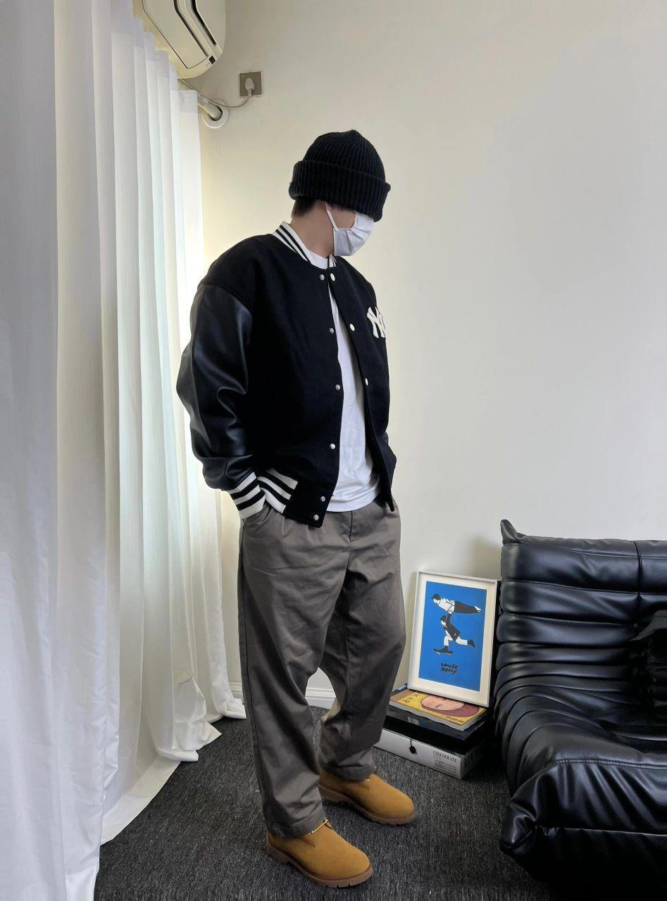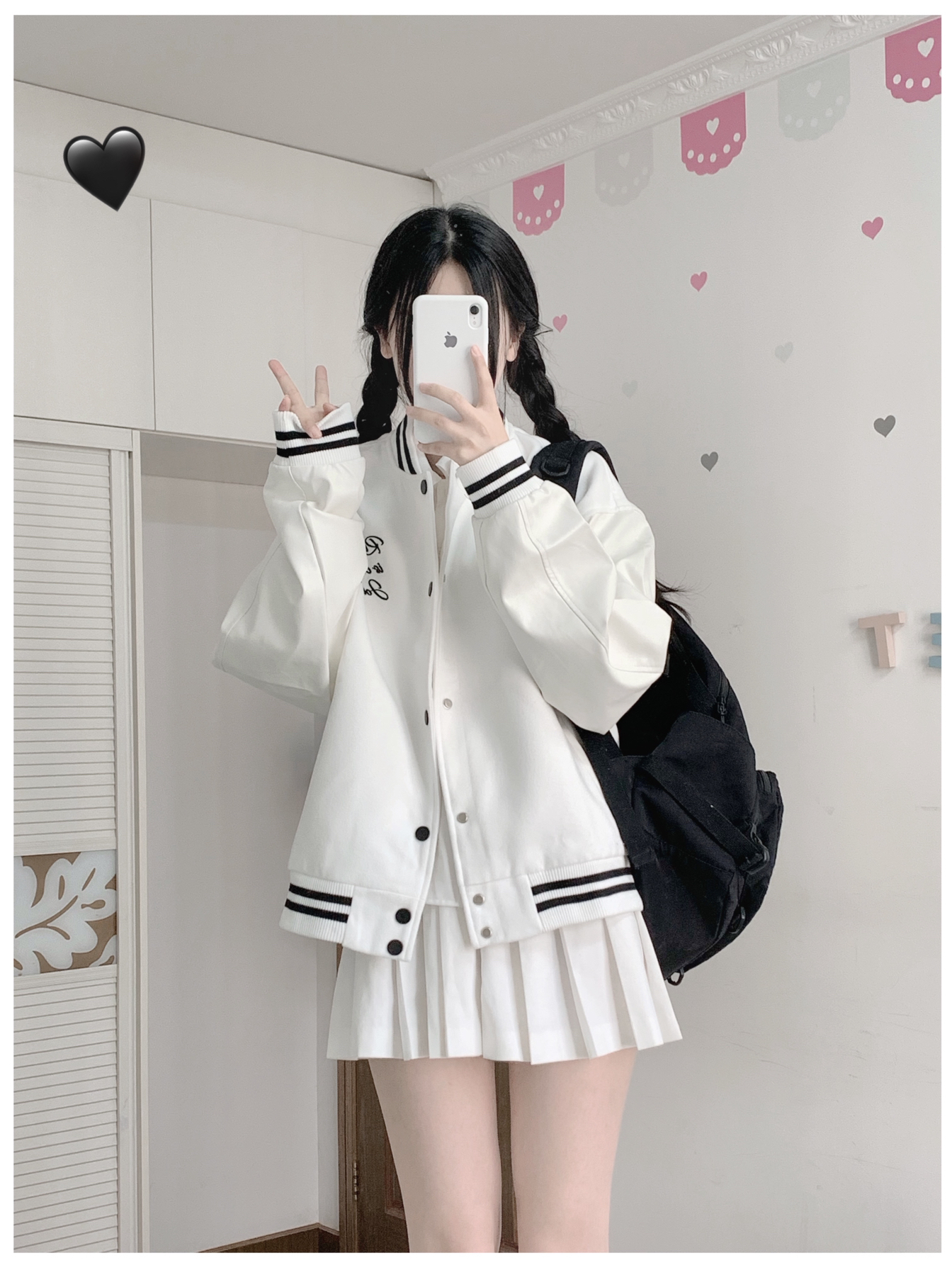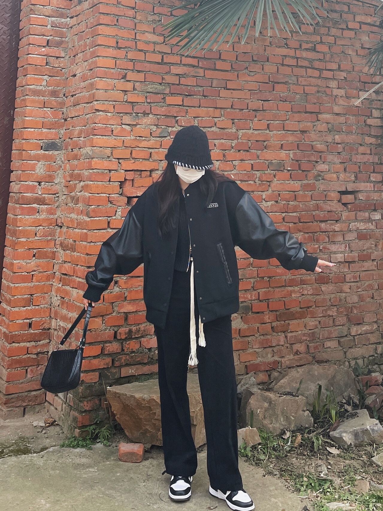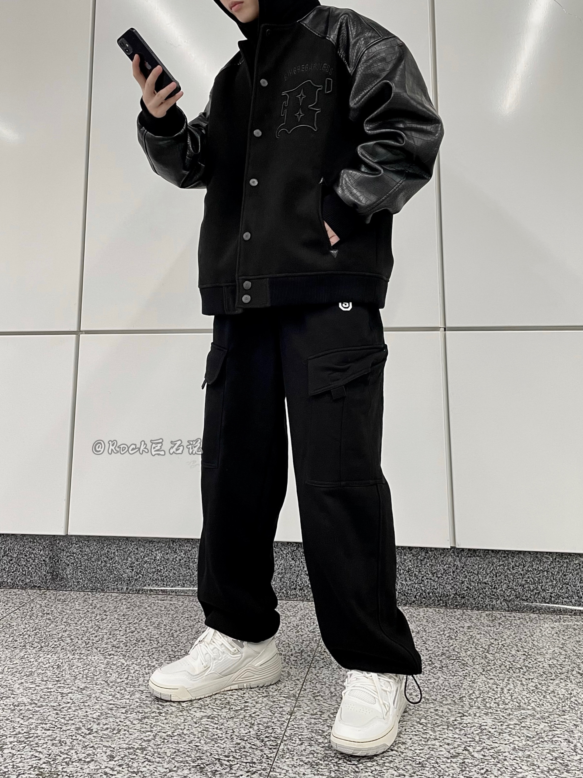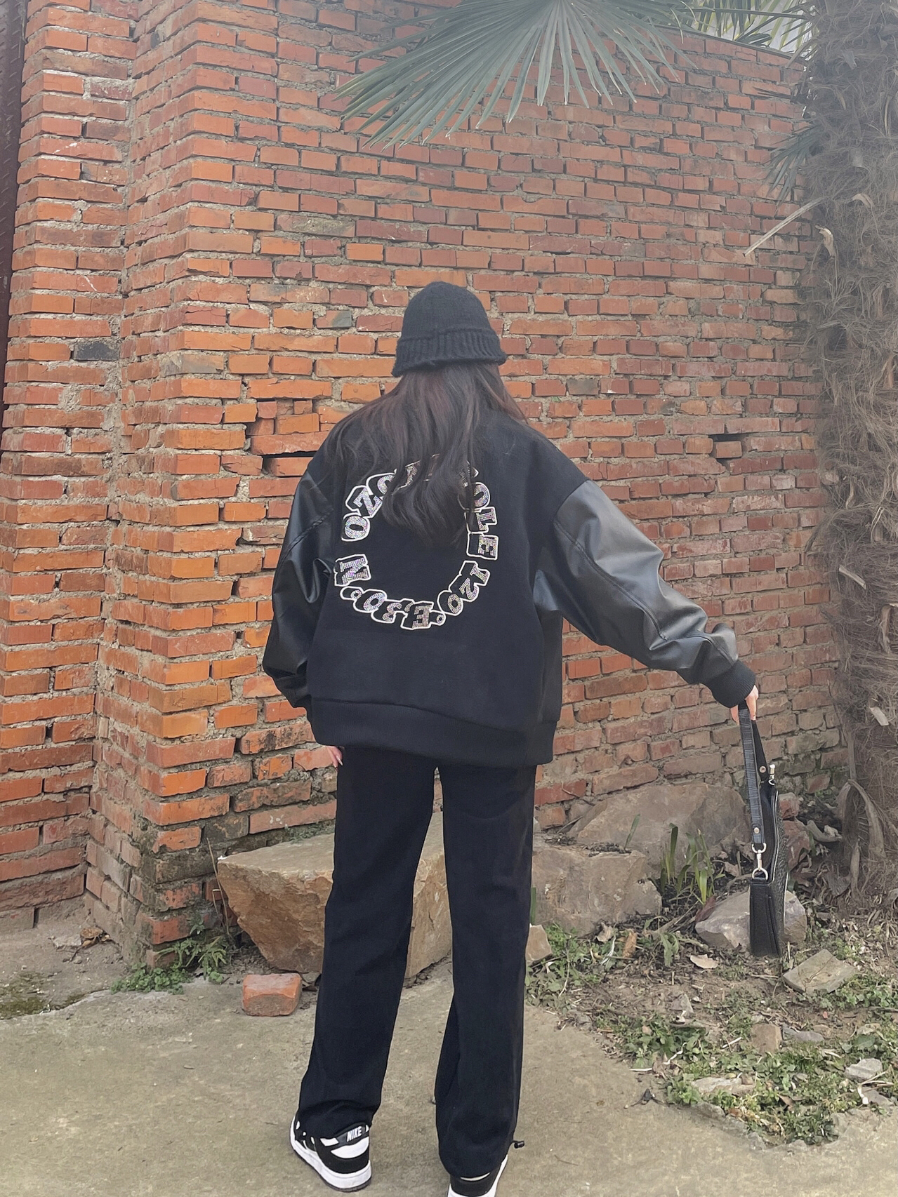 黑色百搭经典款式的棒球服 后背的烫钻字母图案超🆒 袖子拼接黑色系PU皮而成 搭配黑色系裤子👖超cool的