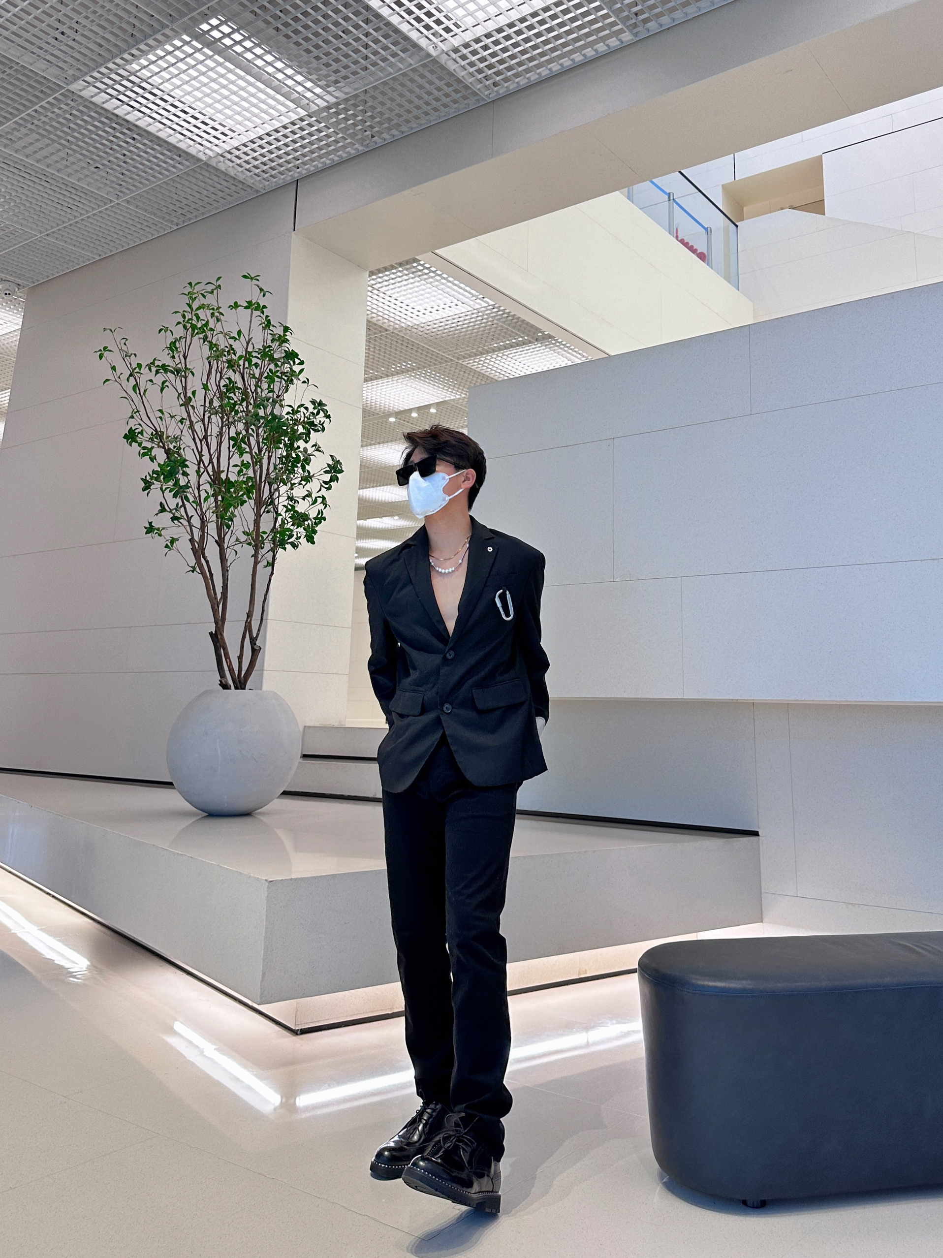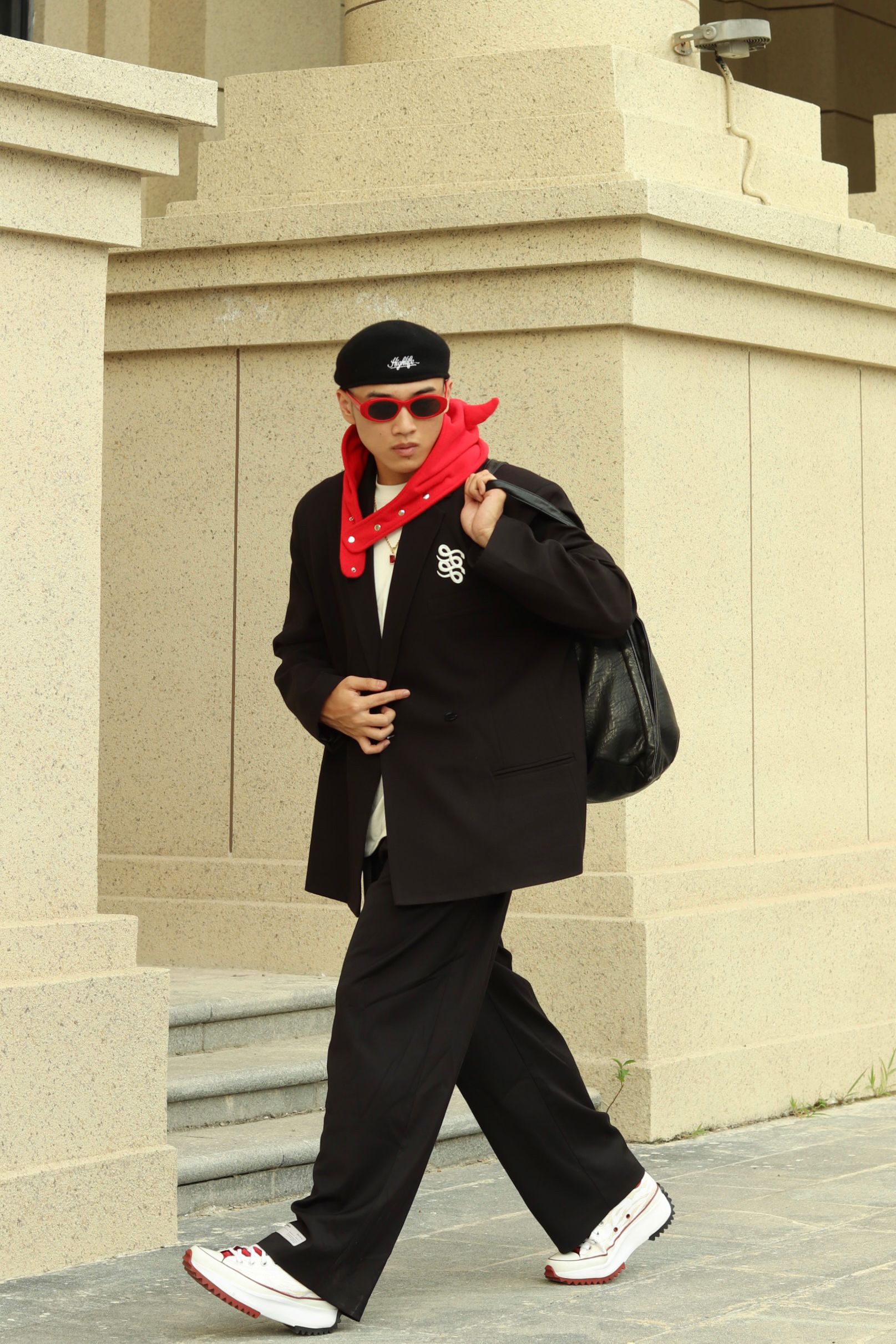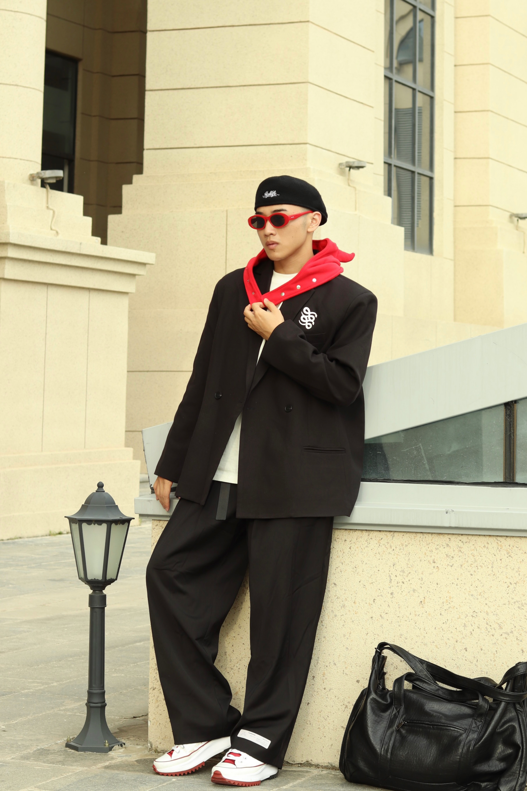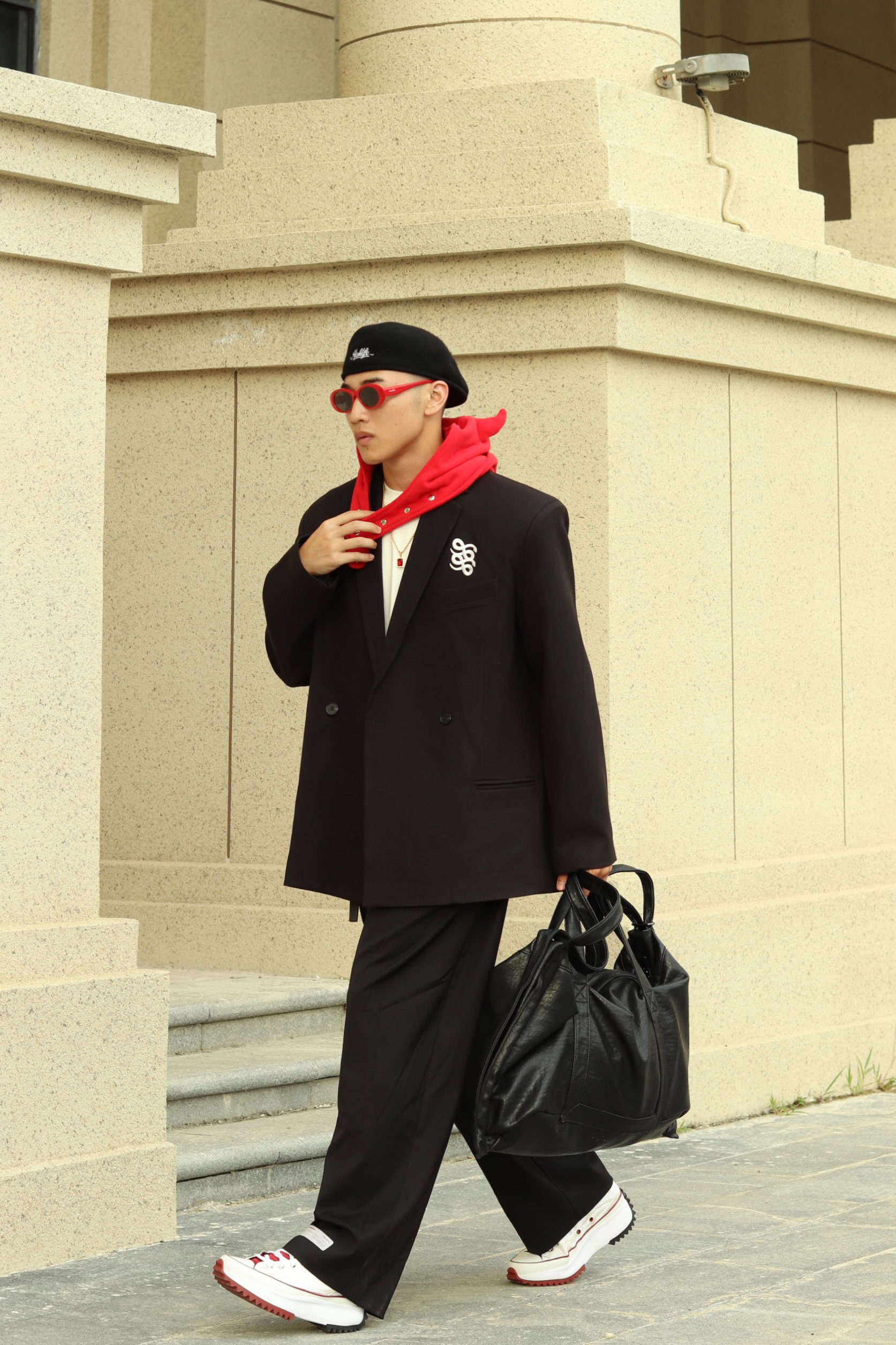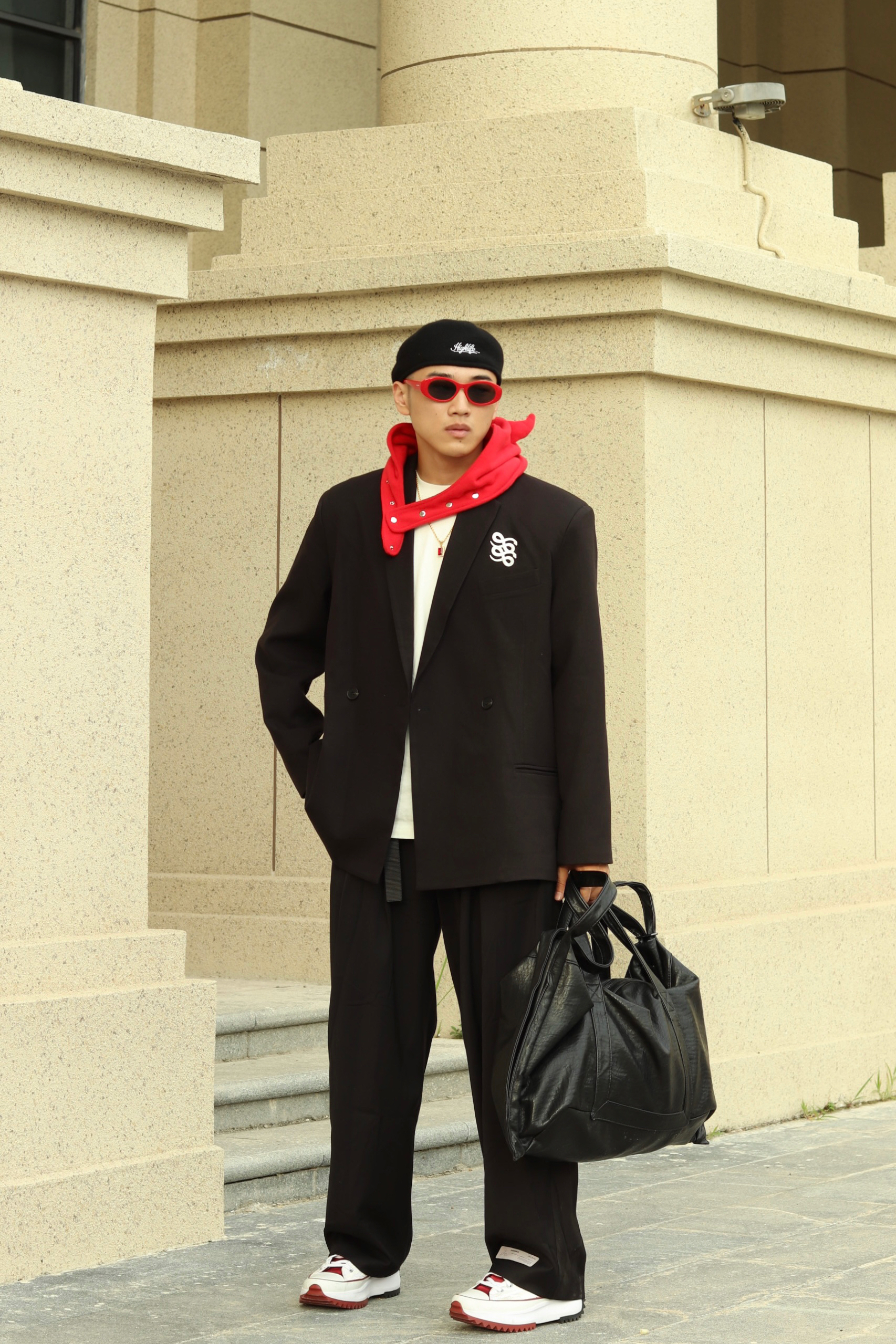 halo大家 这里是不会唱歌的章鱼章鱼哥 今天章鱼给大家分享一套 西装穿搭 来看看我的搭配 上身一件廓形黑色西装 搭配一条慵懒阔腿黑裤 鞋子选择一双匡威白红 最后一顶小恶魔头套和麂皮包 穿搭小tips 整体以西装穿搭 用头套和板鞋来增加日常感 整体就不会太正式