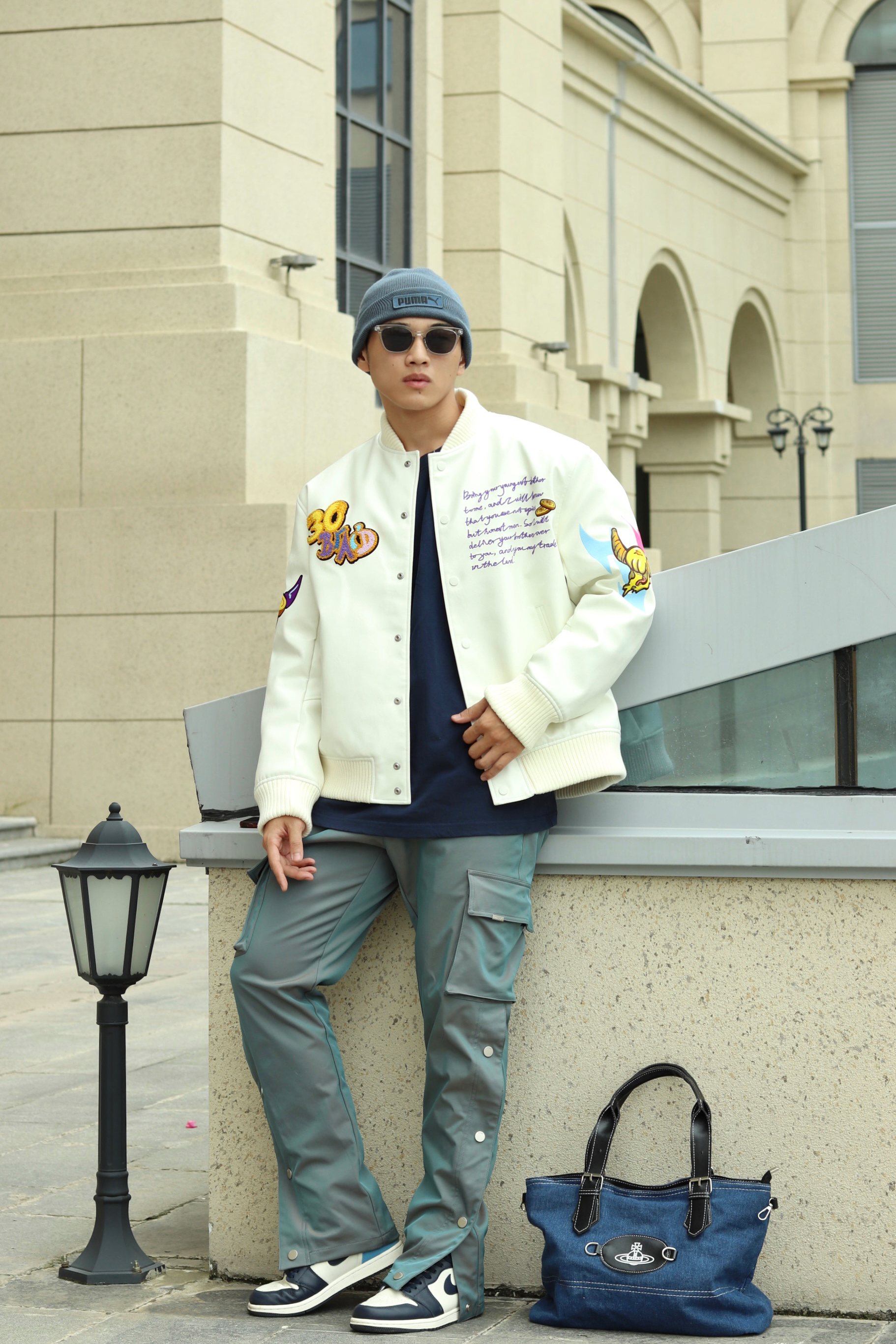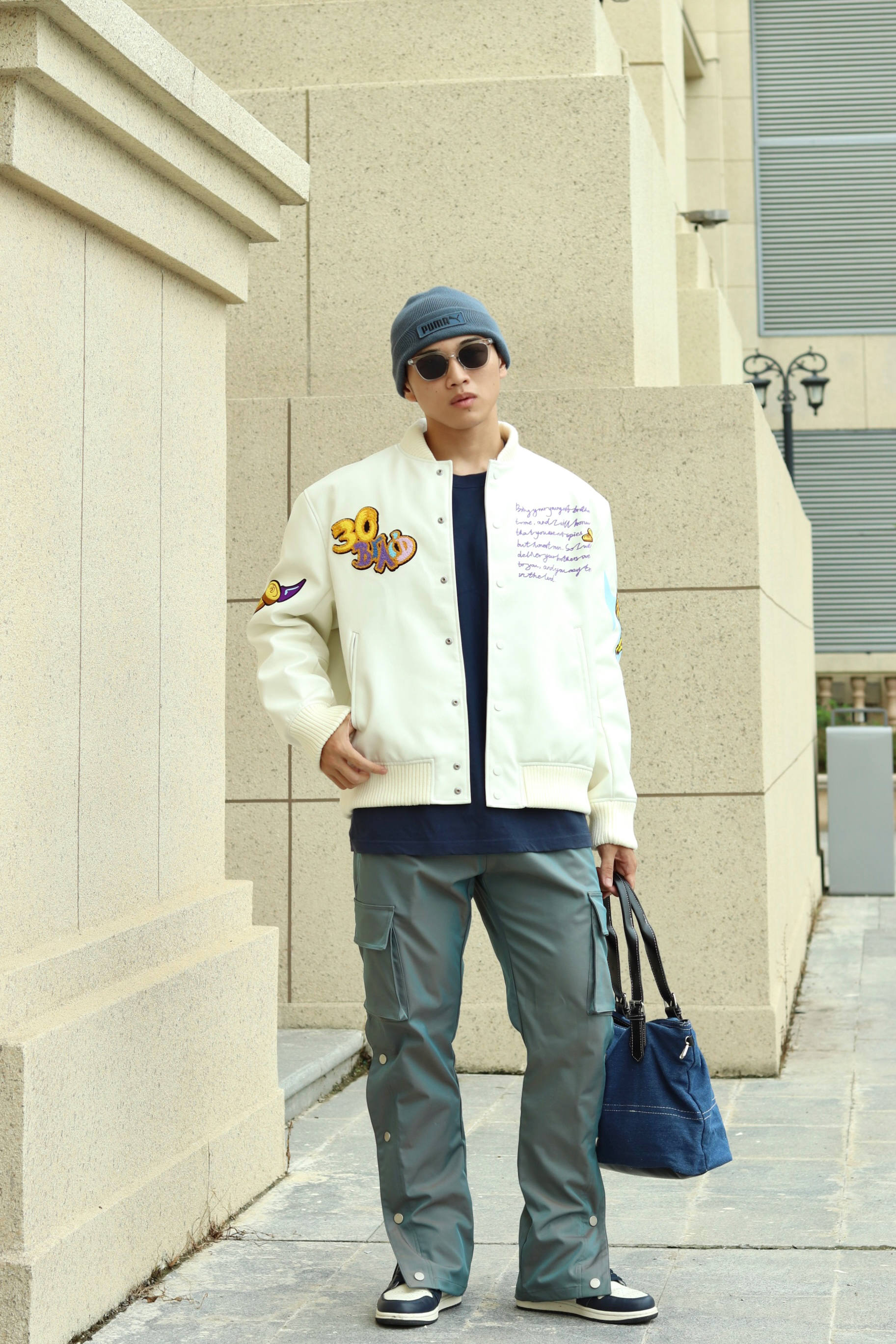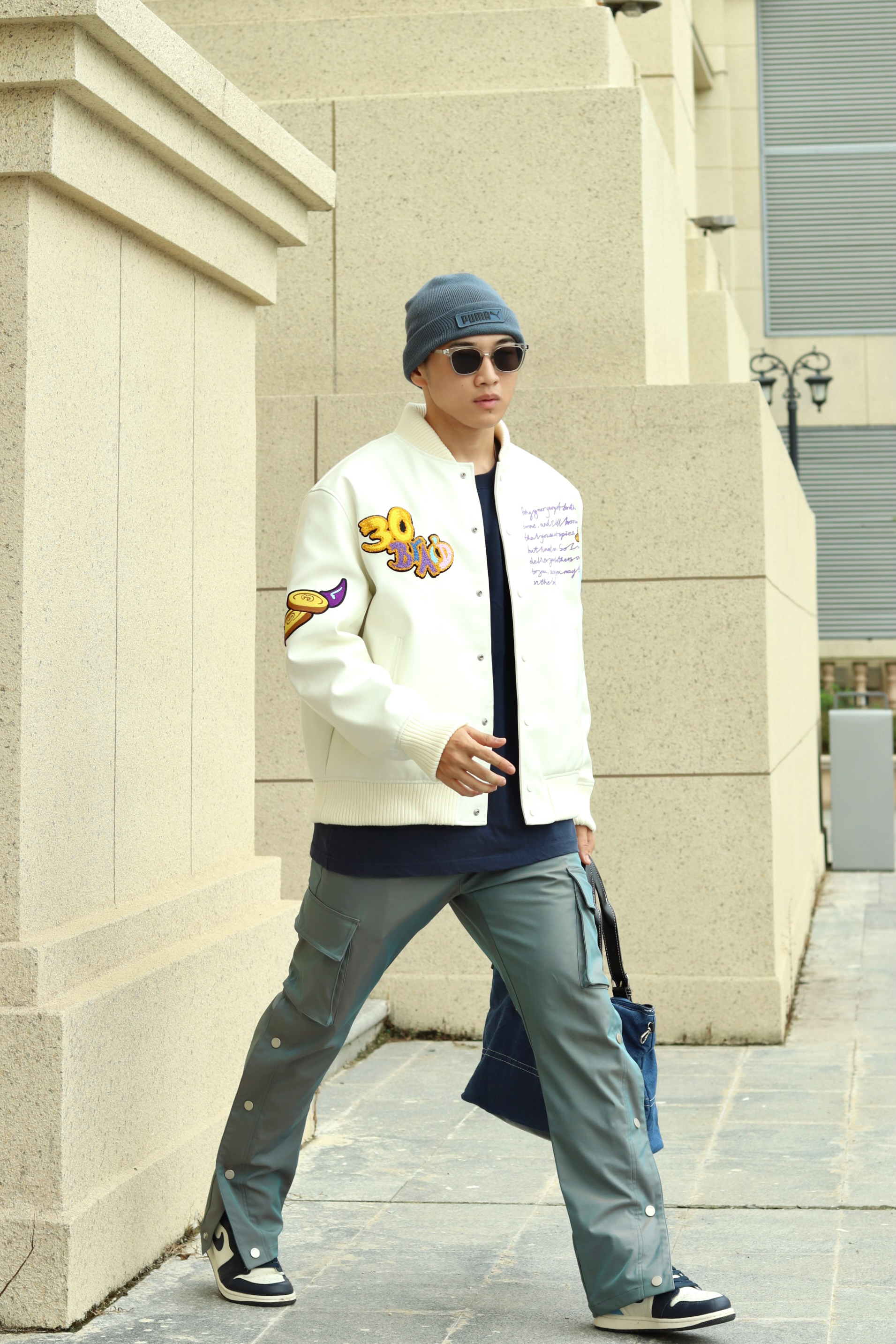 halo大家 这里是不会唱歌的章鱼章鱼哥 今天章鱼收到了一件美式的棒球服 来给大家出一套美式球员风穿搭 上身一件藏青色T恤打底 外穿一件白色刺绣棒球服 裤子搭一条尼龙排扣卫裤 鞋子选择一双北卡蓝黑曜石 最后一顶同色系冷帽和蓝牛仔包包 穿搭小tips 美式球员必备秋冬棒球服 搭配排扣束脚卫裤加黑曜石 妥妥美式球员风穿搭