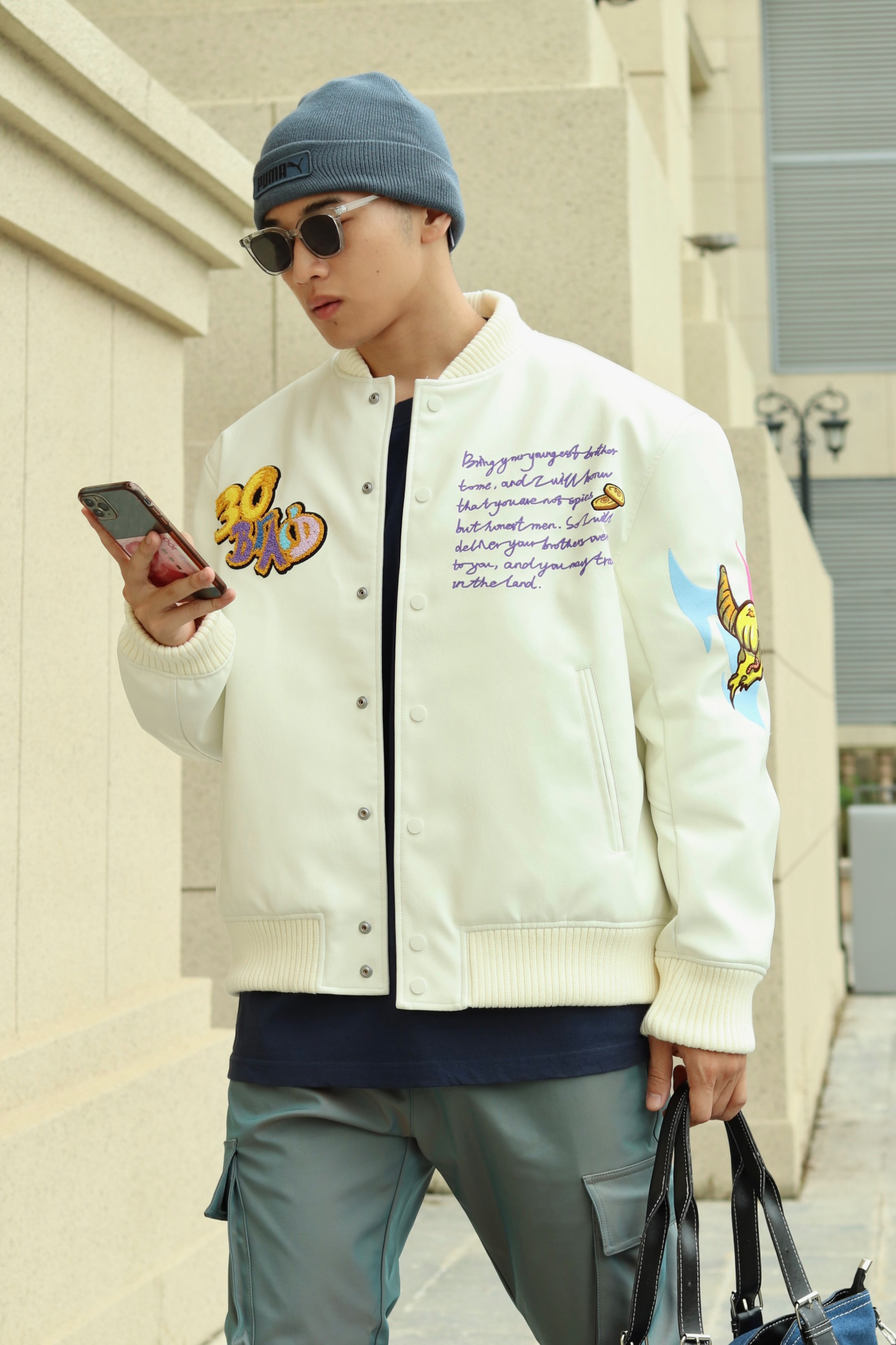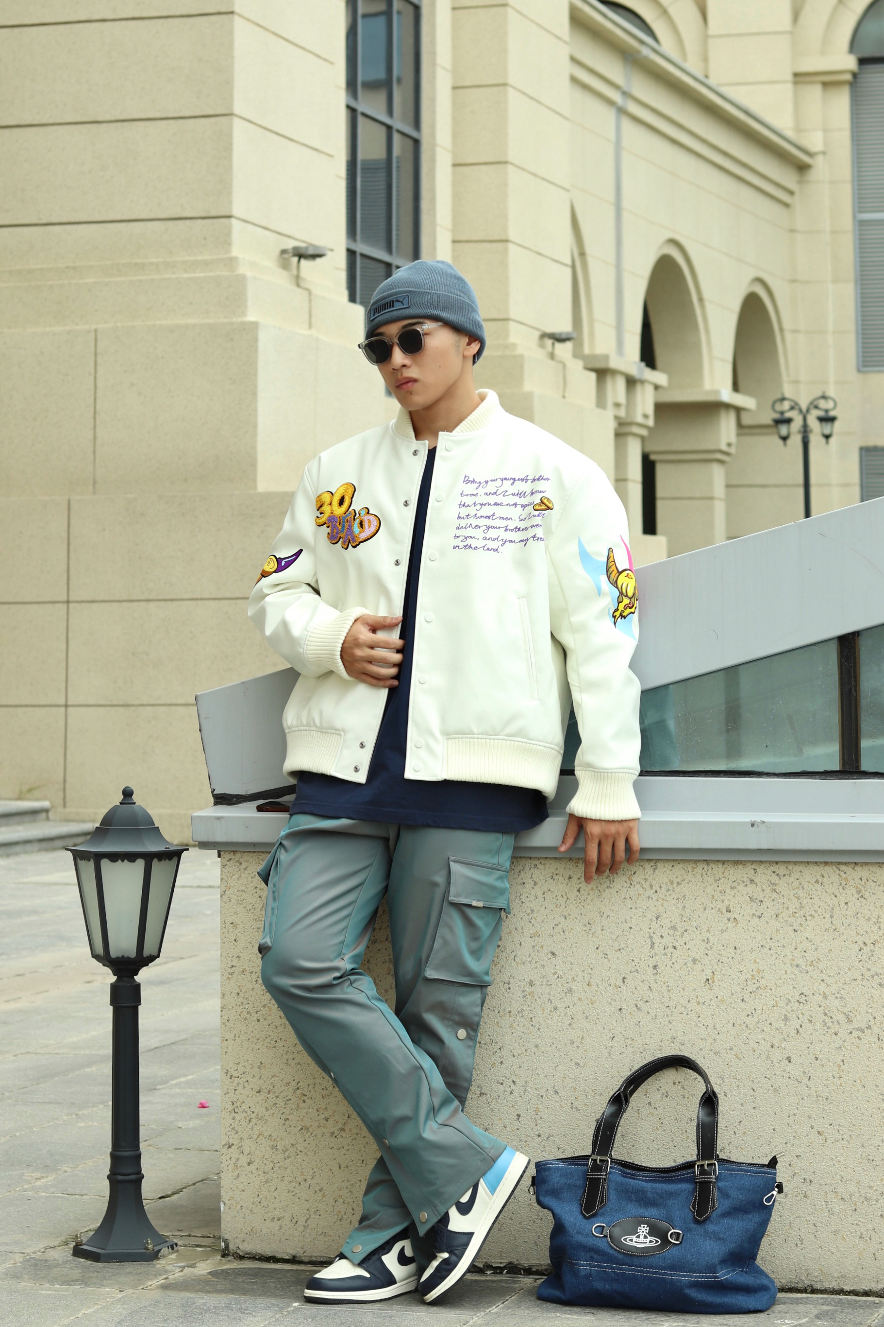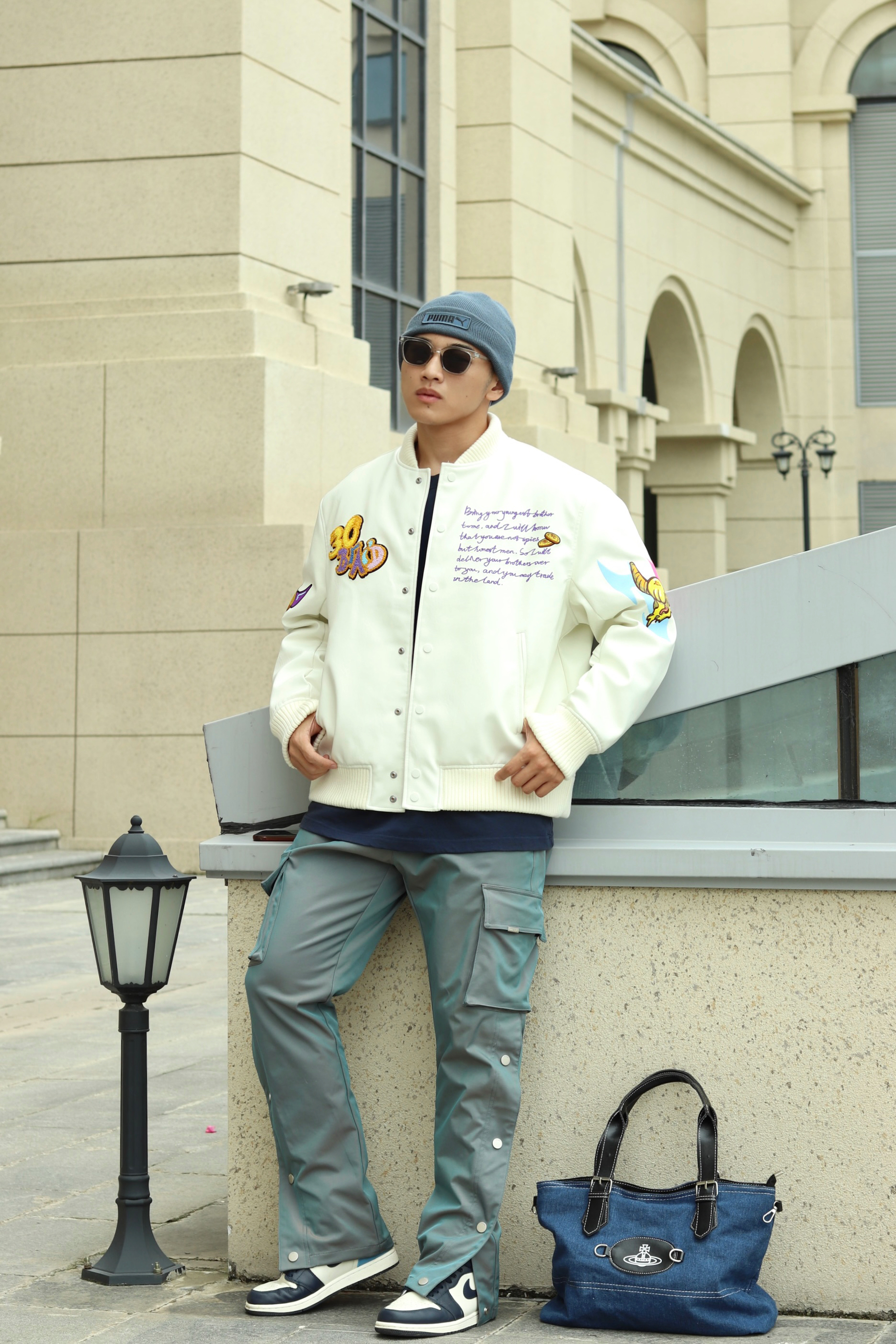 halo大家 这里是不会唱歌的章鱼章鱼哥 今天章鱼收到了一件美式的棒球服 来给大家出一套美式球员风穿搭 上身一件藏青色T恤打底 外穿一件白色刺绣棒球服 裤子搭一条尼龙排扣卫裤 鞋子选择一双北卡蓝黑曜石 最后一顶同色系冷帽和蓝牛仔包包 穿搭小tips 美式球员必备秋冬棒球服 搭配排扣束脚卫裤加黑曜石 妥妥美式球员风穿搭