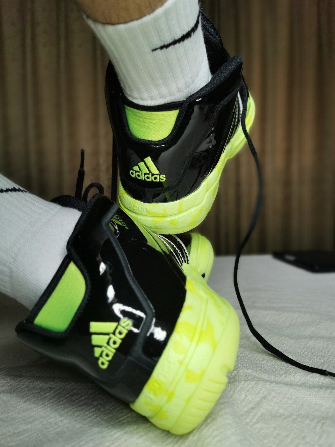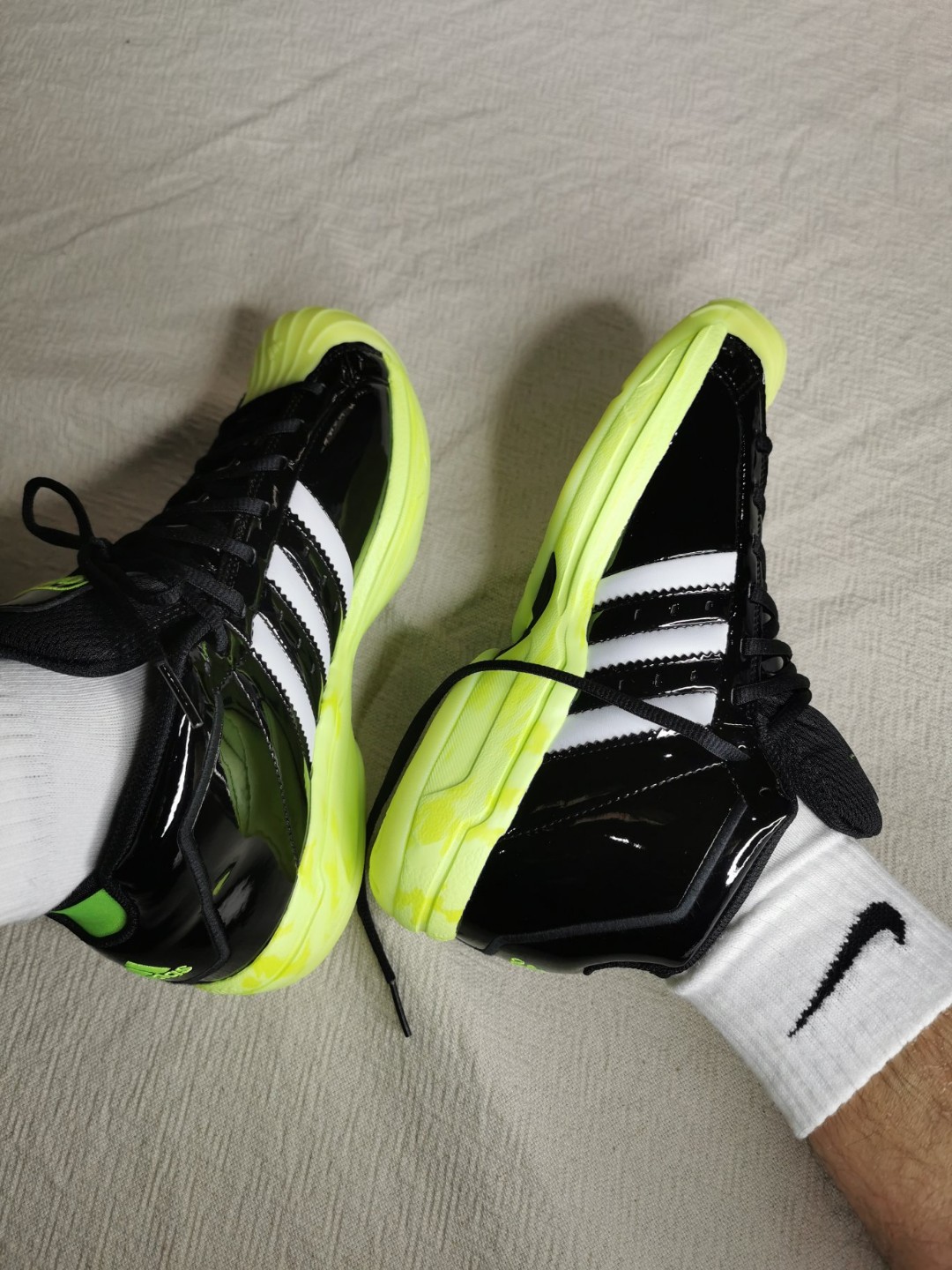 贝壳头篮球鞋承载了很多鞋友的记忆,这双延续了漆皮鞋身的设计,亮黄色的贝壳头和外底非常吸睛,关键在贝壳头和外底上同时采用了夜光设计,真的很赞~😊上脚的包裹感不错,后跟填充也很厚实,脚不是特别宽脚背不是特别高的话基本上按正常码买就OK了~