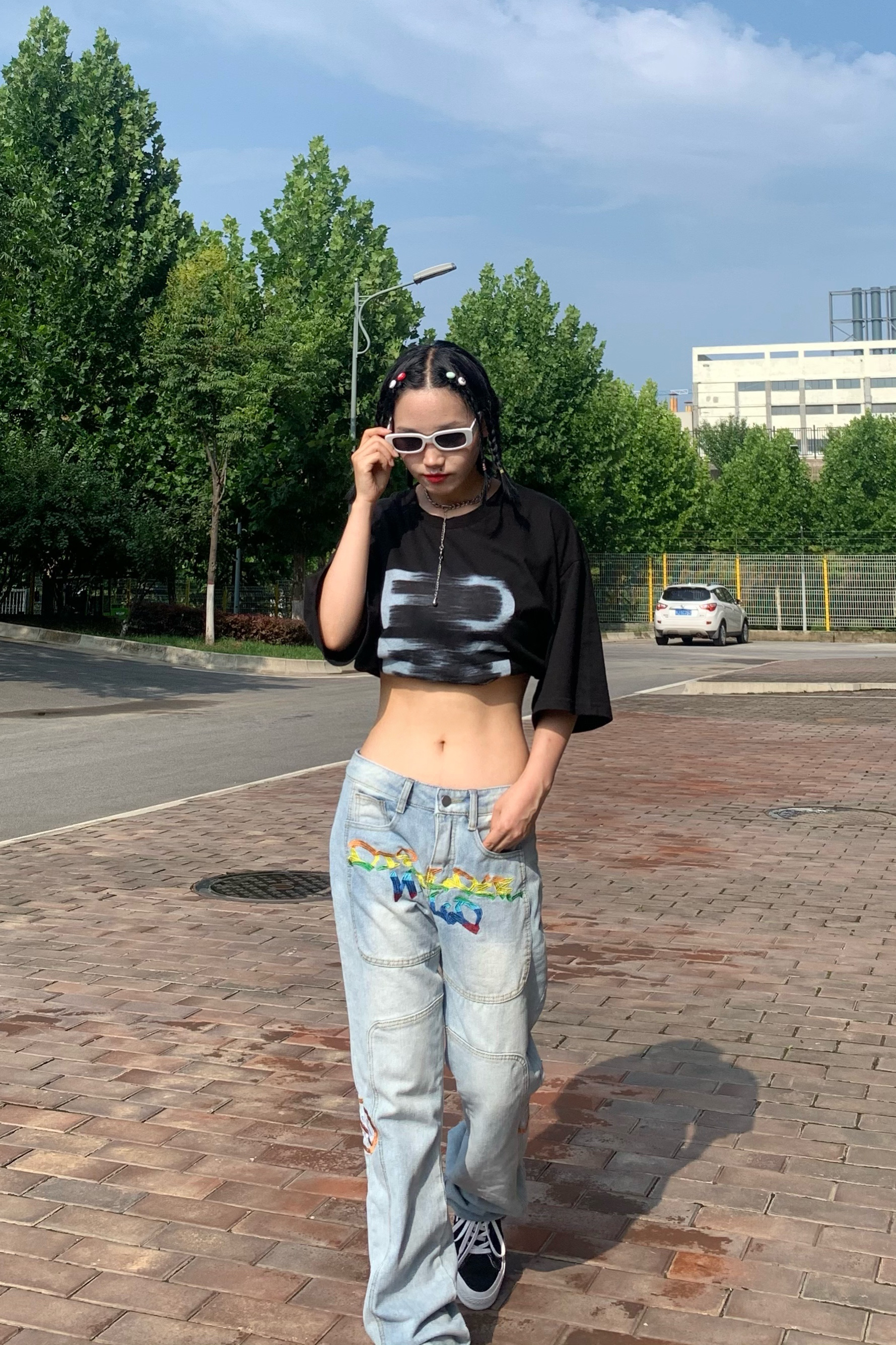 怀念夏天的马甲线 热爱运动的女孩 宽松加牛仔裤真的很难不爱 跳舞的时候穿真的很酷