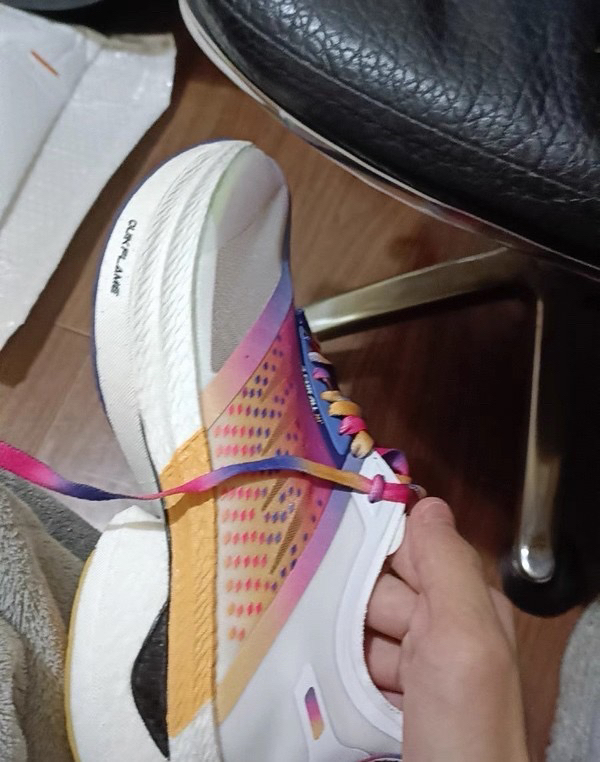 这款361度飞飚试穿偏大,适合买小半码的,不然不跟脚,用跑者结系法可以减小掉后跟的情况 ,我这款配色很不错