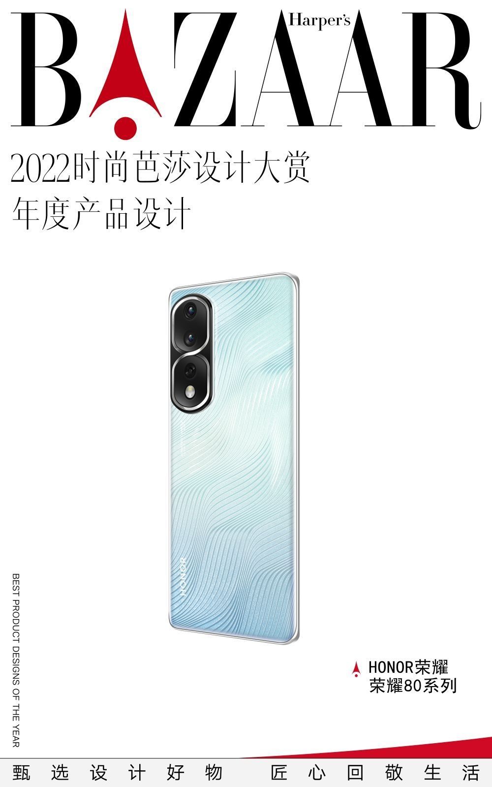 用线条与光影之美演绎创新,科技与艺术在掌心之间完美交融、互相成就。#荣耀80#系列荣膺2022#时尚芭莎设计大赏#“年度产品设计”手机大奖,以匠心之作回敬生活,成为新一代手机美学标杆。