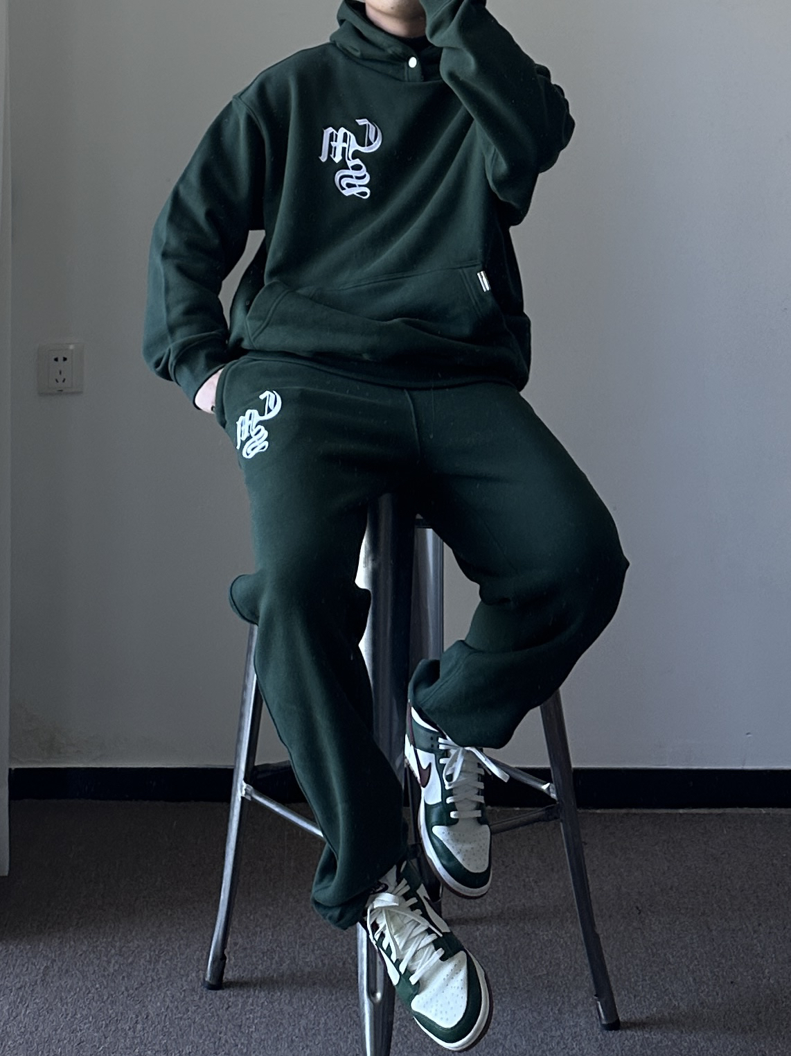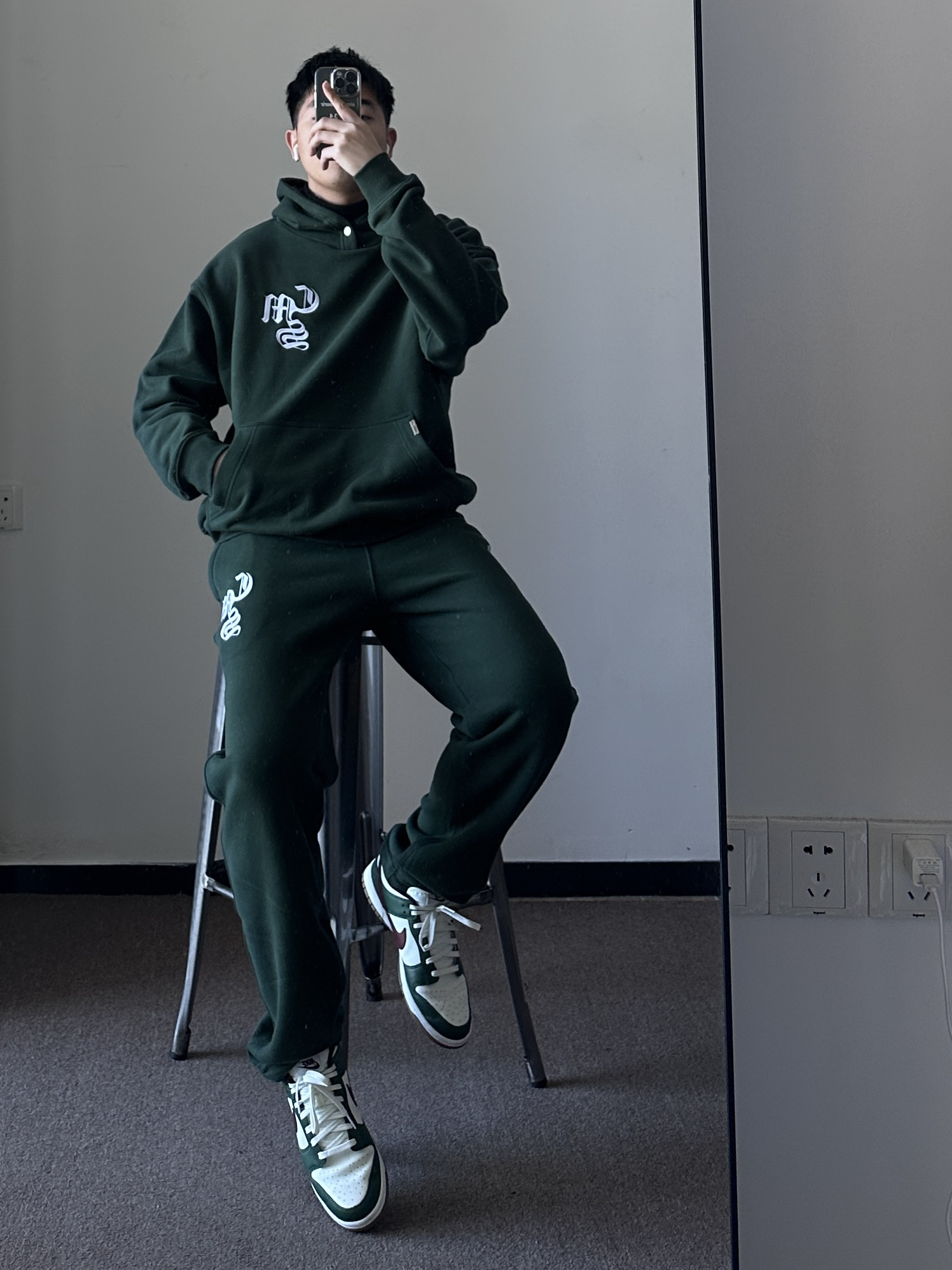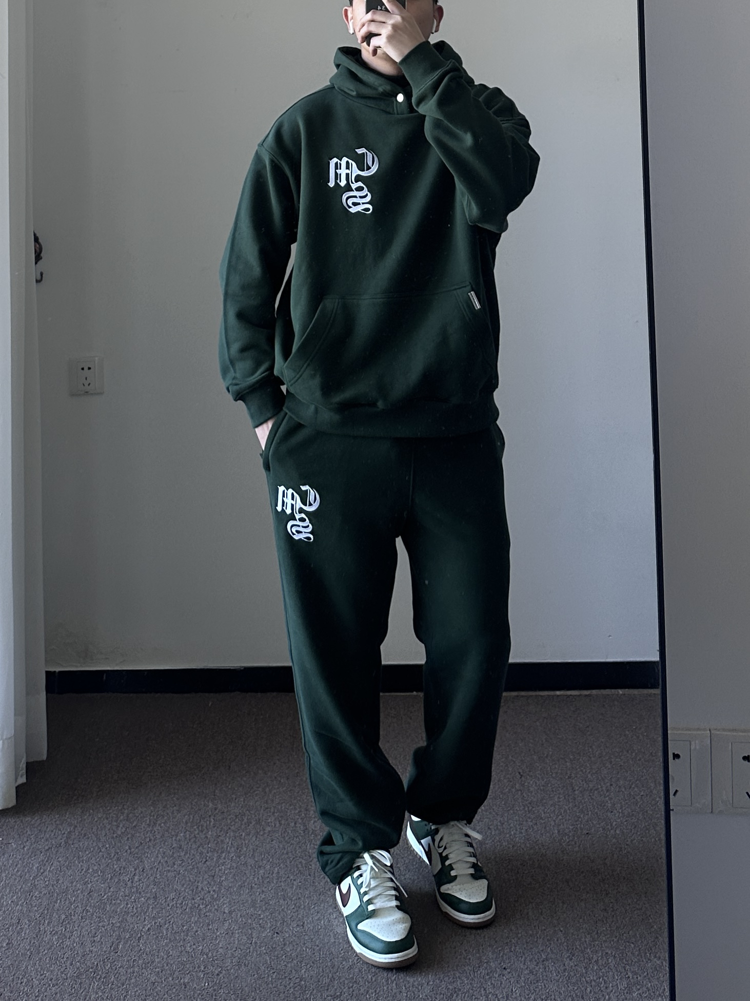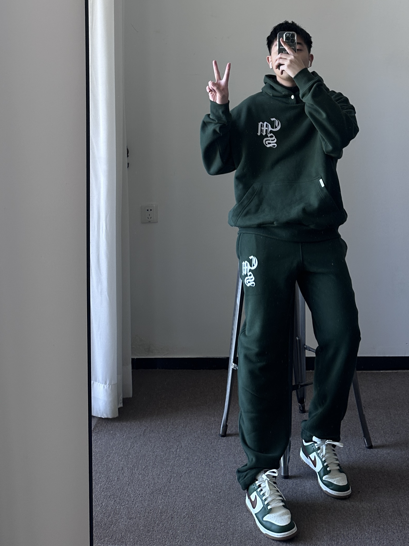 素人也能好看系列~ 174cm/65kg 🧥-墨绿色的同色系上身,运动风max,胸前是刺绣,密度可以~卫衣上身M。 👖-同色系的直筒棉裤,上身M。 👟- dunk、小白鞋也行啊~