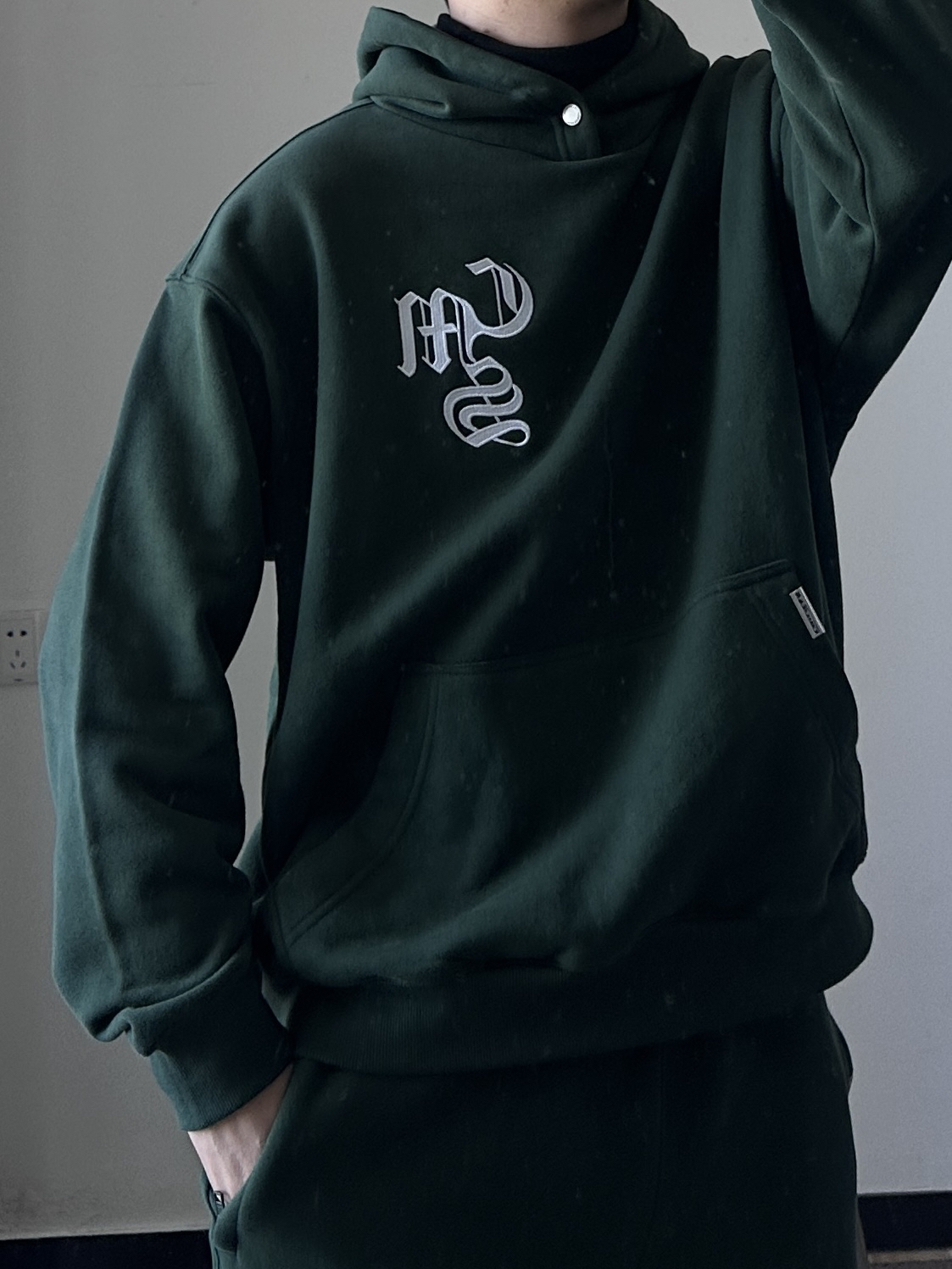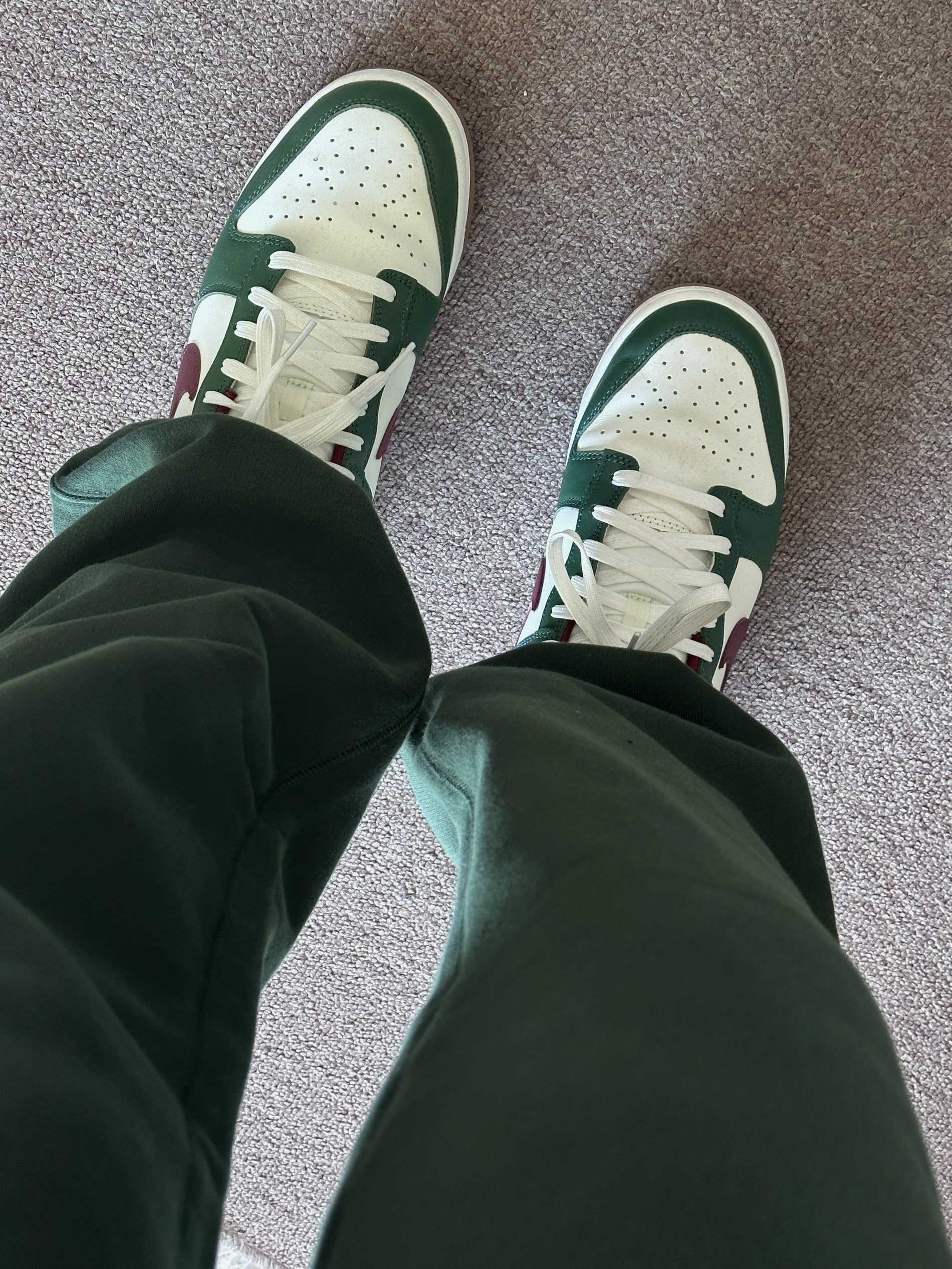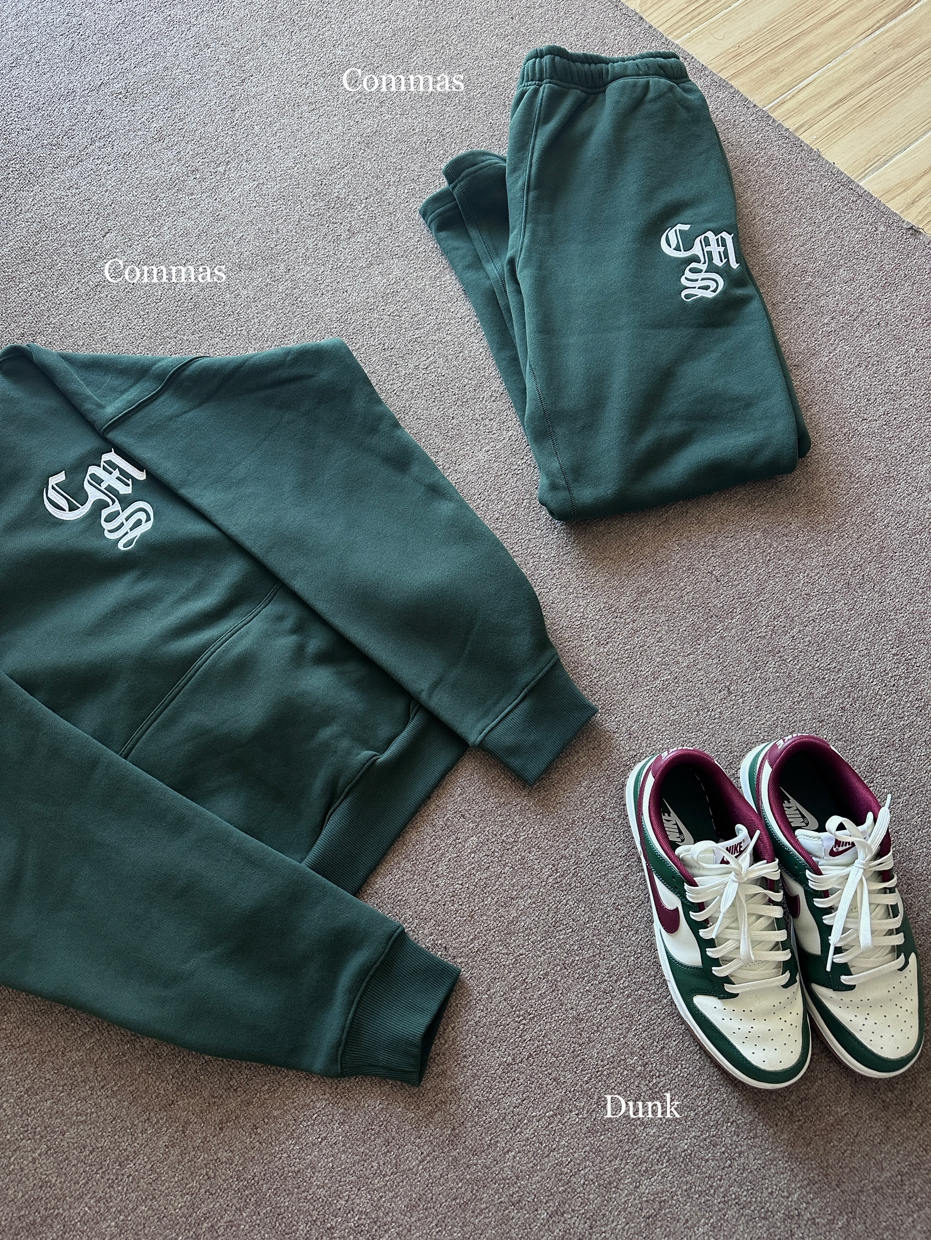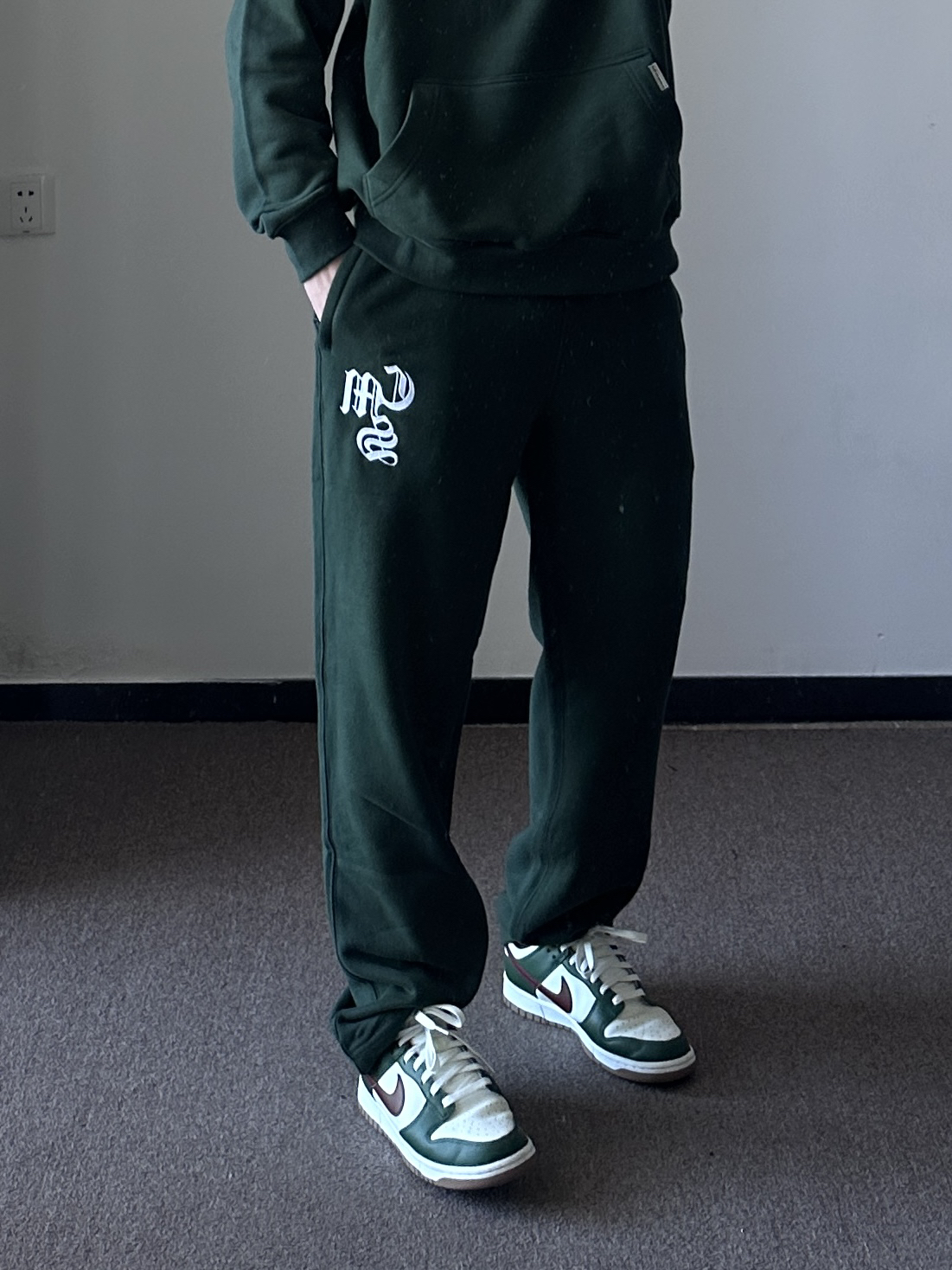 素人也能好看系列~ 174cm/65kg 🧥-墨绿色的同色系上身,运动风max,胸前是刺绣,密度可以~卫衣上身M。 👖-同色系的直筒棉裤,上身M。 👟- dunk、小白鞋也行啊~