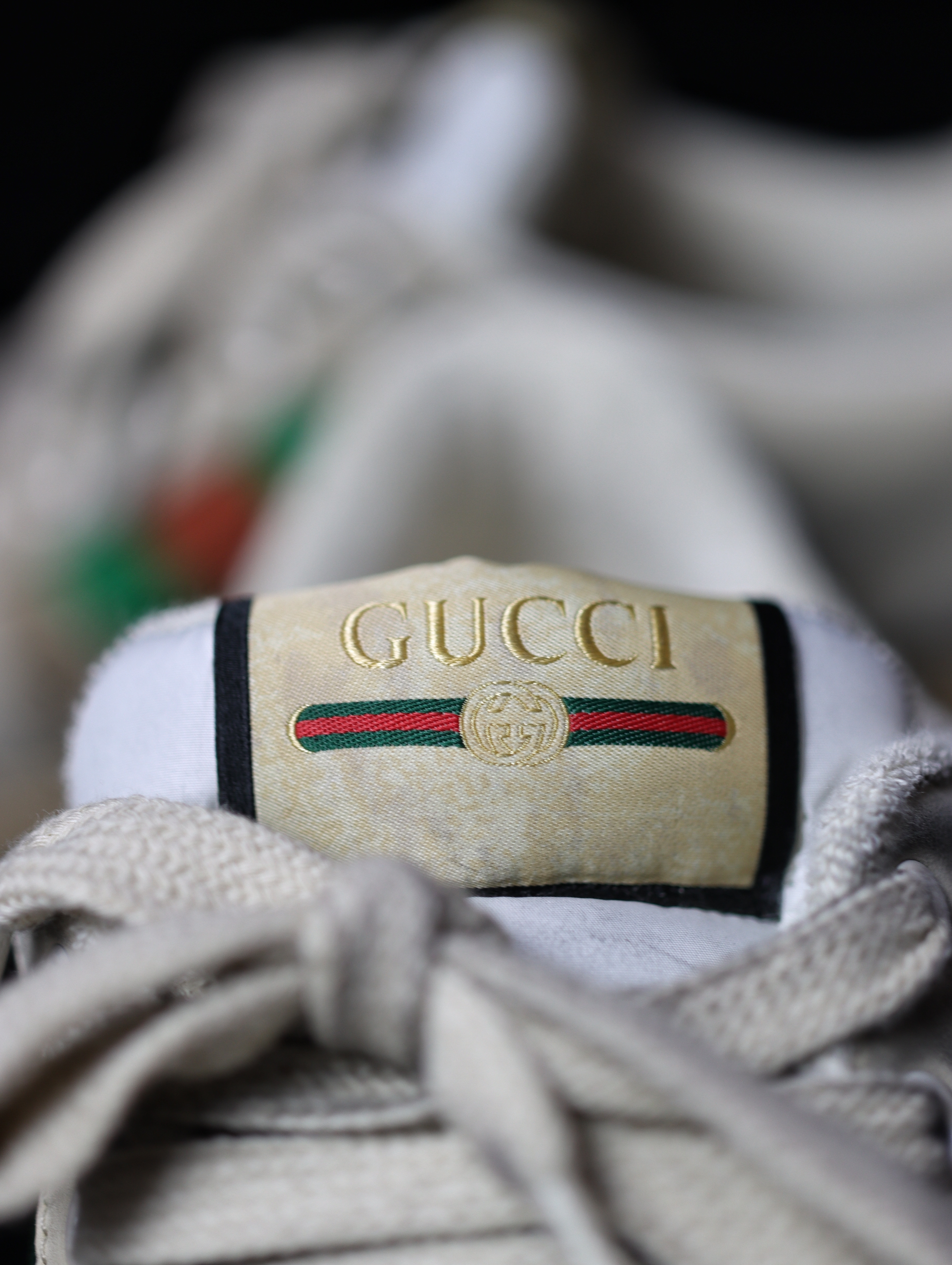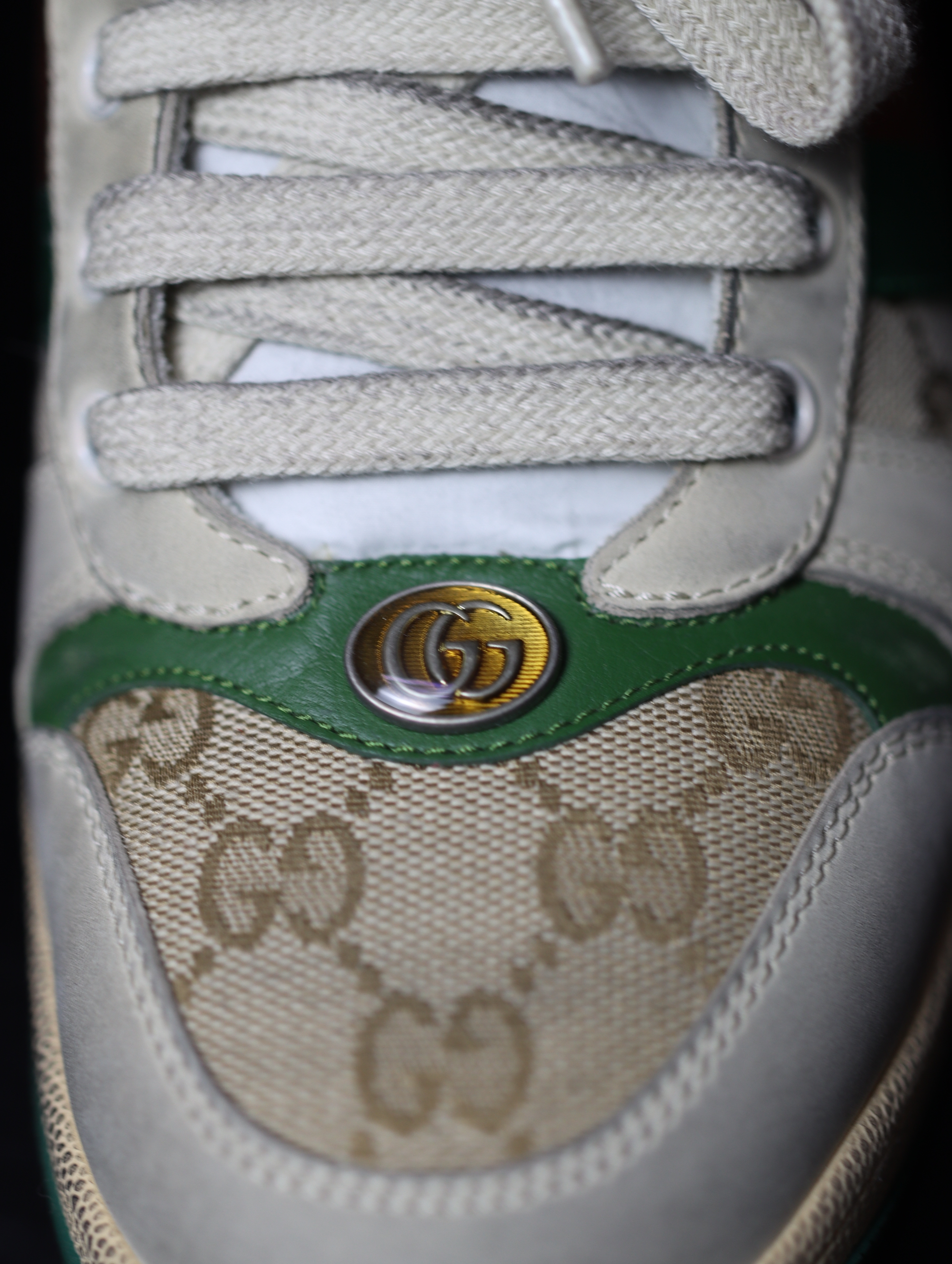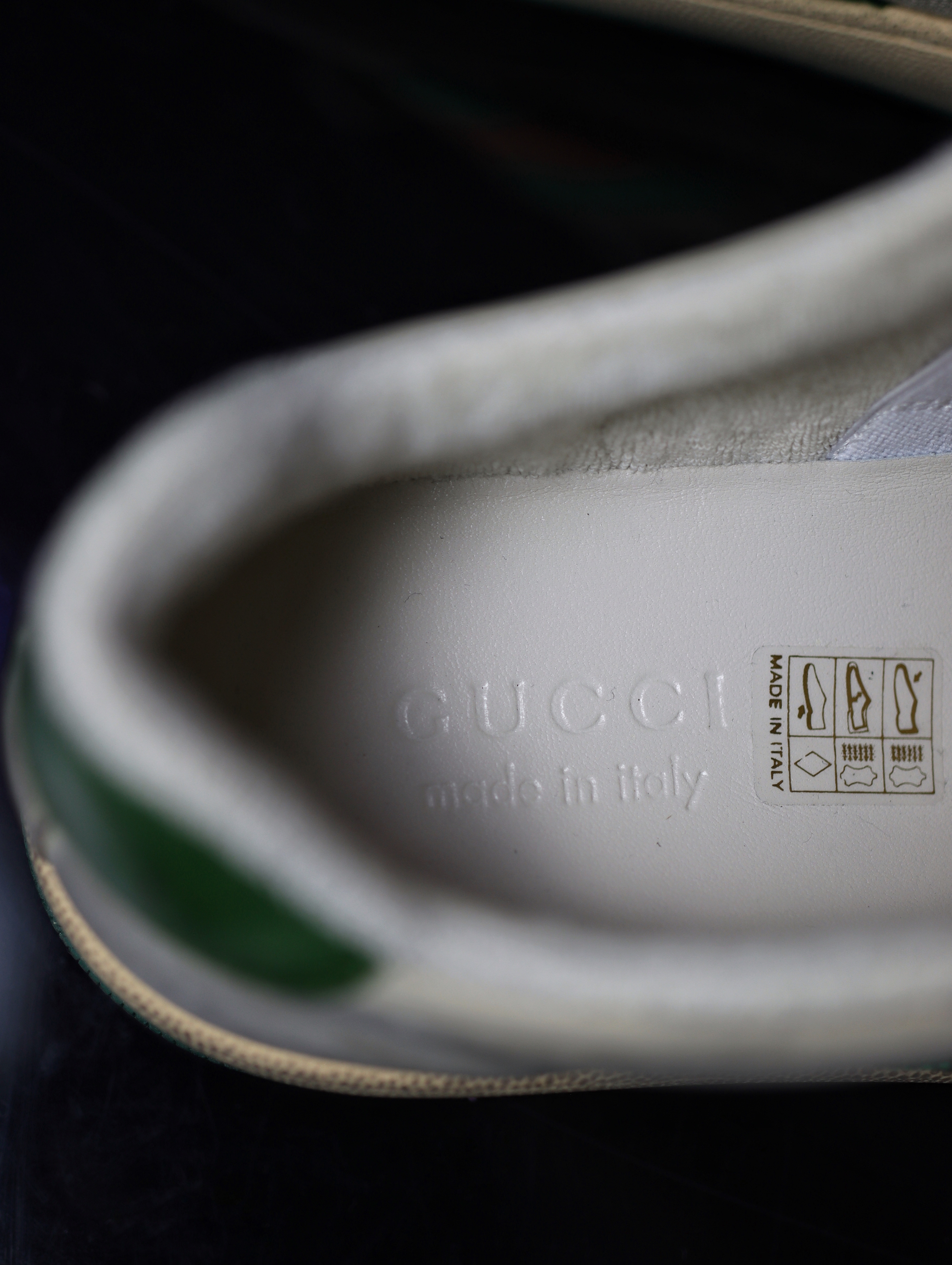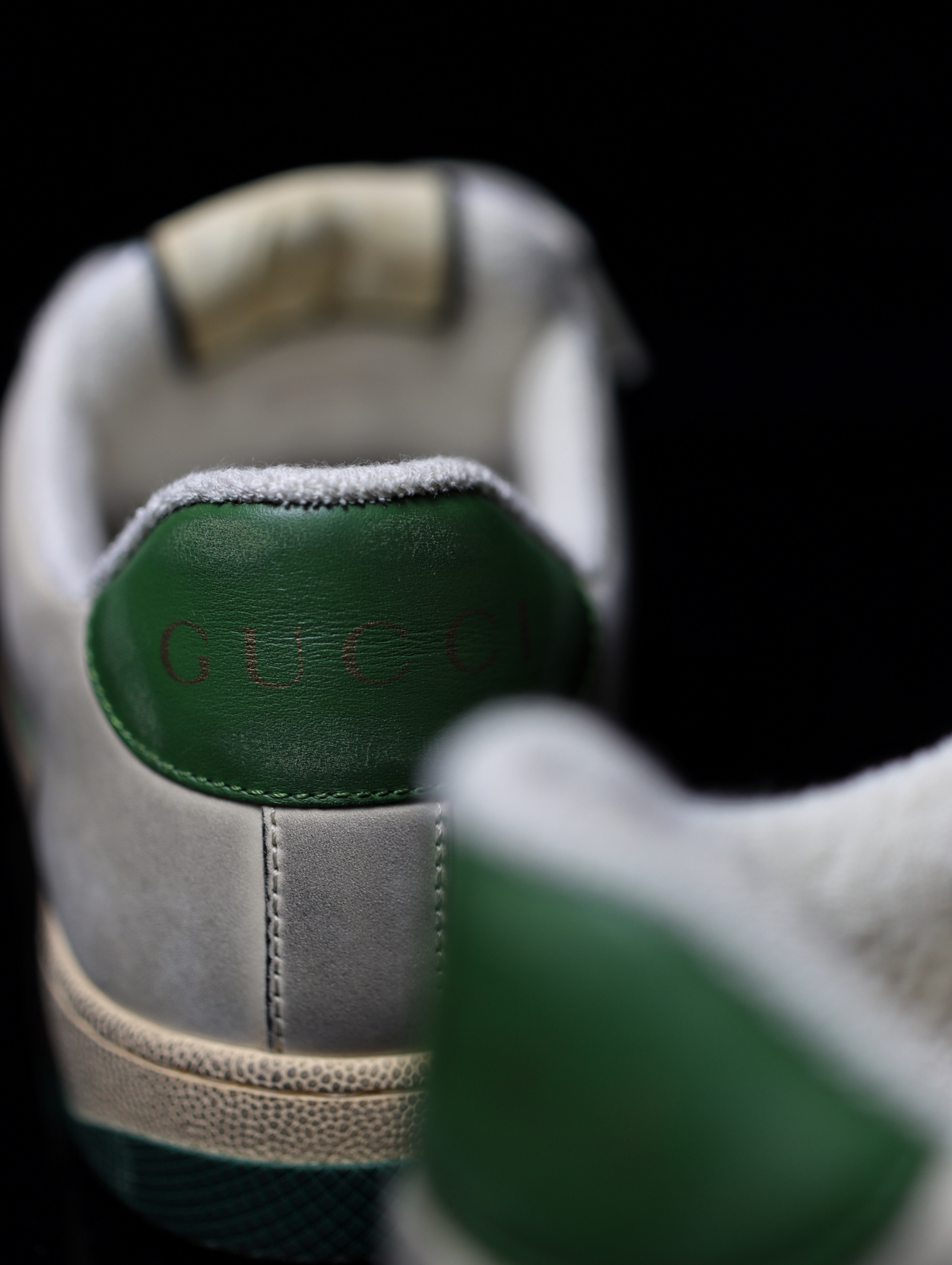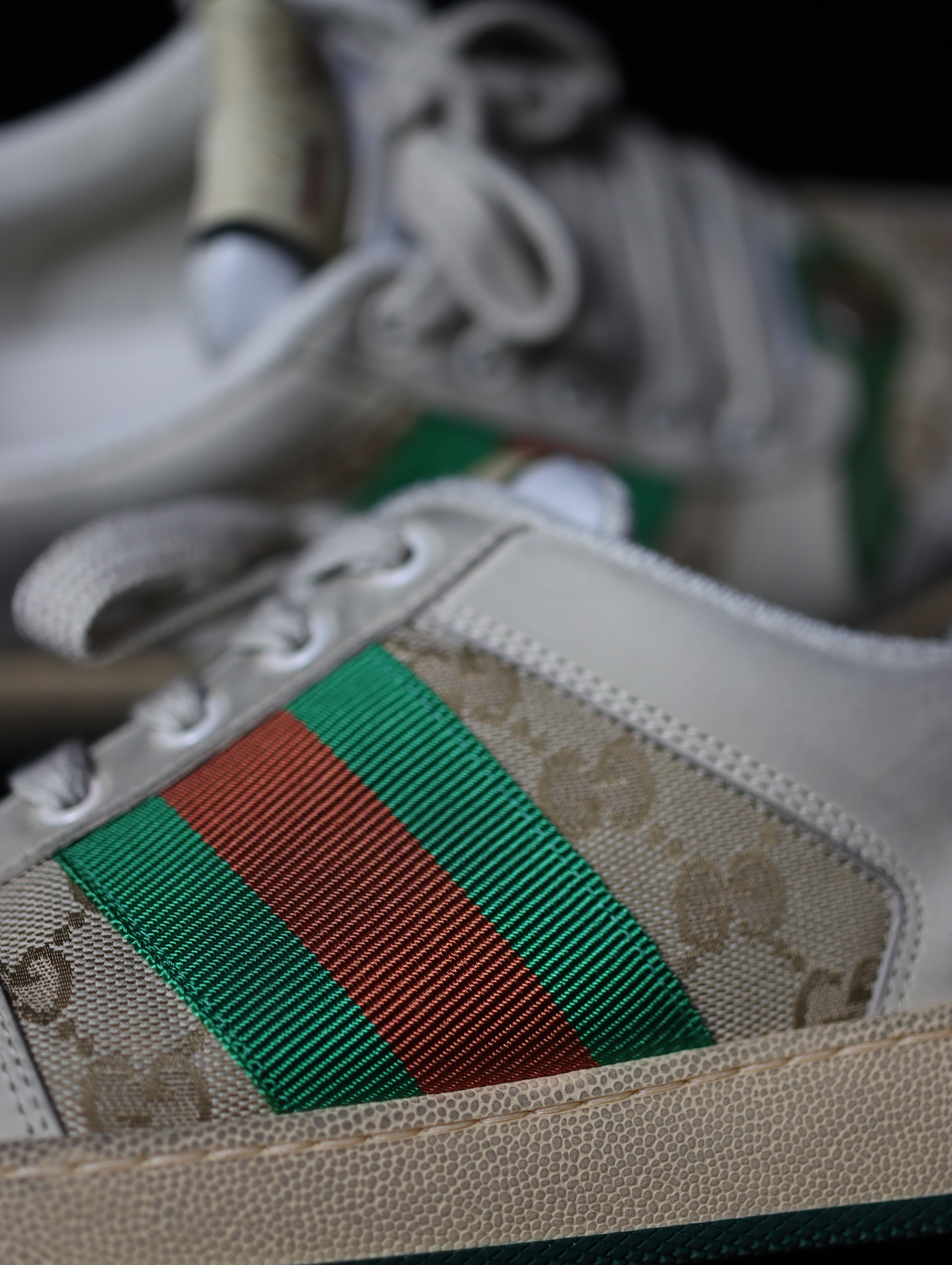 鞋款名称:GUCCI Screener系列 做旧脏脏板鞋 鞋款介绍:这双鞋子可以说是GUCCI最经典的单品了,鞋子的整体给人一种非常复古的感觉,经典的做旧设计搭配侧边辨识度极高的GUCCi三条杠设计,整体配色也是非常的百搭。