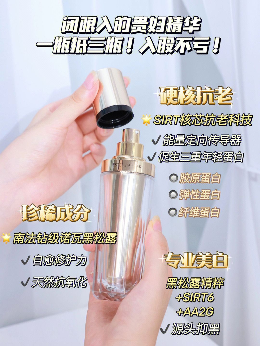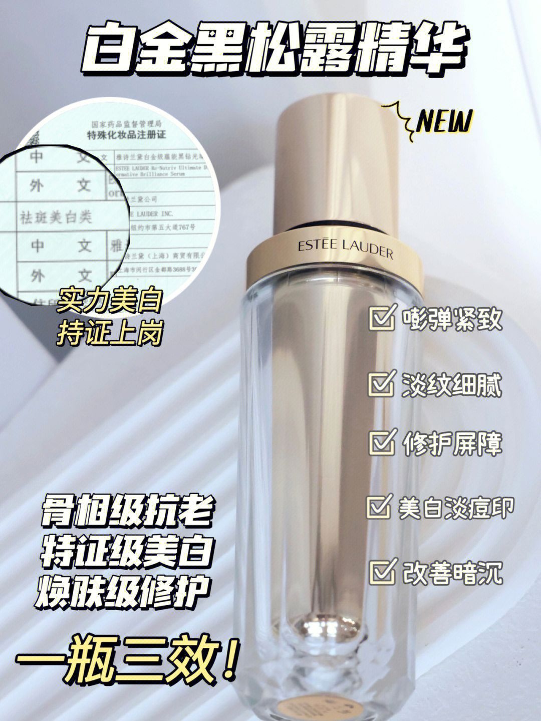 作为了一个25+的小姐姐, 明显感觉到现在已经单一的功效满足不了皮肤的需求 不仅是抗老,也需要修护、提亮、解决暗沉和松垮的问题! 我也是在抗老的路上走了很多路 对我来说美白、修护和抗老同样都很重要 现在大部分都是单一成分的精华 每次一层层的精华怼脸上💔直接搓泥,闷痘 后续上妆更是灾难❌ 一直就有这种困扰,为什么不可以三🈴一呢? 这不就让我等到了嘛!雅诗兰黛全新白金黑松露精华! - 用了一段时间真的...