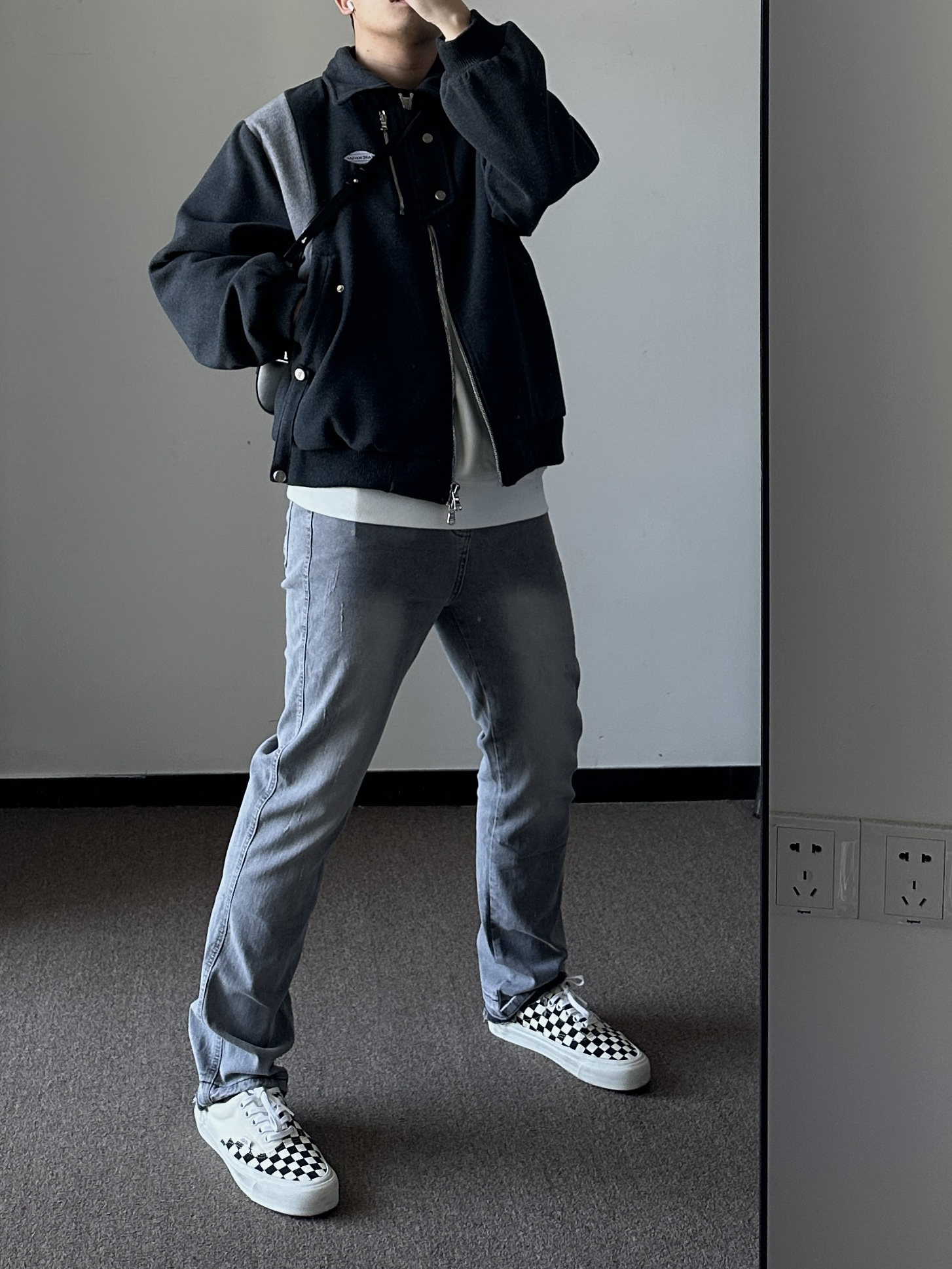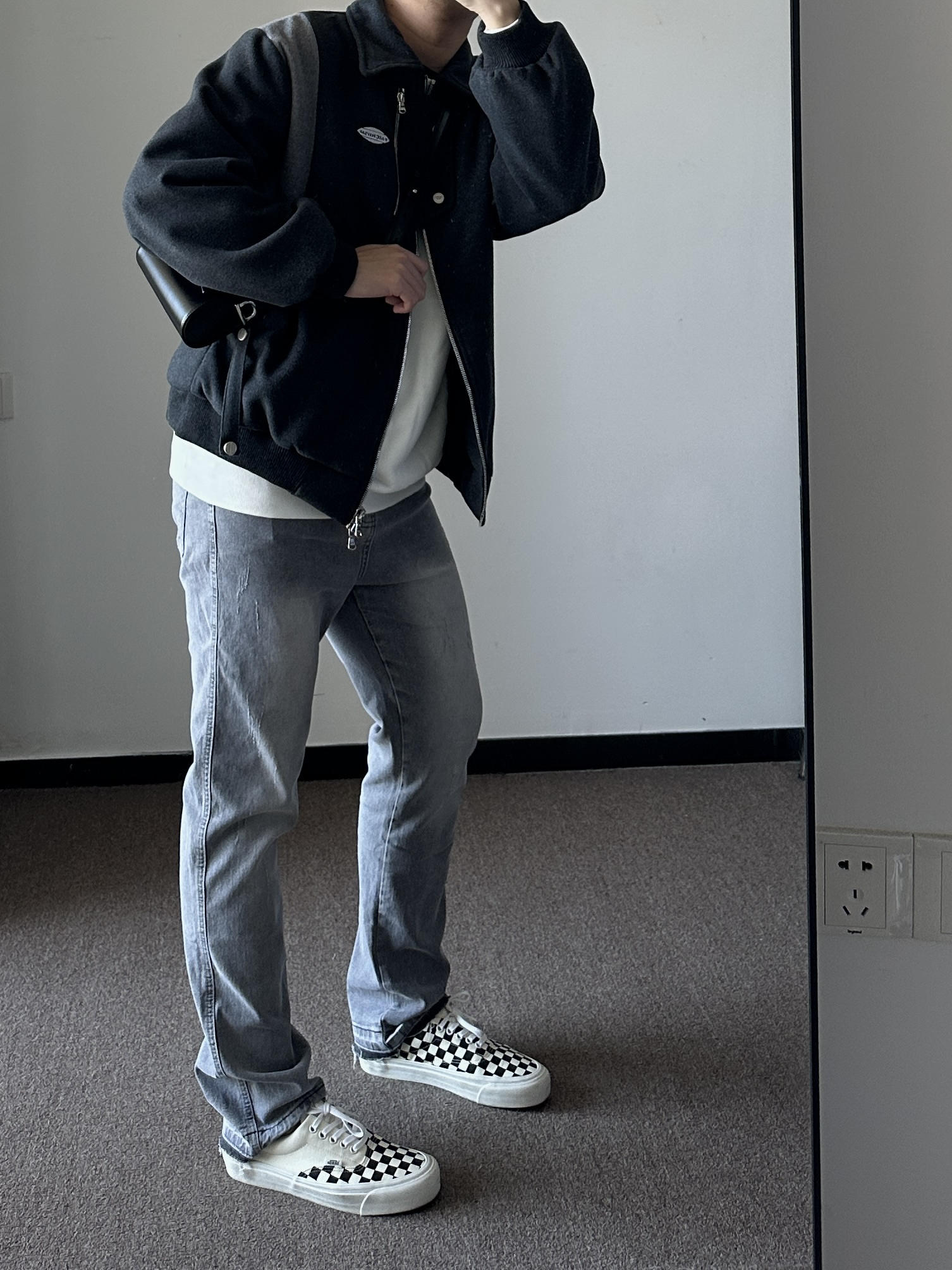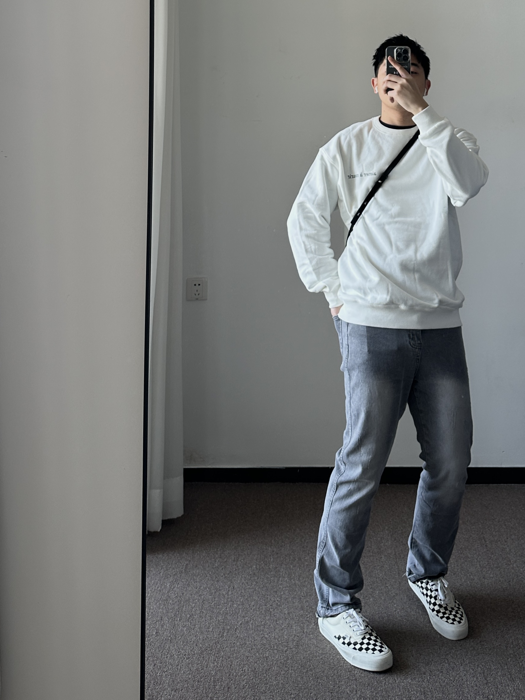 素人也能好看系列~ 174cm/65kg 🧥- 纯白色卫衣除了不耐脏之外,易撘性没问题。短款毛呢夹克,高街风必须整体倒三角。卫衣上身L,外套上身M。 👖- 微弹面料,修腿版型~ 👟- 挑鞋楦窄的,反季节买vans、匡威。真香~