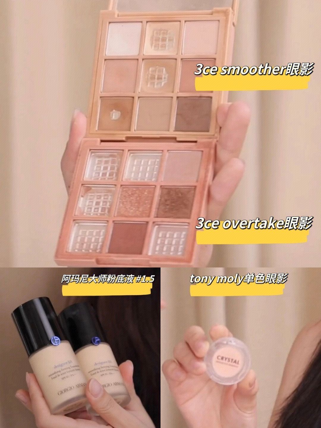 本篇笔记关联了3CE/三熹玉 细腻易上色九宫格眼影盘 哑光细闪九色纷呈 橘棕盘OVERTAKE 8.1g、【干皮/混干】GIORGIO ARMANI/阿玛尼 蓝标大师粉底液 紧颜细腻服帖 30ml 03 自然色 自然偏白肤色、JILL LEEN 缤纷柔雾腮红 提升气色哑光细闪 3g 18 梦幻腮紫等商品,为用户提供真实的使用体验和购买参考。