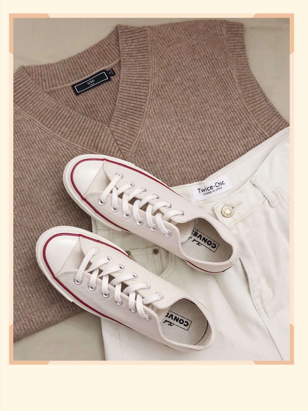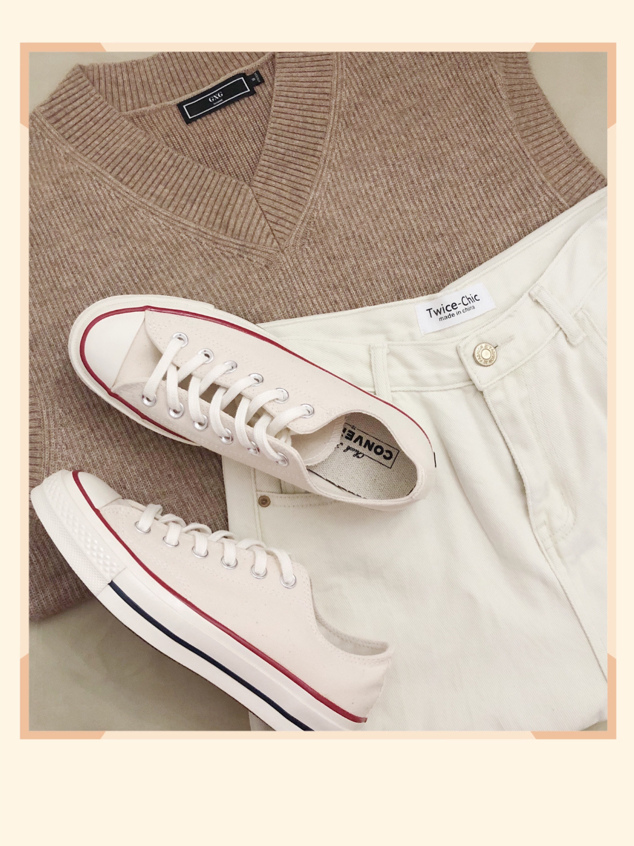 最难的就是选择这件事 粉色还是黄色?米色还是白色? 高帮还是低帮? 简直就是头疼的选择题 看了一眼有码,赶紧抢了啊 III米色低帮 相对于白色来说,这双米色其实更好配衣服因为1970s的鞋头不是纯白的颜色 纯白色的帆布鞋面,颜色有些跳跃不协调而米色恰好中和了这种不协调 搭配酒红色边框有种自然做旧的复古感!匡威一直入的是1970s,个人认为常青款 在鞋头的设计和脚感来说都没有197...