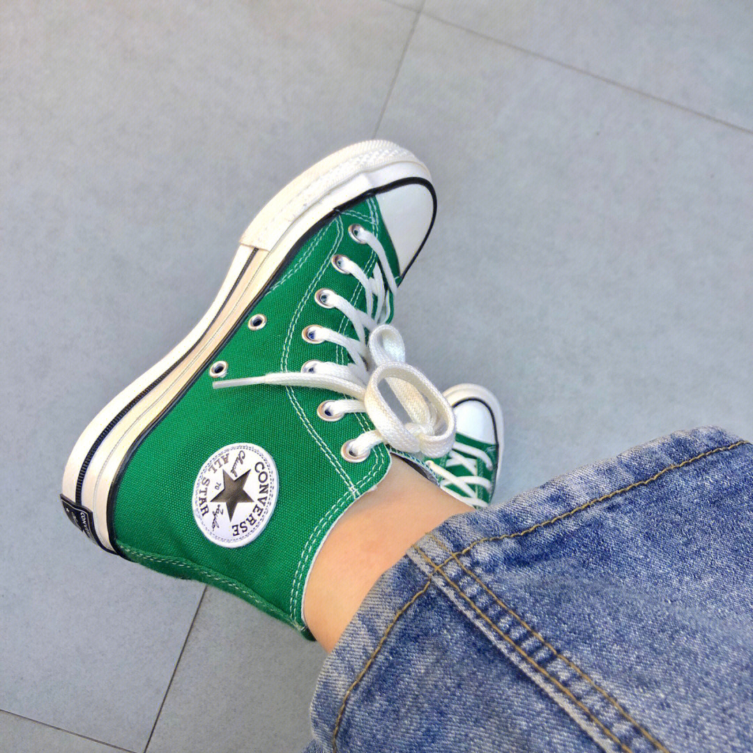 今年超喜欢绿色c 这双绿色高帮帆布鞋简直大爱 照片都是苹果原相机直出 实物比图片更翠绿一点(为了拍出原色我尽力了)基础款上有了一丝带有新鲜感的翠绿 简约又独特比那些黑白黄的匡威好看多了好嘛!!! 都应该有一-双甚至多双百搭的匡威百