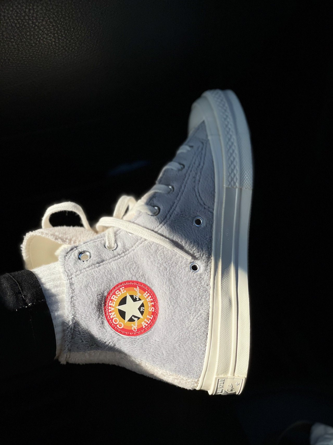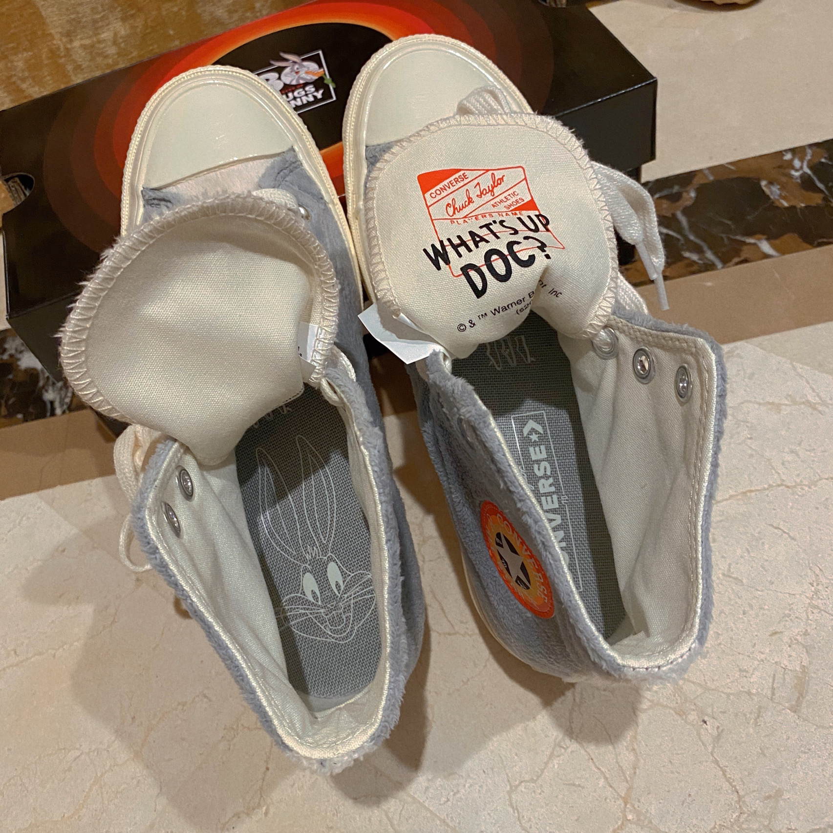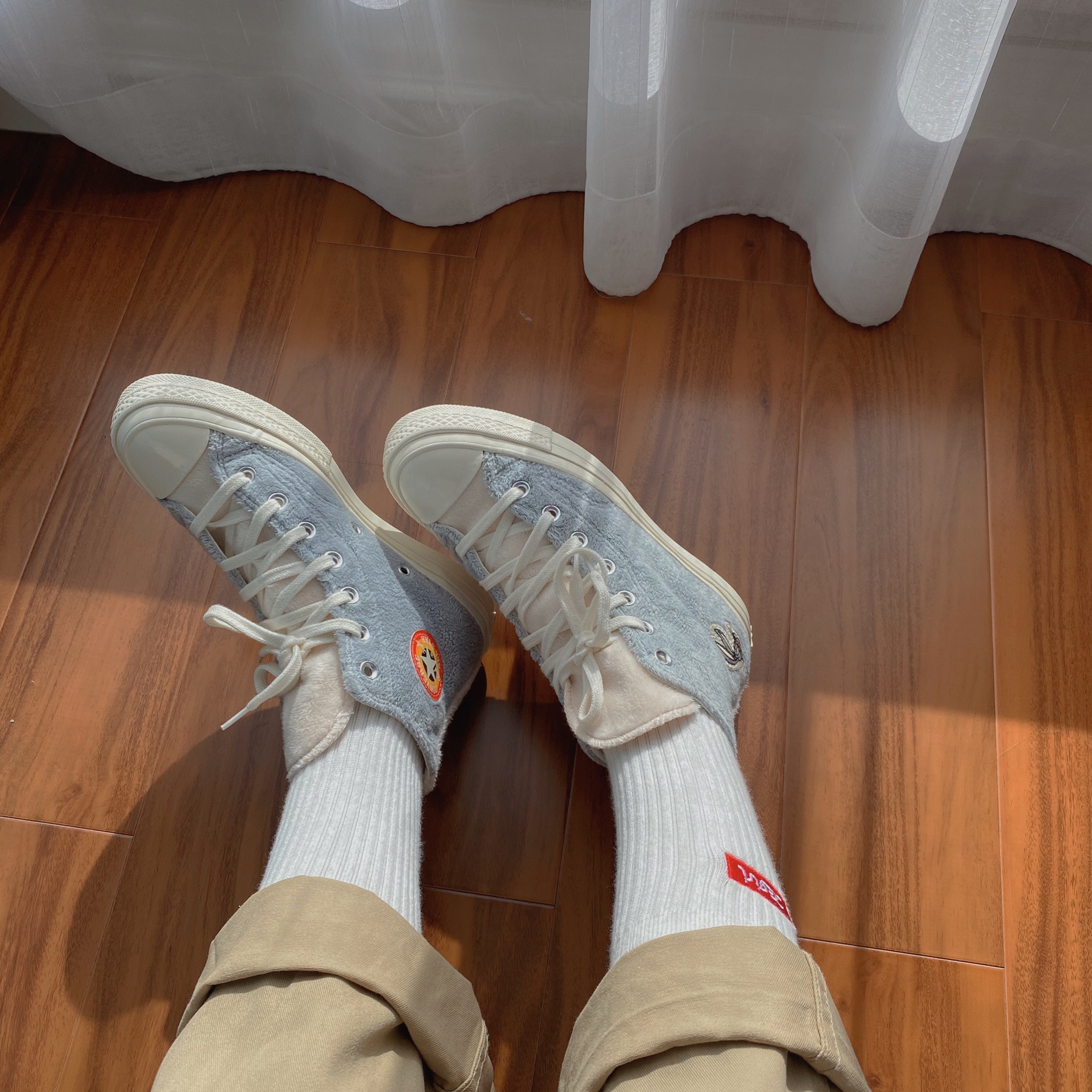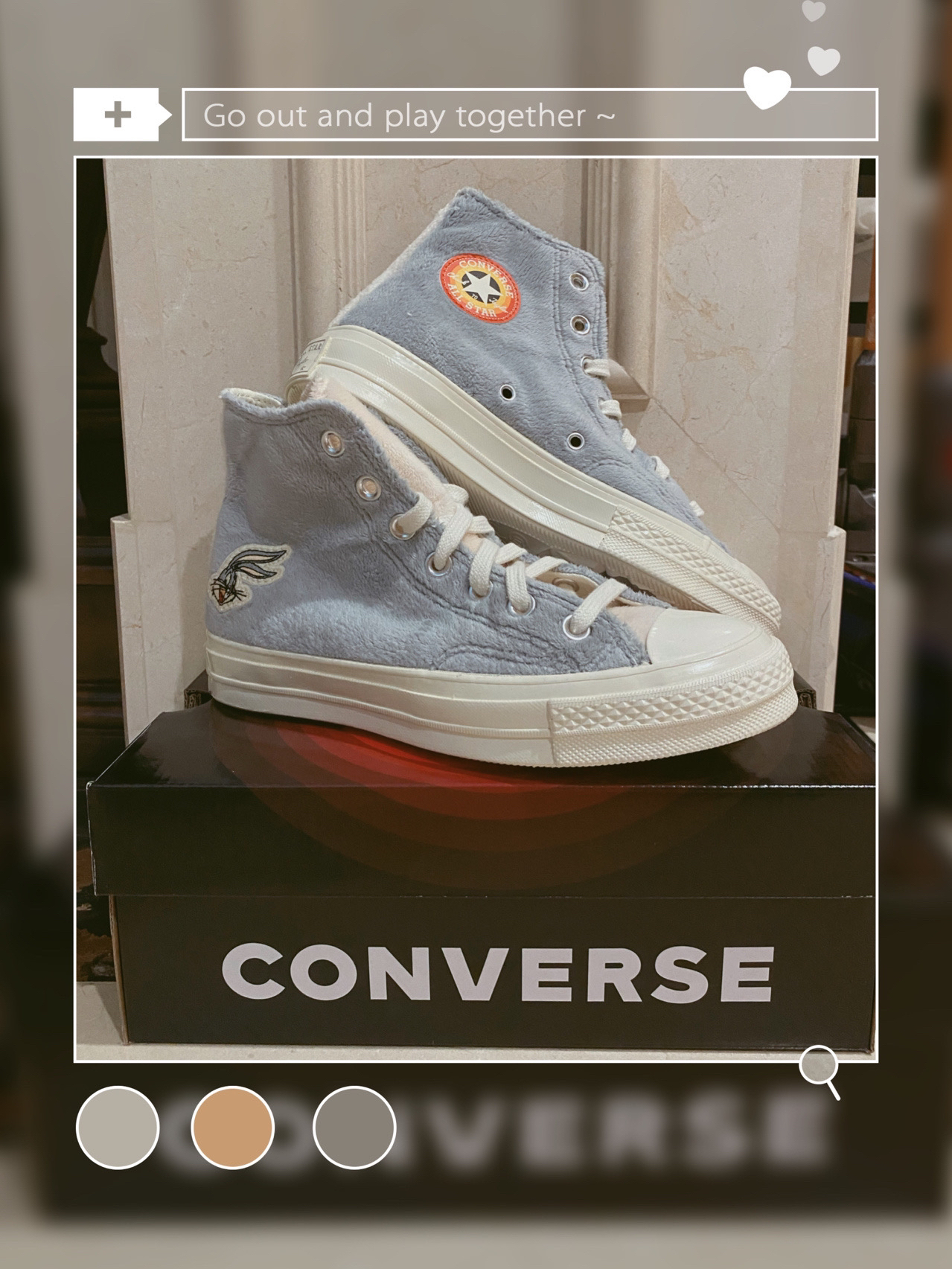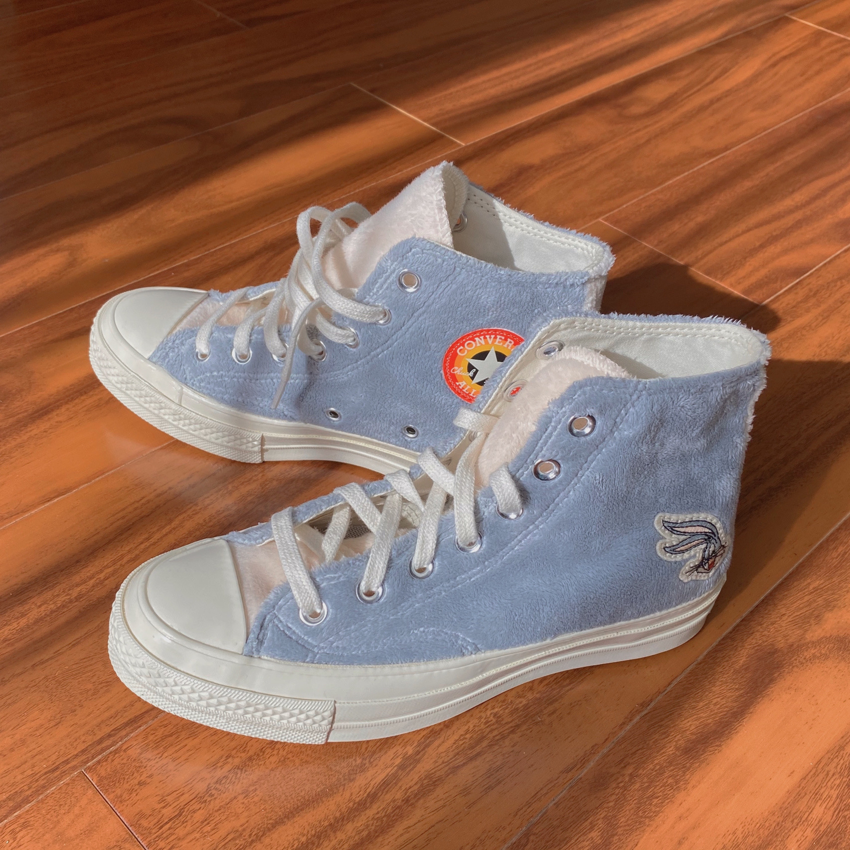 新出的这双兔八哥真是太心水了,而且颜色也超级秋冬!!超级百搭啊!!!毛茸茸的材质加上灰白的高级配色特别好看!看见它都炒鸡治愈感觉自己就是无敌小可爱啊! +在小程序看到第一眼就爱 上毫不犹豫的去拿下了! +这个毛绒的质地真的良心了,质感看起来超级好,橘红色的鞋标在阳光下不要太好看哦,这双奶香奶香的匡威值得拥有,不用再为冬天没有温暖好看的匡威穿发愁了!姐妹们冲鸭!