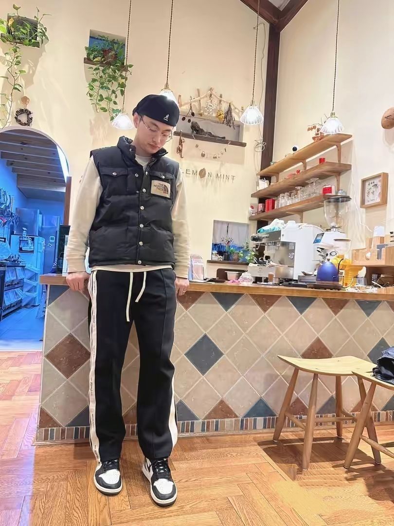 穿搭公式:羽绒马甲+休闲卫裤+黑白AJ 这款羽绒服填充的羽绒很厚实,很保暖,第一次穿的时候会有一种胖胖的感觉,但是没关系,慢慢的就会好很多 由于马甲是黑色的,建议里面搭配白色或灰色的内搭,增加整体的层次感