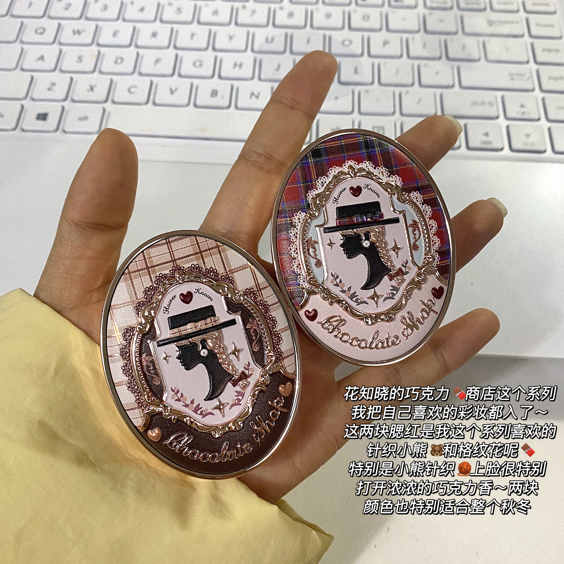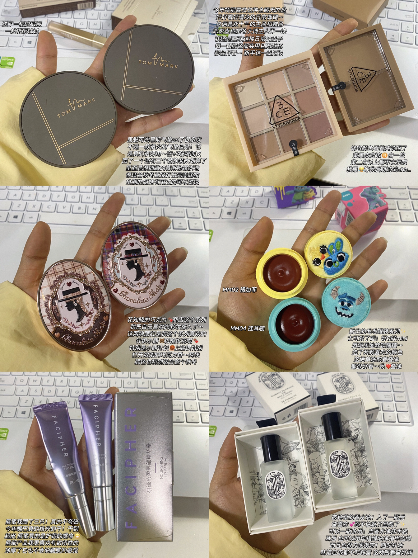 都是愿意回购的宝藏单品🍫 最近拆拆拍拍~整理年底 真爱好物和大家一起分享🎁 - 1.唐魅可慕斯气垫 2.3ce眼影/修容 3.花知晓巧克力商店腮红 4.into you 毛毛派对唇泥 5.研译唇蜜 6.te香水油