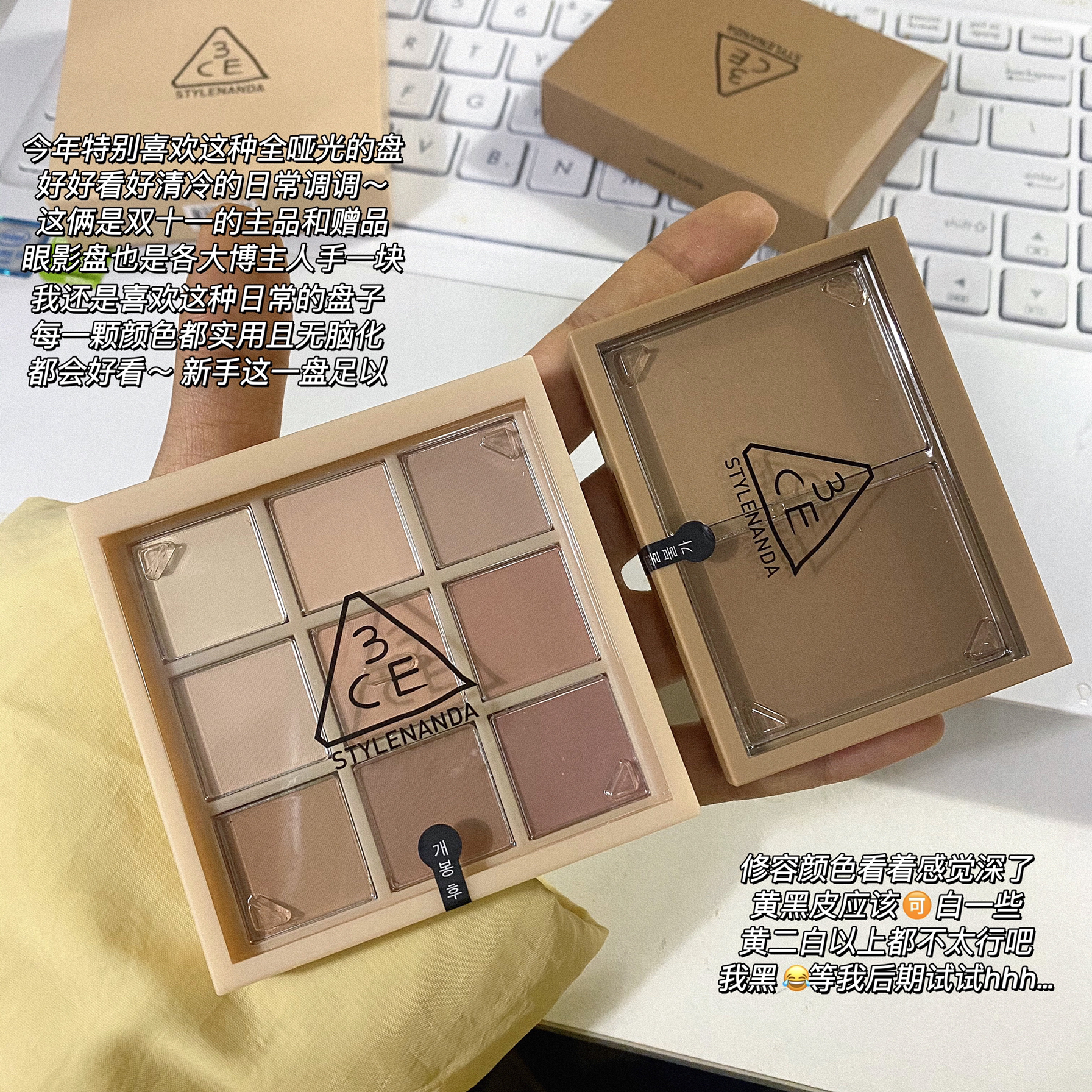 本篇笔记关联了3CE/三熹玉 细腻易上色九宫格眼影盘 哑光细闪九色纷呈 裸棕哑光盘SMOOTHER 8g、3CE/三熹玉 双色修容盘 哑光 8.6g 灰棕色ASH BROWN、INTO YOU 心慕与你毛毛出没唇颊两用唇泥 5g MM04挂耳咖等商品,为用户提供真实的使用体验和购买参考。