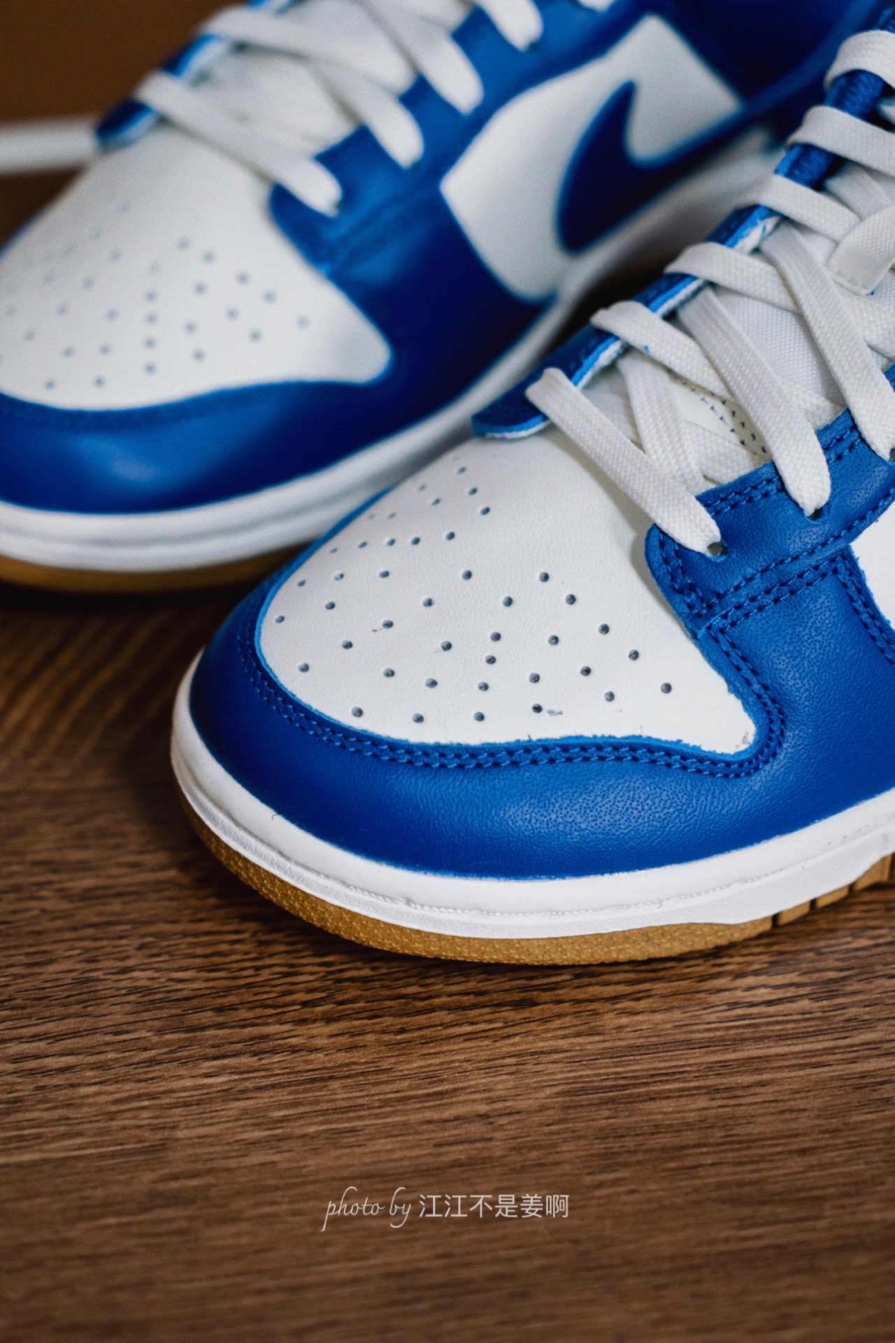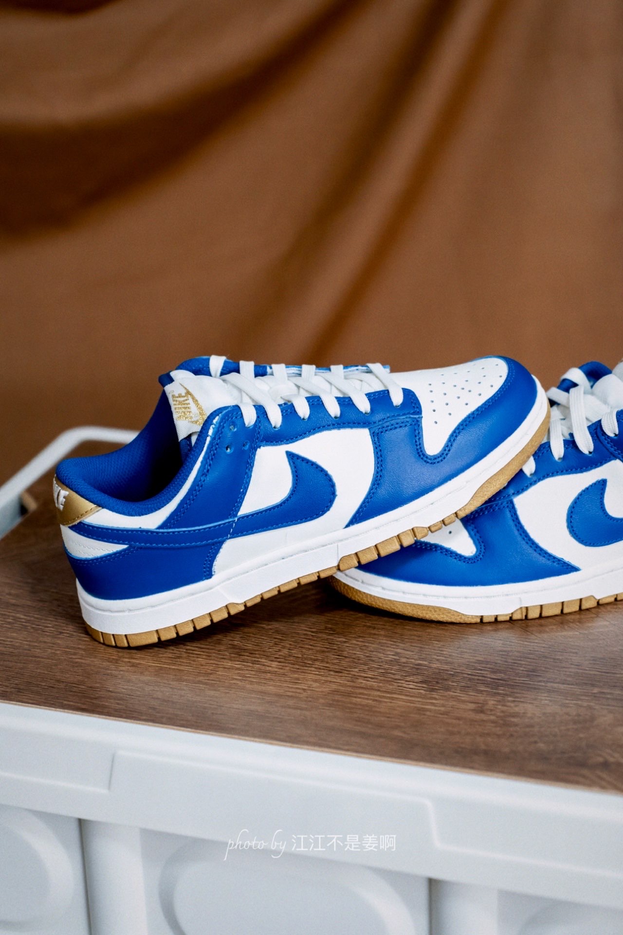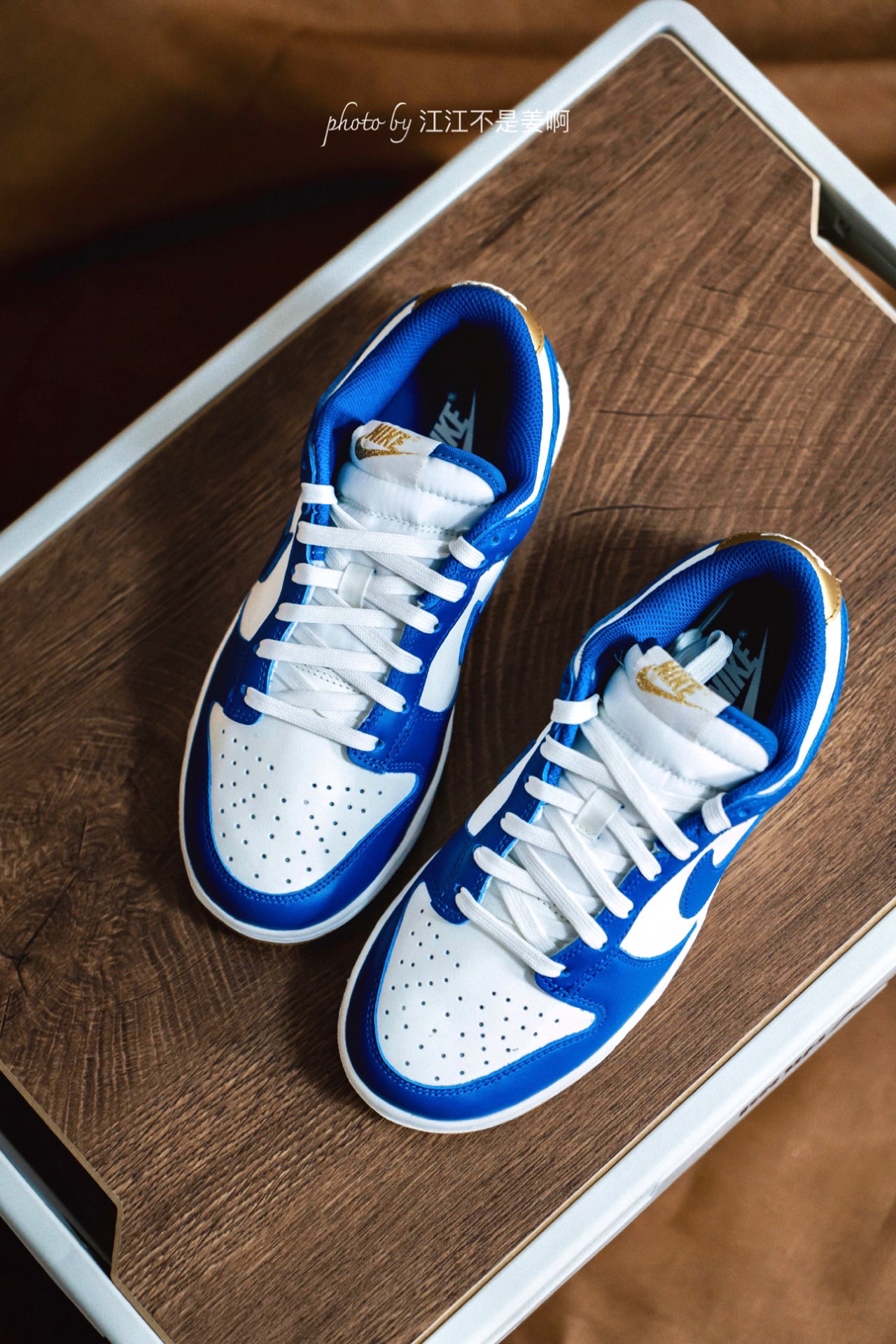 哈喽大家好,来看看今天江江分享的是什么鞋子? 今天分享一双非常耀眼的蓝白金配色Dunk,这双Dunk的配色我非常喜欢! 经典的皇家蓝白色组合,整体与那双白蓝肯塔基区别不大,不过在后跟及鞋舌处选择了金色进行点缀,鞋底也换成了胶底。 价格合适的话对于之前错过没有入手的鞋友的们来说可以考虑。 这双鞋整体颜值相当高,白蓝为主,金色作为点缀为辅,可惜是一双女鞋,没有我的码,也算是女生福利了,喜欢的女生千万不...