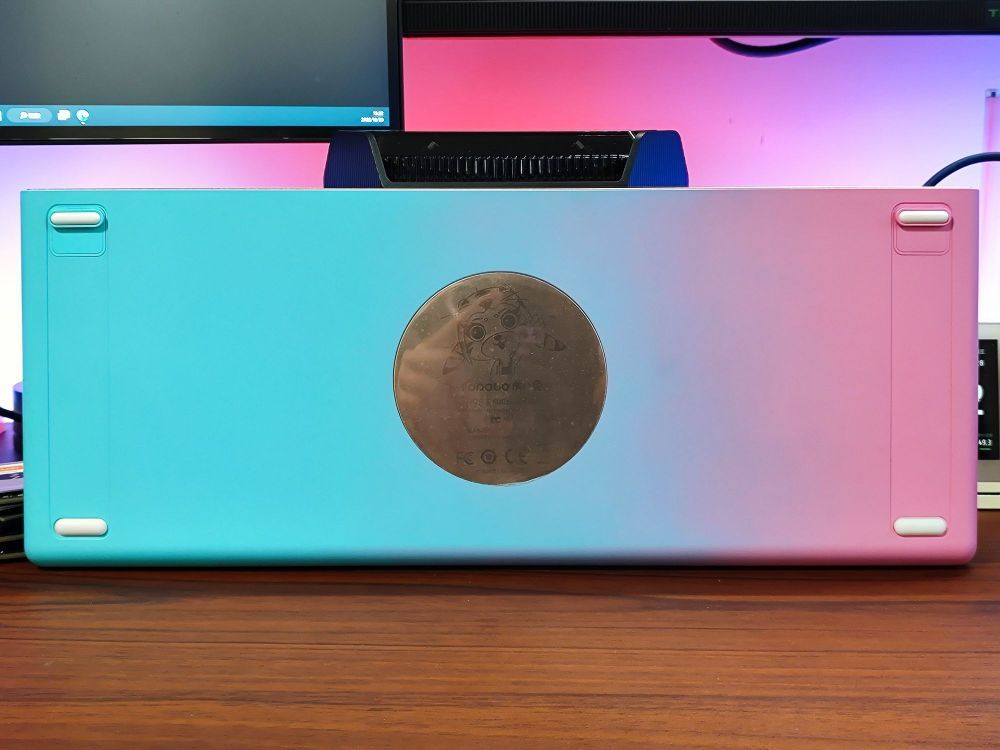 H98配列选择目前最火之一的980,整体尺寸和按键数量兼顾的比较好,结构依旧是Gasket,当然最亮眼的还是私模造型设计,ABS+金属贴片组合的底壳相当漂亮,底壳还是红色到蓝色的渐变设计,同时状态显示灯也移到数字区与主键区中间,实用性和颜值都表达的不错。