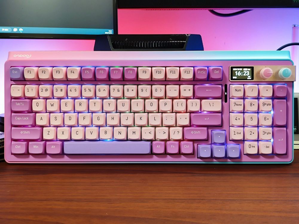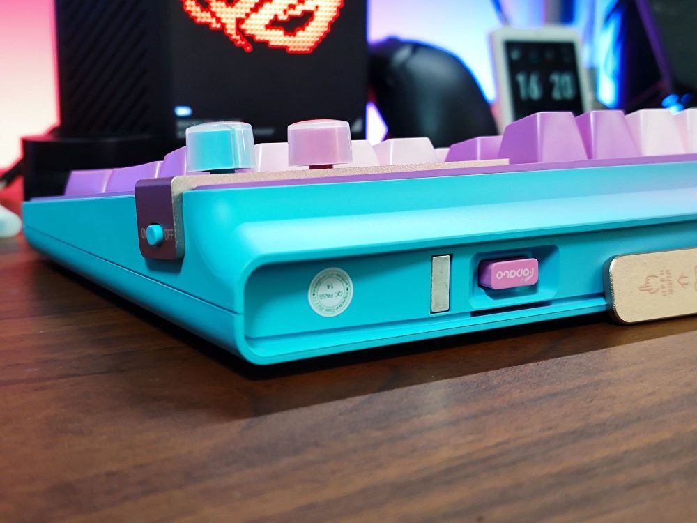 硬件方案上还是贝盈+TTC全家桶的稳健组合,主键为TTC快银v2,全键支持五脚热拔插,支持有线+蓝牙+2.4G三模连接,右上角带支持自定义的1.14英寸显示屏,同时还有两颗独立旋钮,分别对应连接模式切换和音量调节/播放暂停。