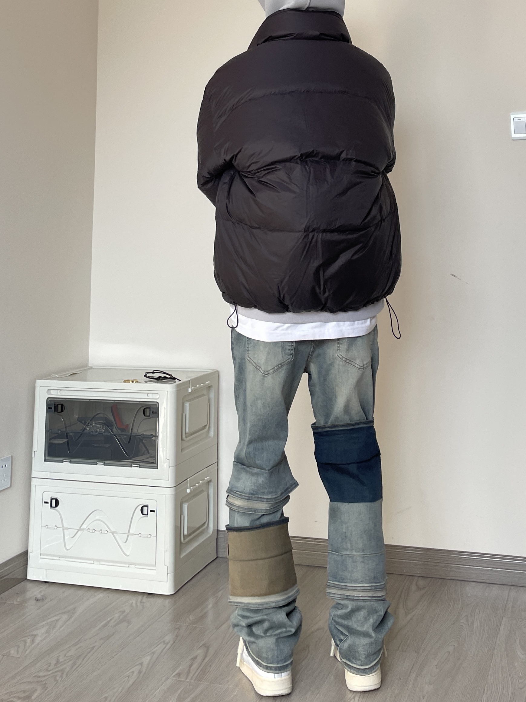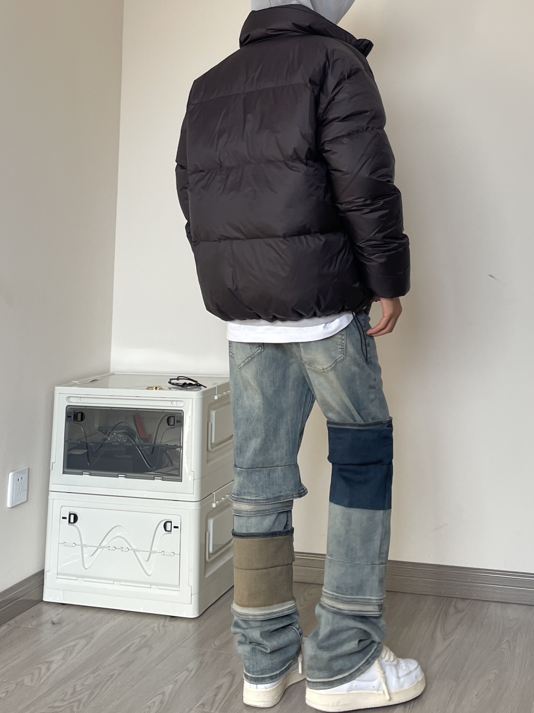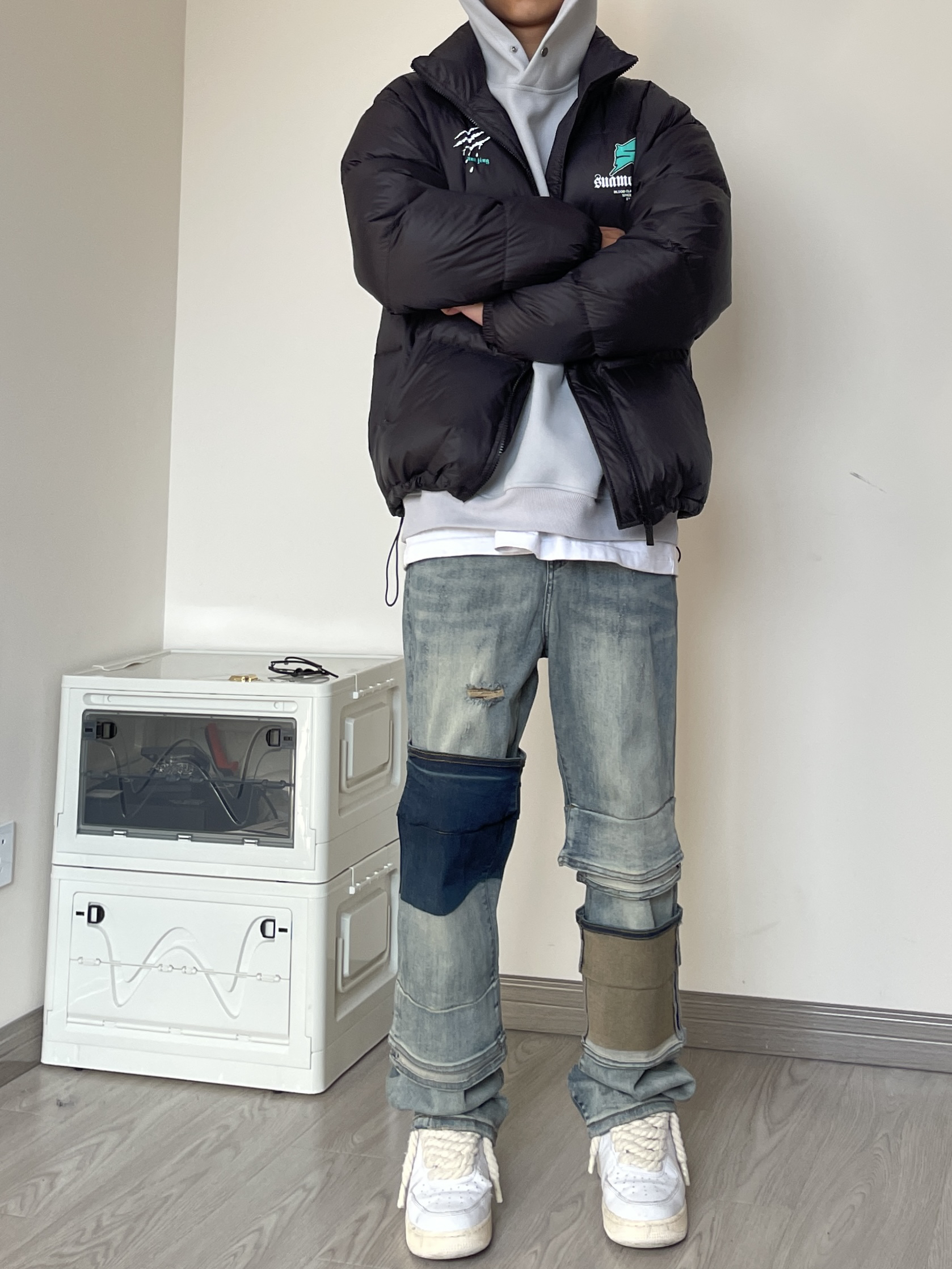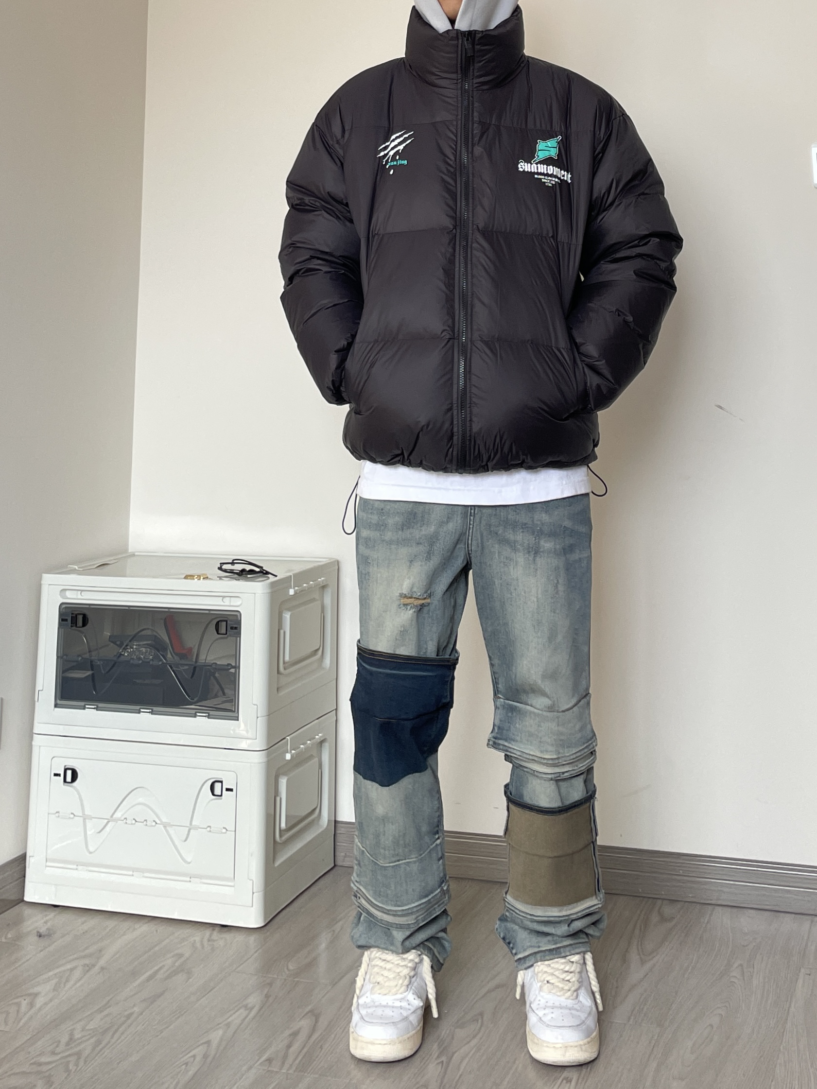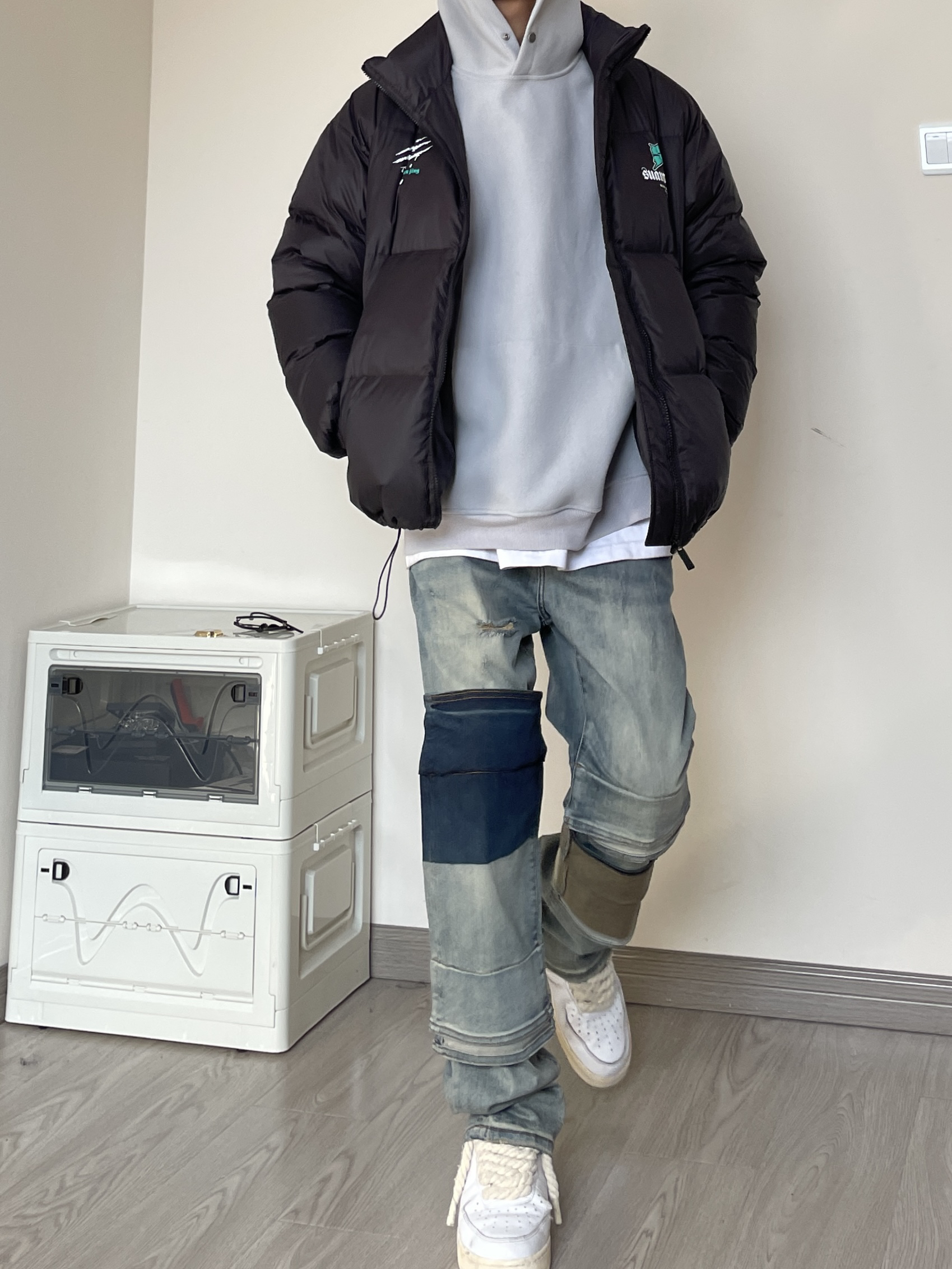 👔 外套是来自suamoment的立领宽松羽绒服,整体宽松版型,选择了一件基础配色,整体黑色搭配胸口处的LOGO小印花点缀。 内搭了一件纯色帽衫提亮。 👖 来自新因素的拼接牛仔裤,这条裤子经常上身了,直筒版型,裤腿的拼接处可随意翻面,可玩性很高!推荐! 👟 AF1