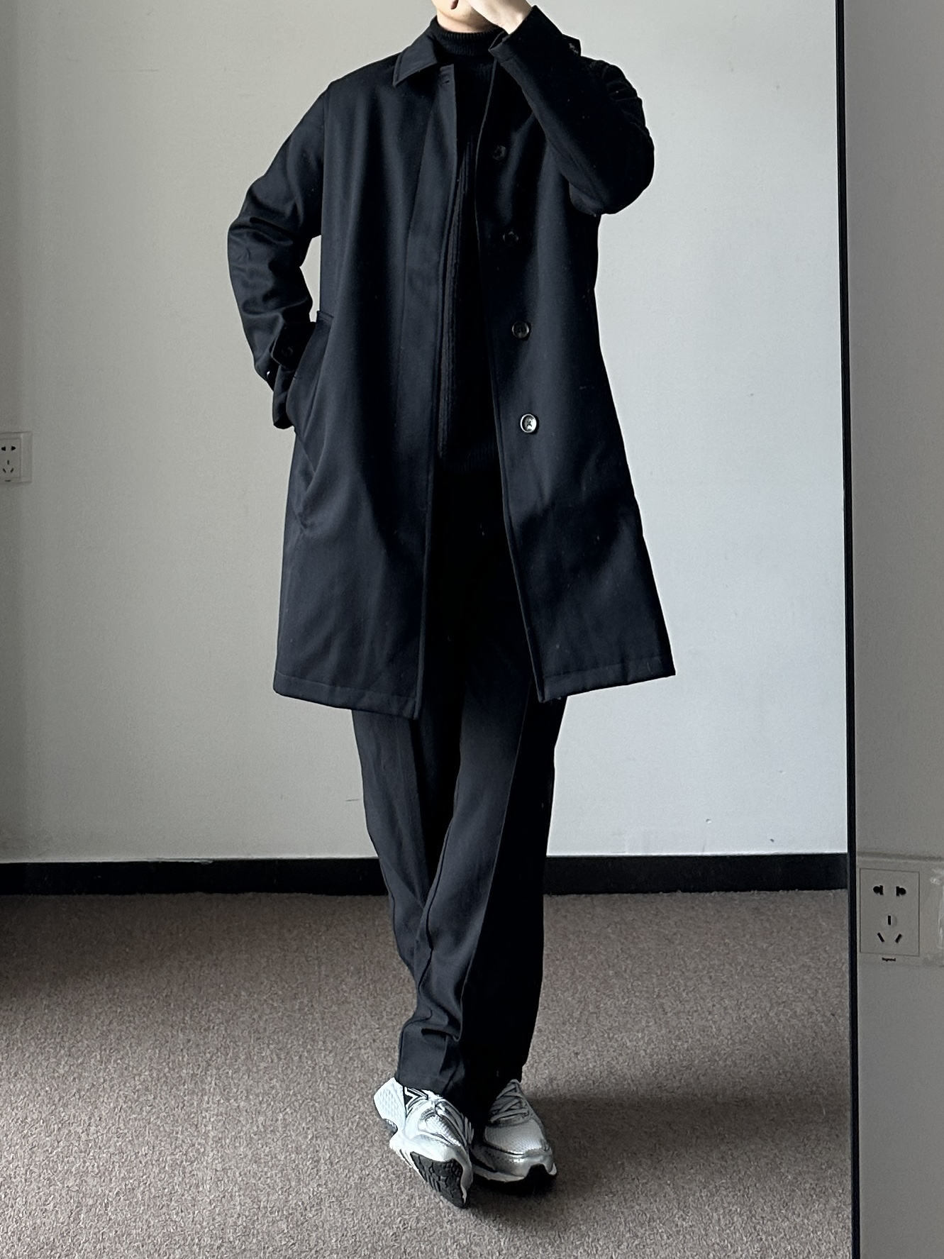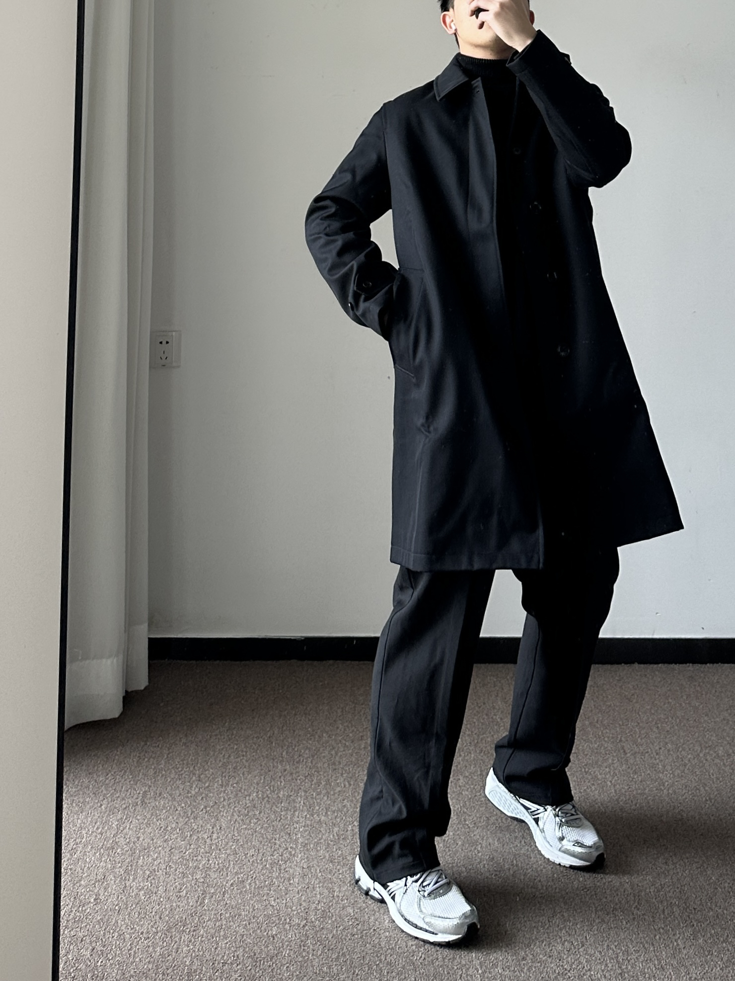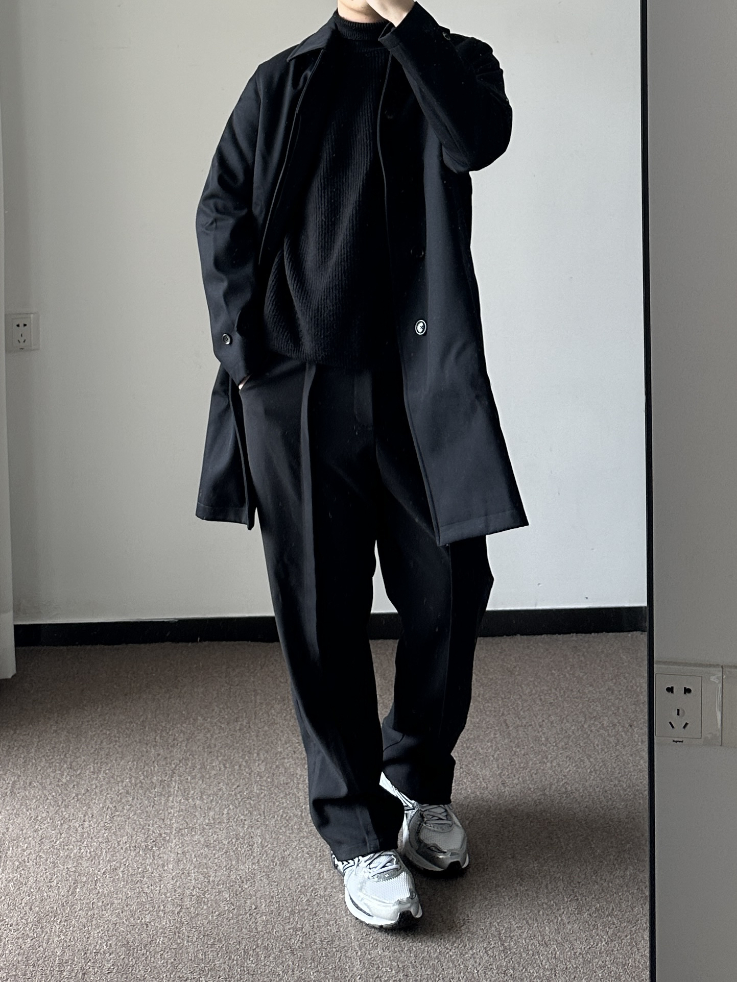 素人也能好看系列~174cm / 65kg 🧥- 英味的高密羊味外套大衣,面料比较坚挺,可以当个风衣穿,上身M。内搭高领毛衣,简约即高级穿法! 👖- 折线立体剪裁西裤。 👟- NB 860