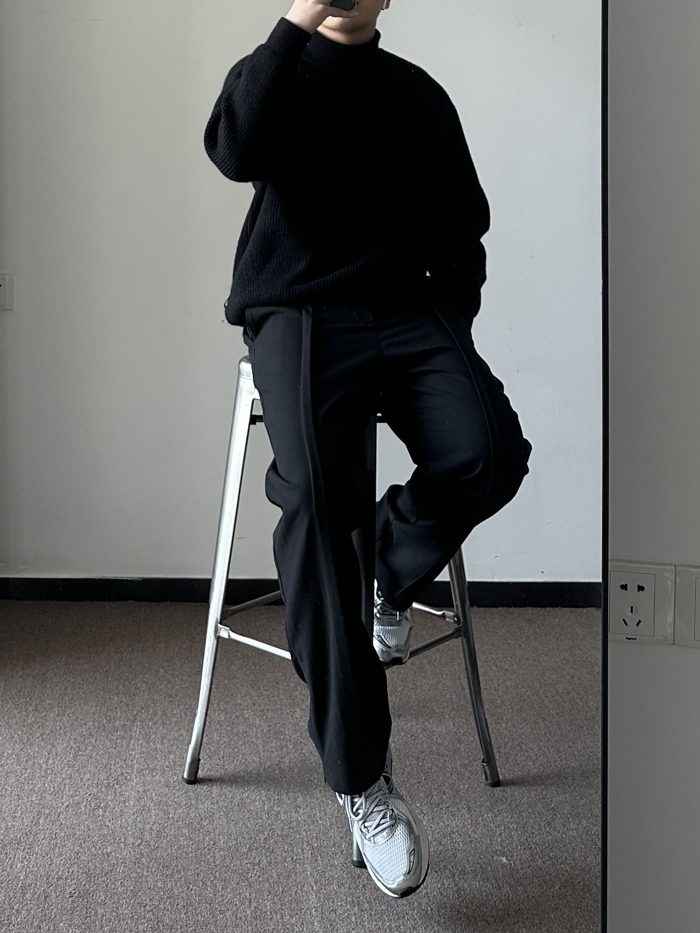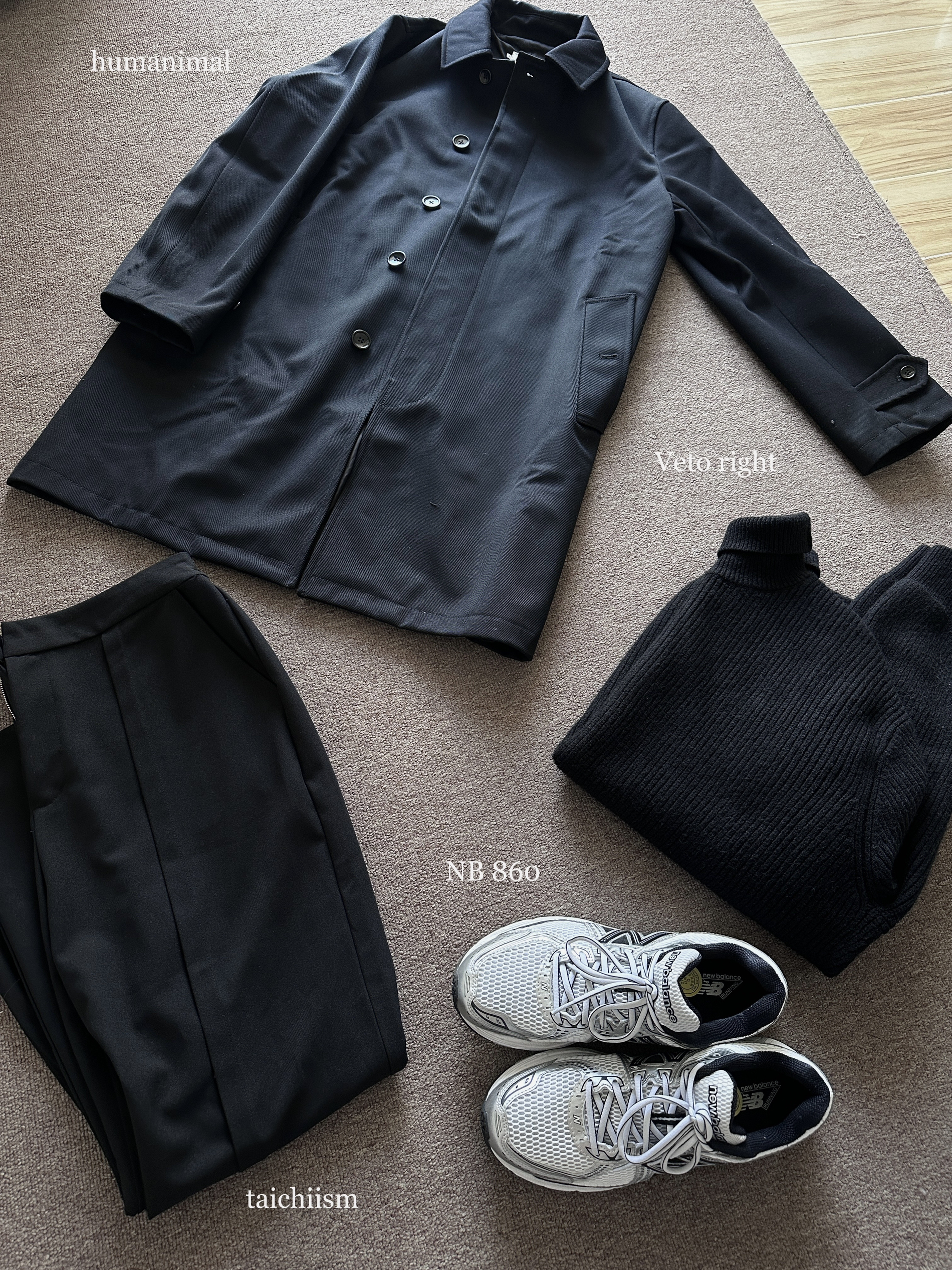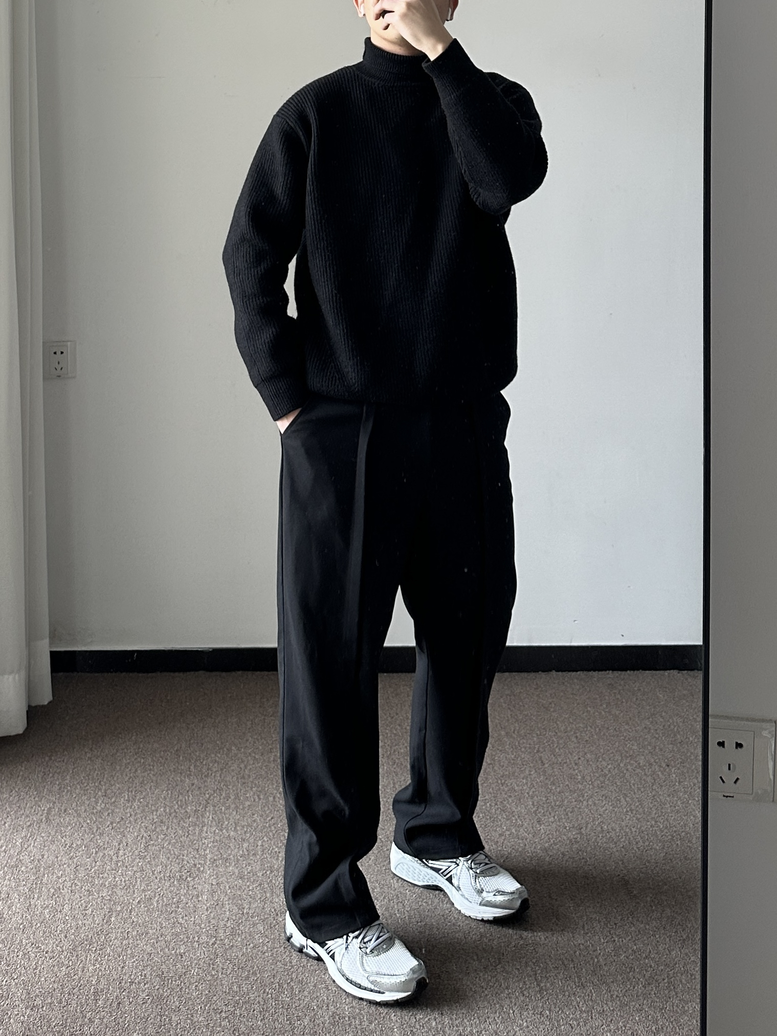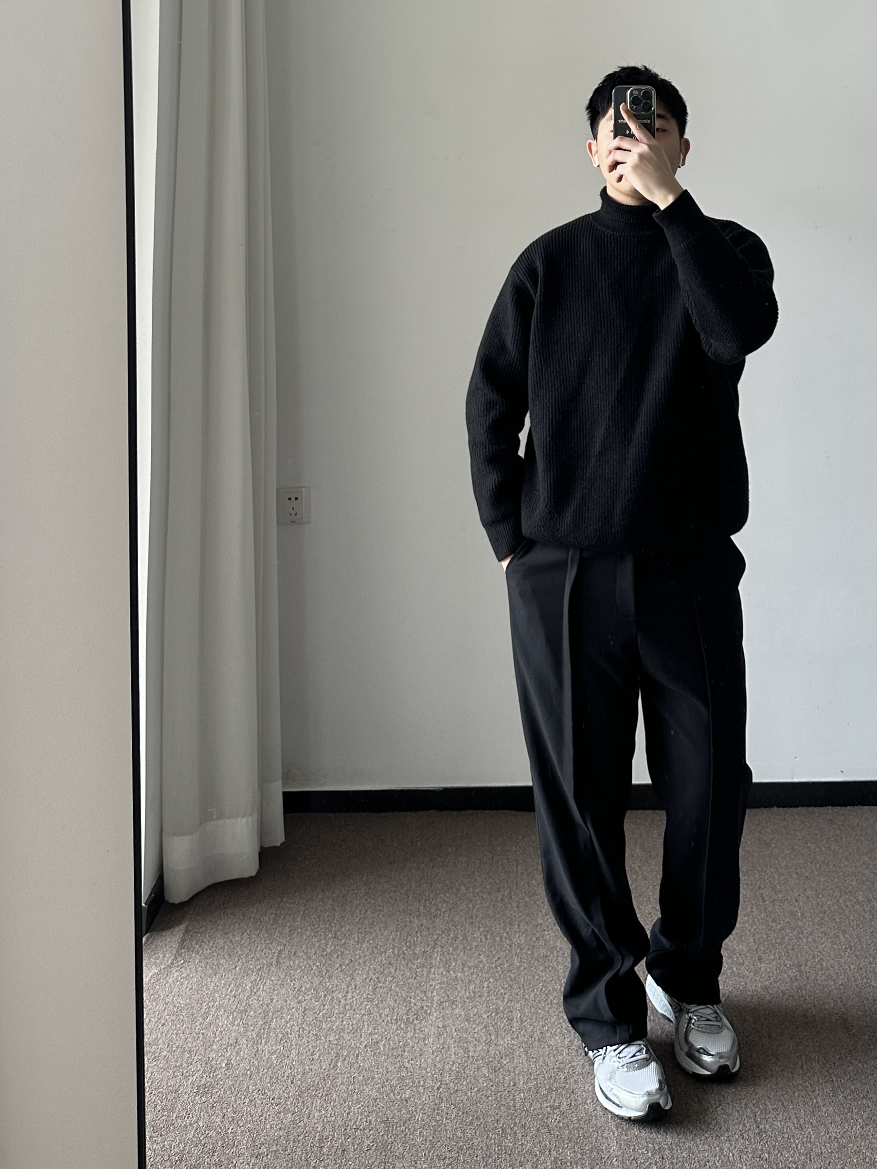 素人也能好看系列~174cm / 65kg 🧥- 英味的高密羊味外套大衣,面料比较坚挺,可以当个风衣穿,上身M。内搭高领毛衣,简约即高级穿法! 👖- 折线立体剪裁西裤。 👟- NB 860