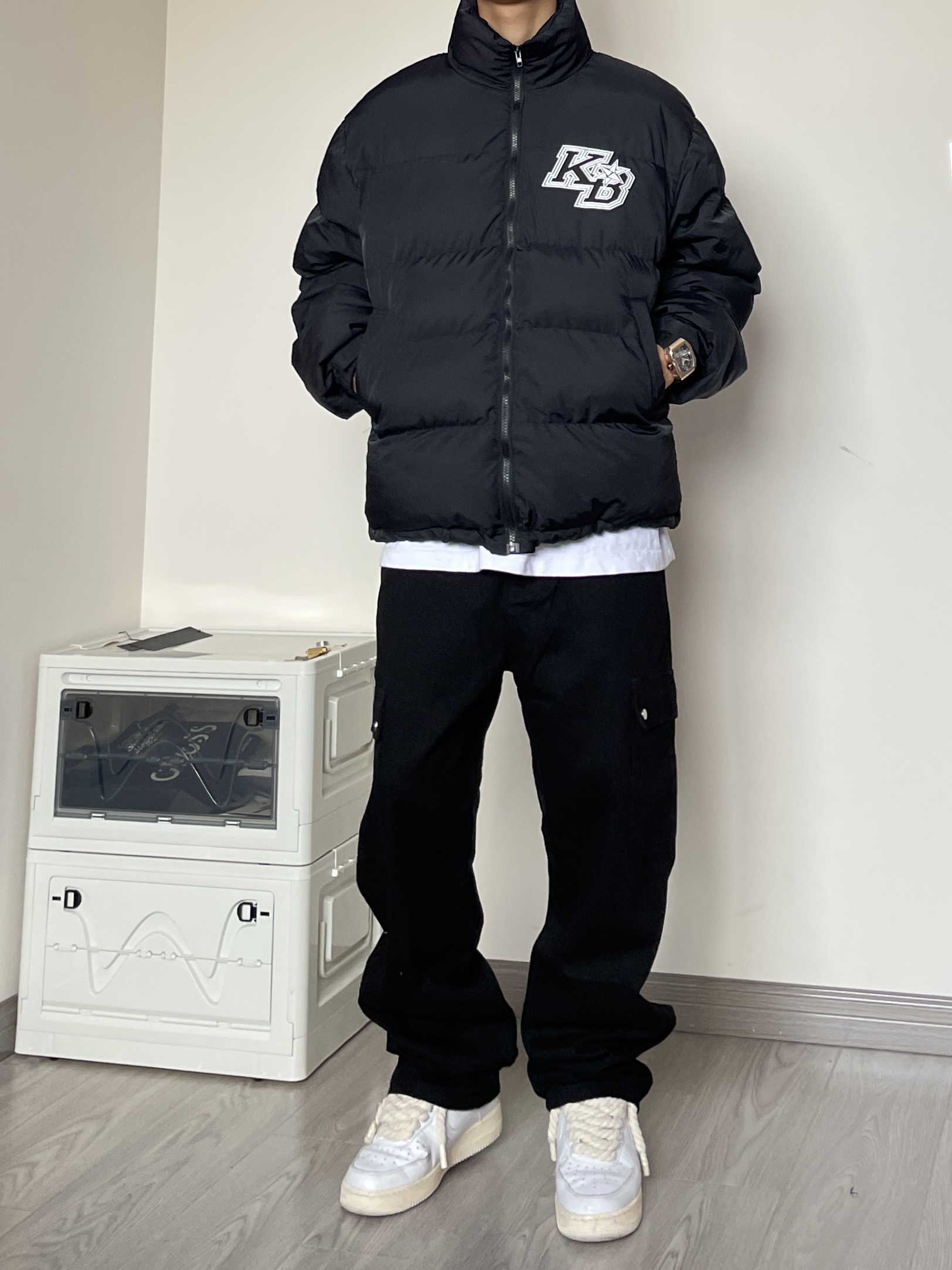 👔 外套是来自打怪juvenile的面包服,基础的版型日常百搭,胸口处和后背的印花也蛮酷。 👖 来自APS的工装长裤,两侧有两个大口袋设计,直筒版型,裤腿的堆积感也刚刚好。 ⌚️ 今天的配饰来自CERIEPON凯珀的星舰计划系列,黑色表带搭配金色表盘,质感十足!底盖高清镀膜,可以看到机芯运作,机械感满满。 👟 AF1