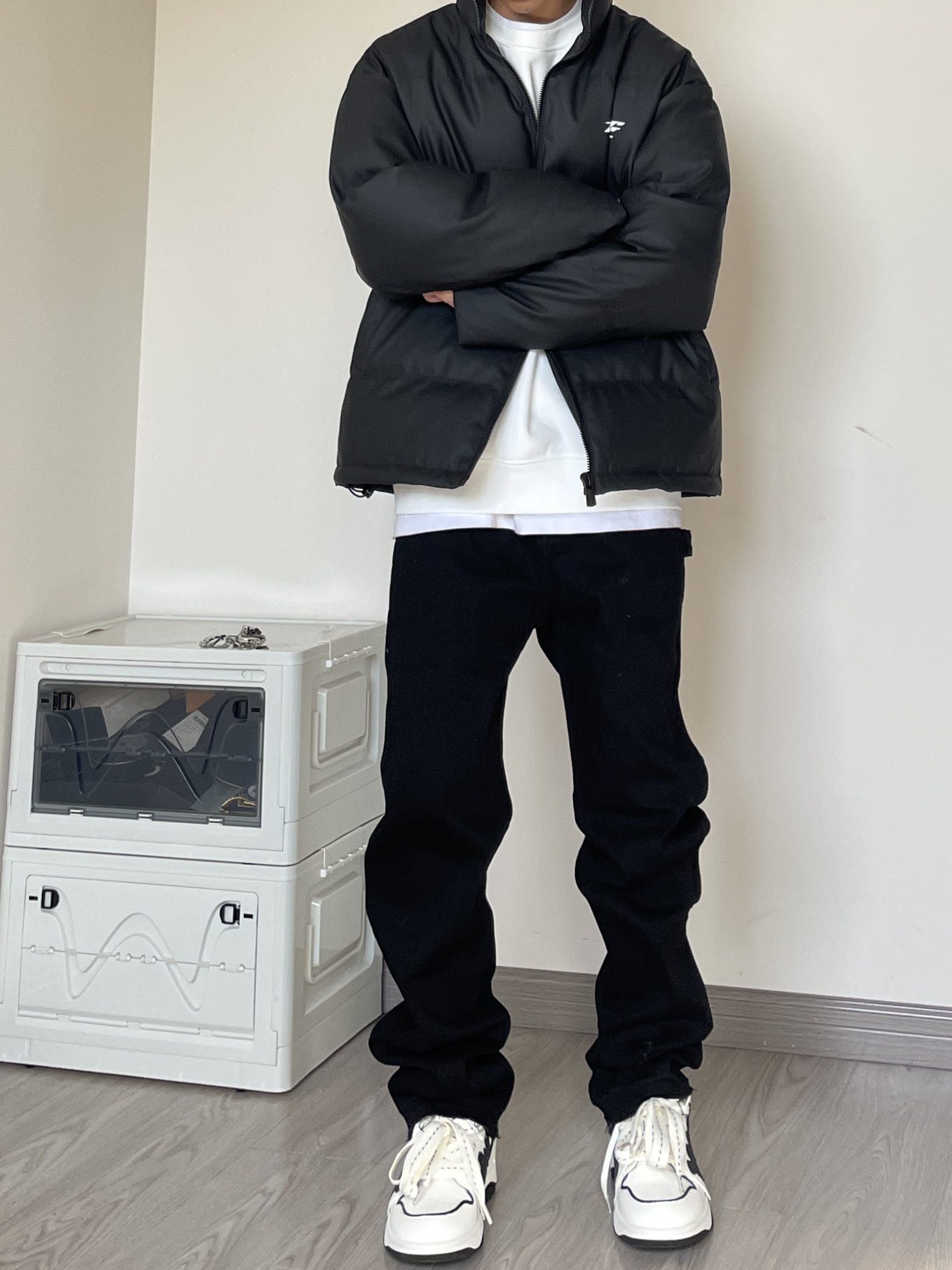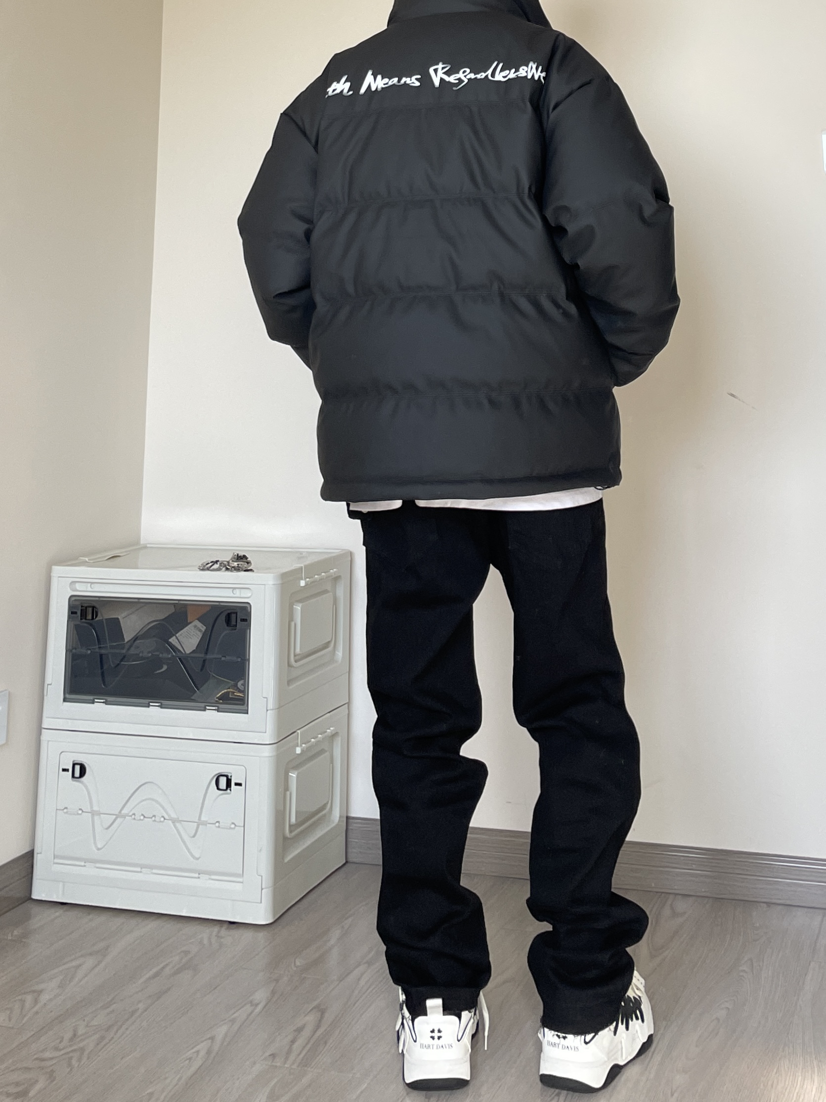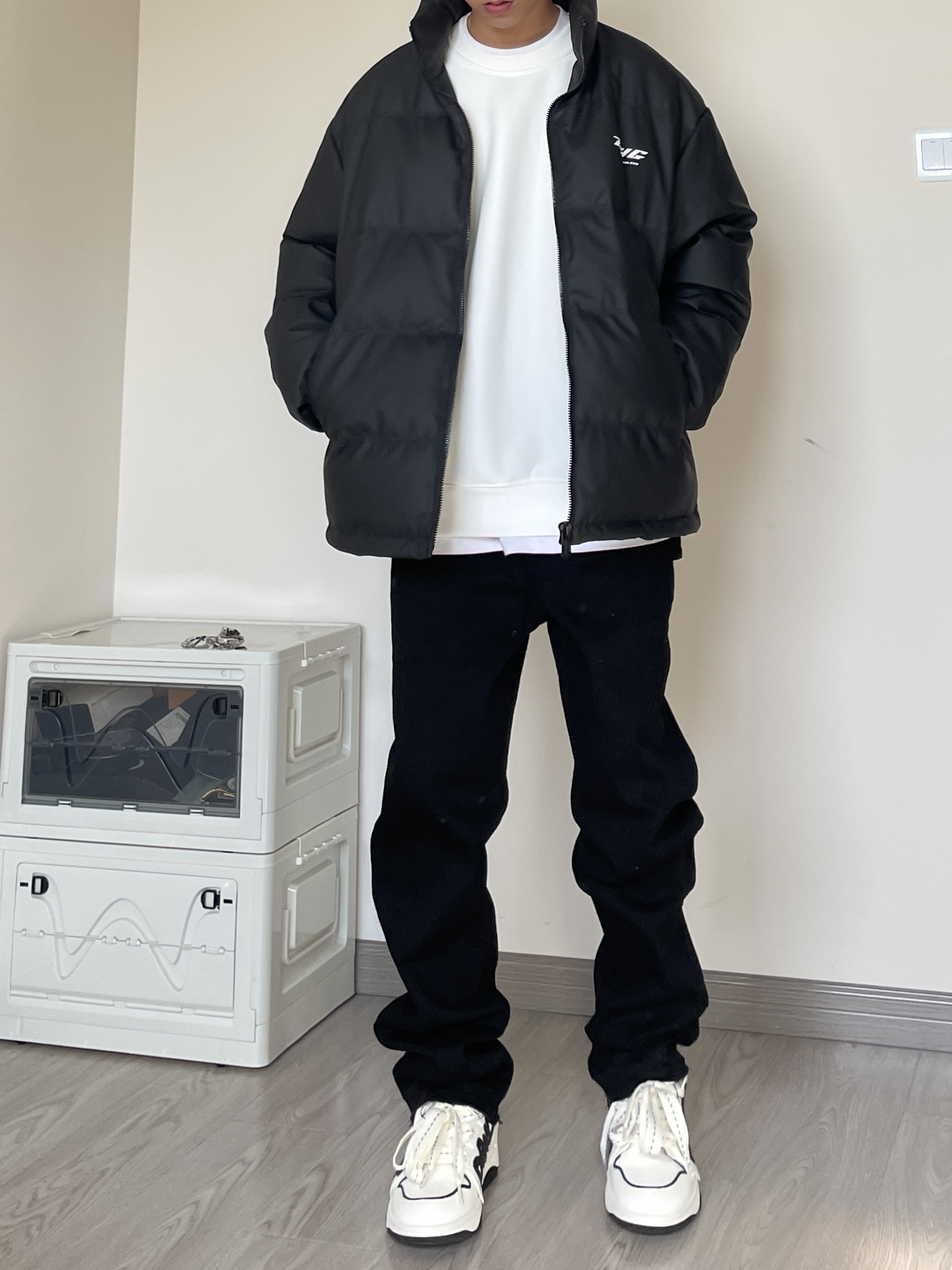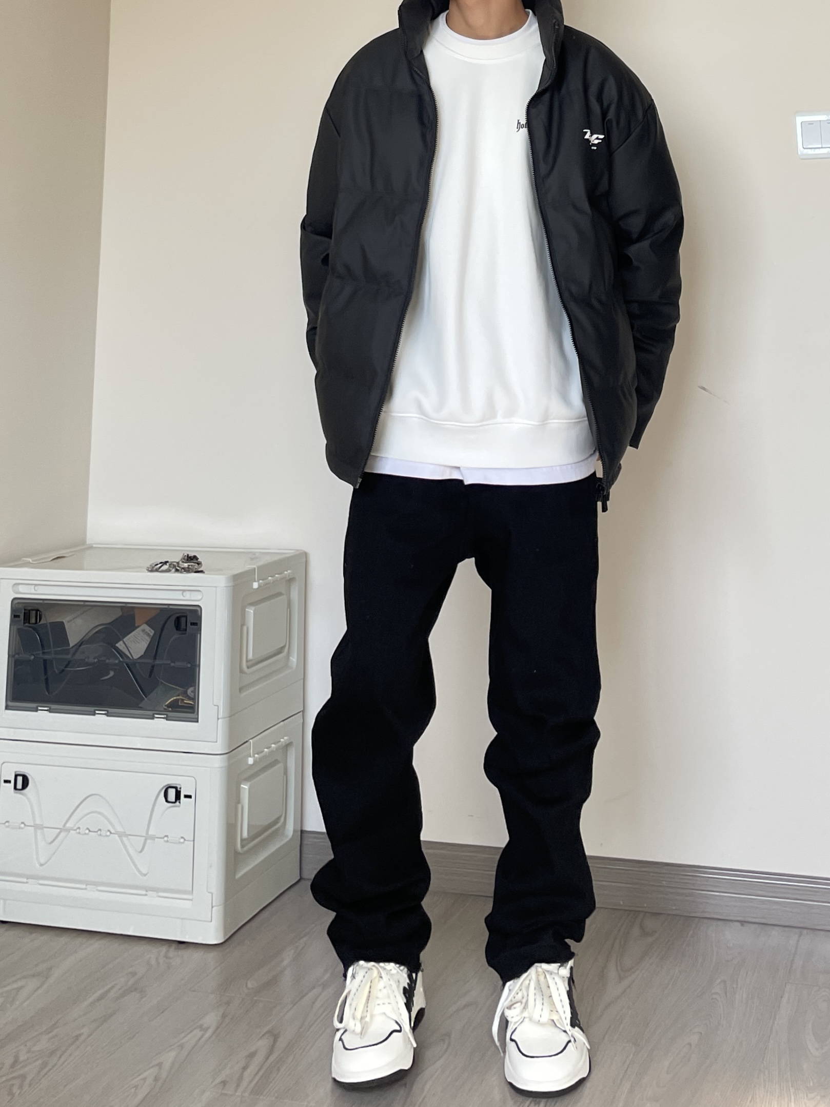 👔 上衣是来自BJHG的面包服,比较基础的款,百搭就玩了! 👖 裤子是来自Unknowtal的直筒牛仔裤,也是最基础百搭的版型,纯黑配色随意搭配。 👟 赫德.戴维斯