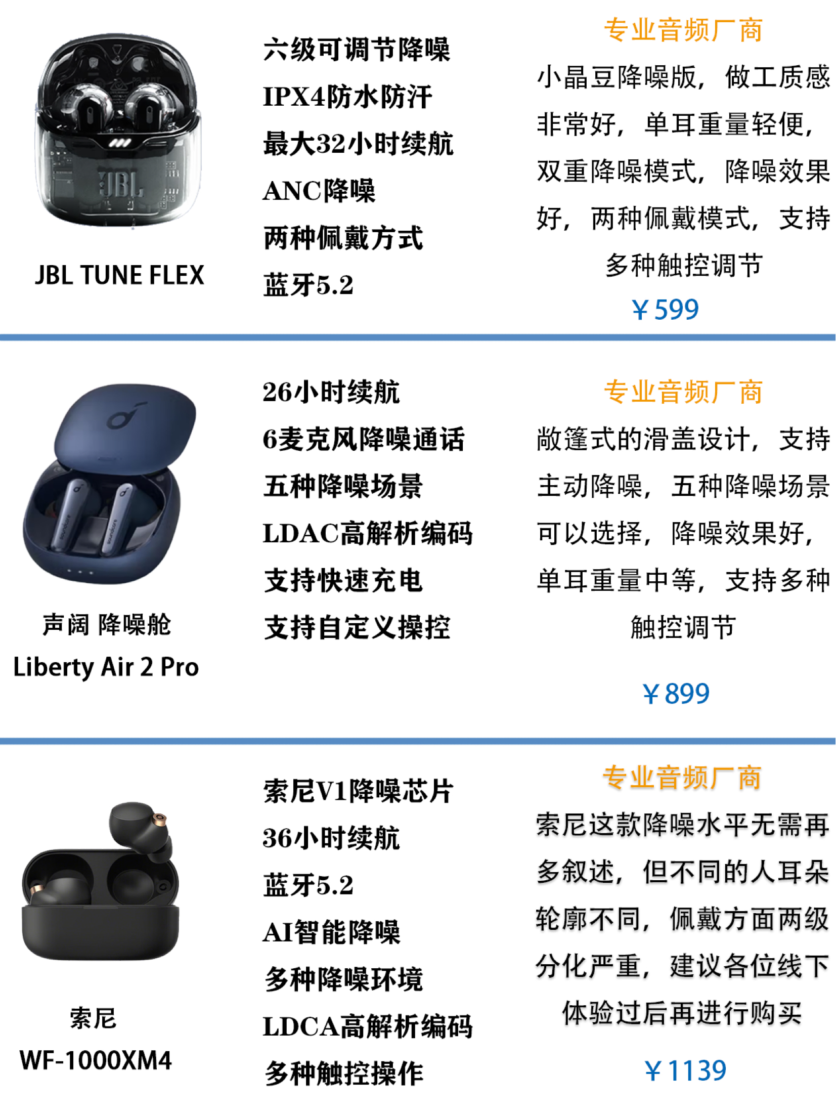 本篇笔记关联了Sony/索尼 WF-1000XM4 入耳式 蓝牙 耳机 真无线 安卓系统 触控面板 舒适 降噪豆 铂金银、soundcore/声阔 Liberty Air2 Pro 入耳式无线蓝牙耳机 主动降噪 降噪舱 TWS 黑色、OPPO Enco Air2 Pro 入耳式 蓝牙耳机 真无线 超长待机 长续航 主动降噪 音乐 月牙白等商品,为用户提供真实的使用体验和购买参考。