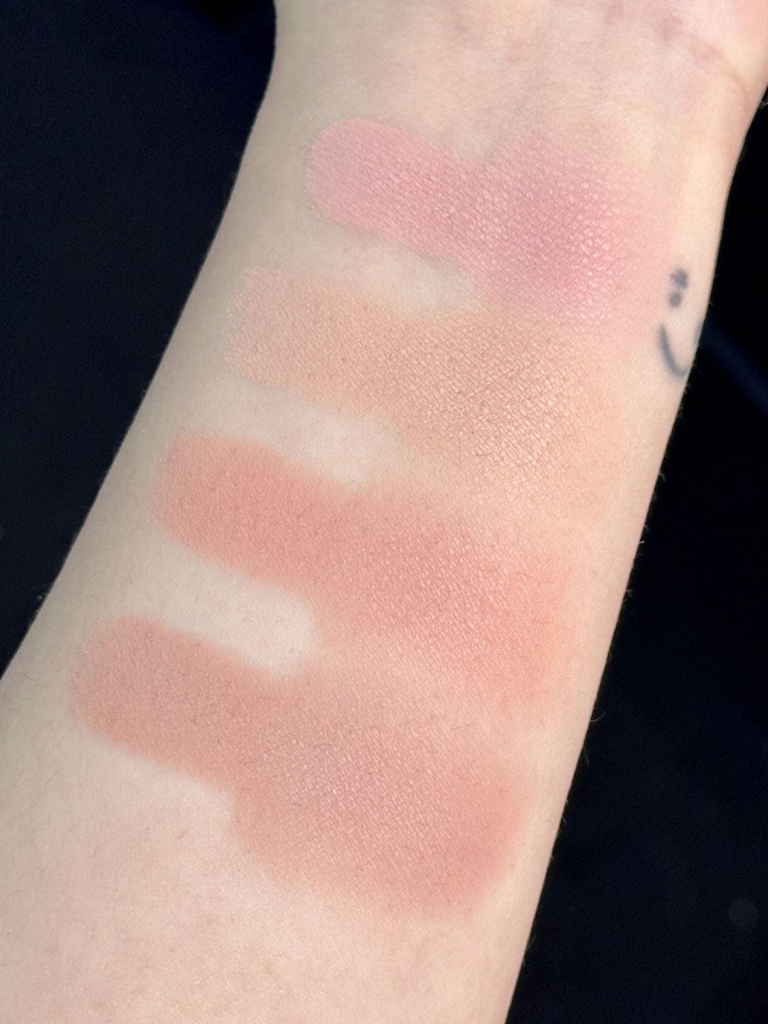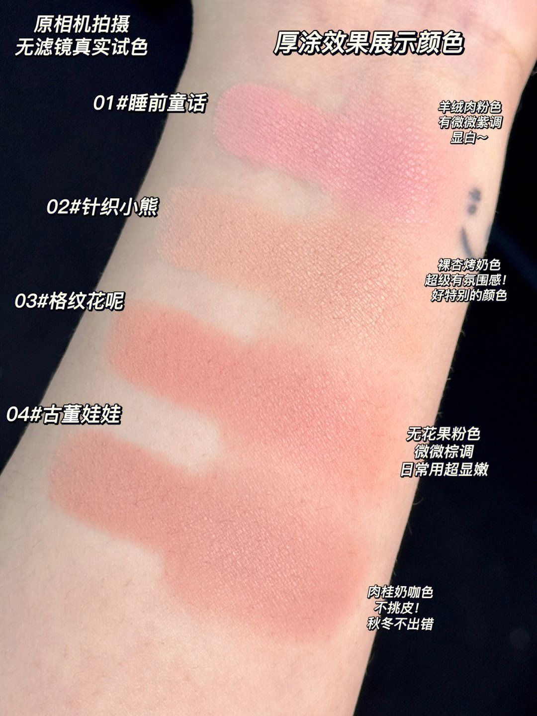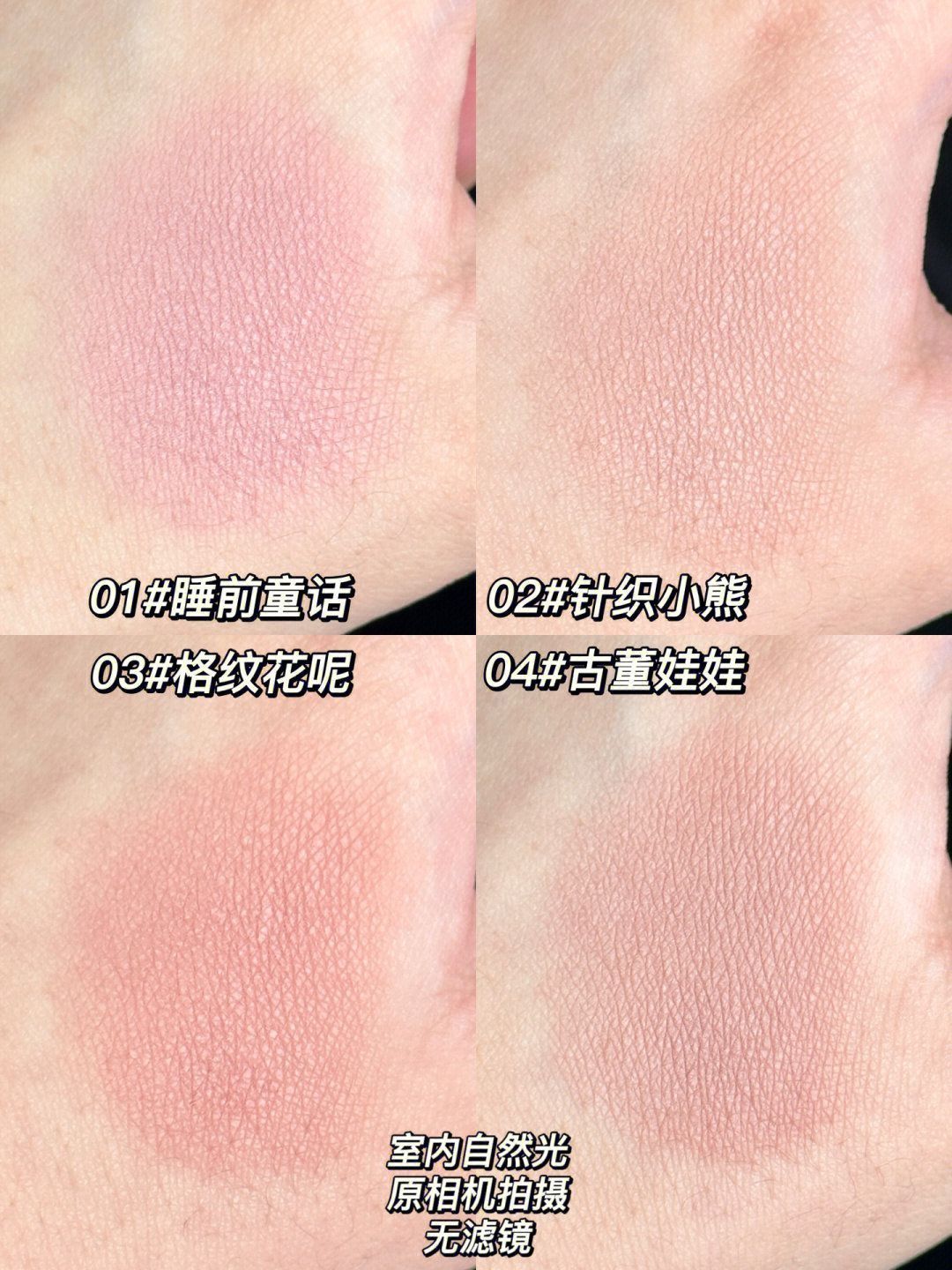 这次的腮红真的很有秋冬氛围感 粉质很贴肤!不卡不显纹~ 香味也是淡淡的 01睡前童话 带紫调的羊绒肉粉色 显白~ 02针织小熊 最特别的一块!这个颜色真的好绝 裸杏烤奶 氛围感满满 03格纹花呢 无花果粉棕色 这个系列里我最喜欢的一块 感觉非常日常百搭 轻轻扫一下 气色会很好 04古董娃娃 肉桂奶咖色 不挑皮的一块 秋冬感很足 属于黄黑皮都可以驾驭的颜色